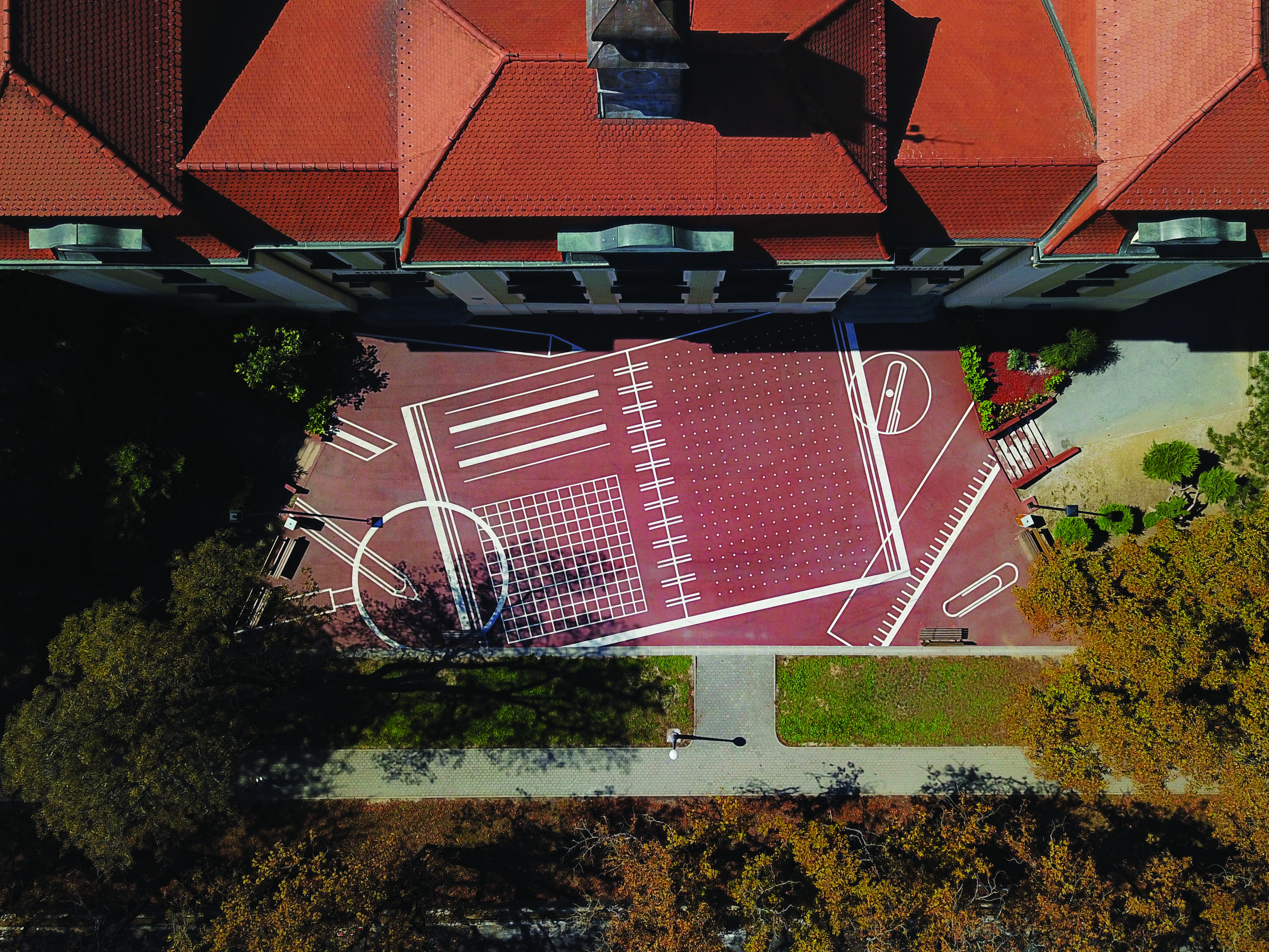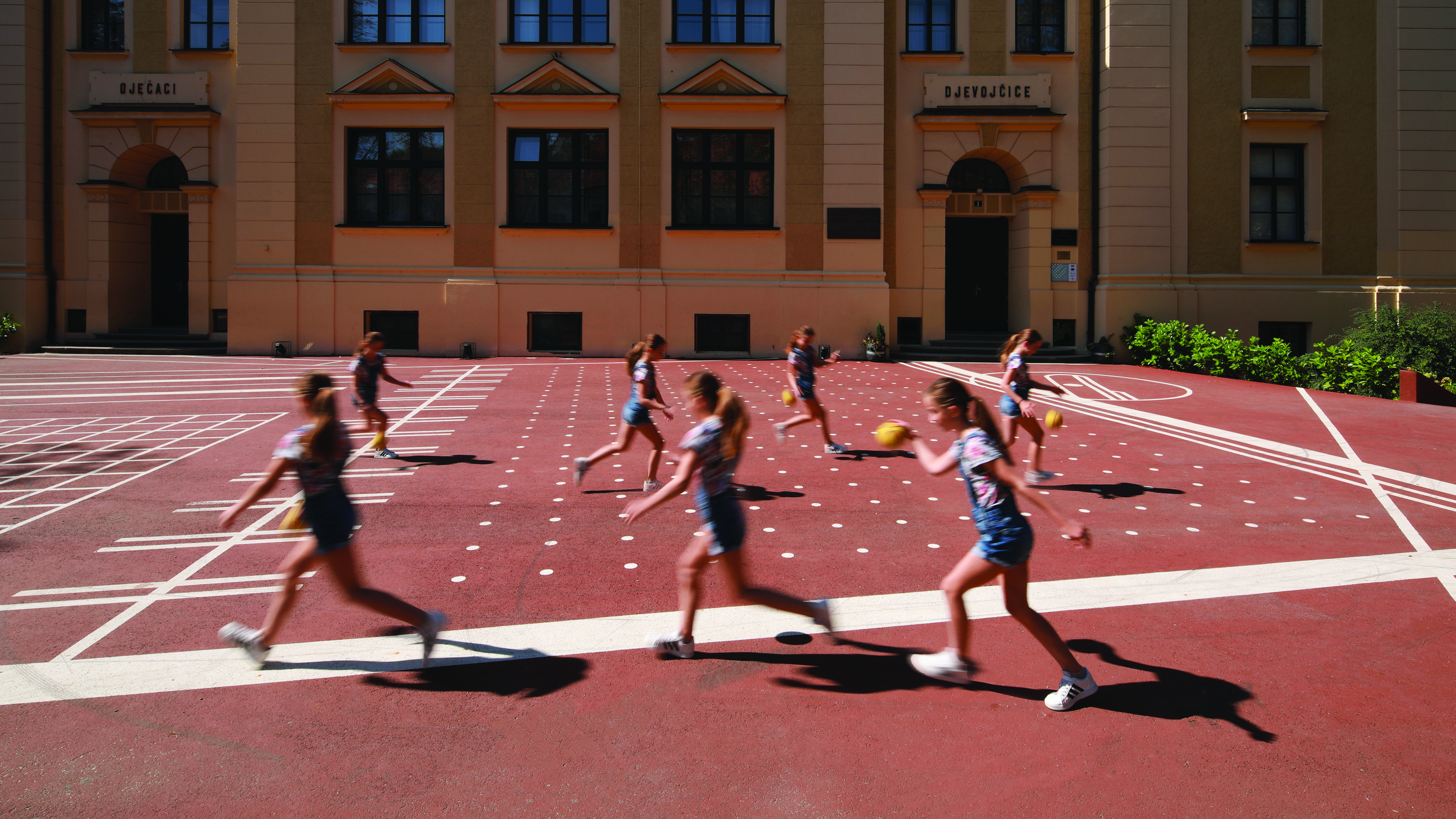 Pred simetrično historicističko ulazno pročelje položena je monolitna crvena ploha na koju je aplicirana linijska grafika. Intervencijom se potiče neformalna atmosfera i poziva na spontano korištenje. Stvara se prostorni okvir za aktivnosti na otvorenom, socijalizaciju prije i poslije nastave, te svima dostupan prostor interakcije između škole i grada.