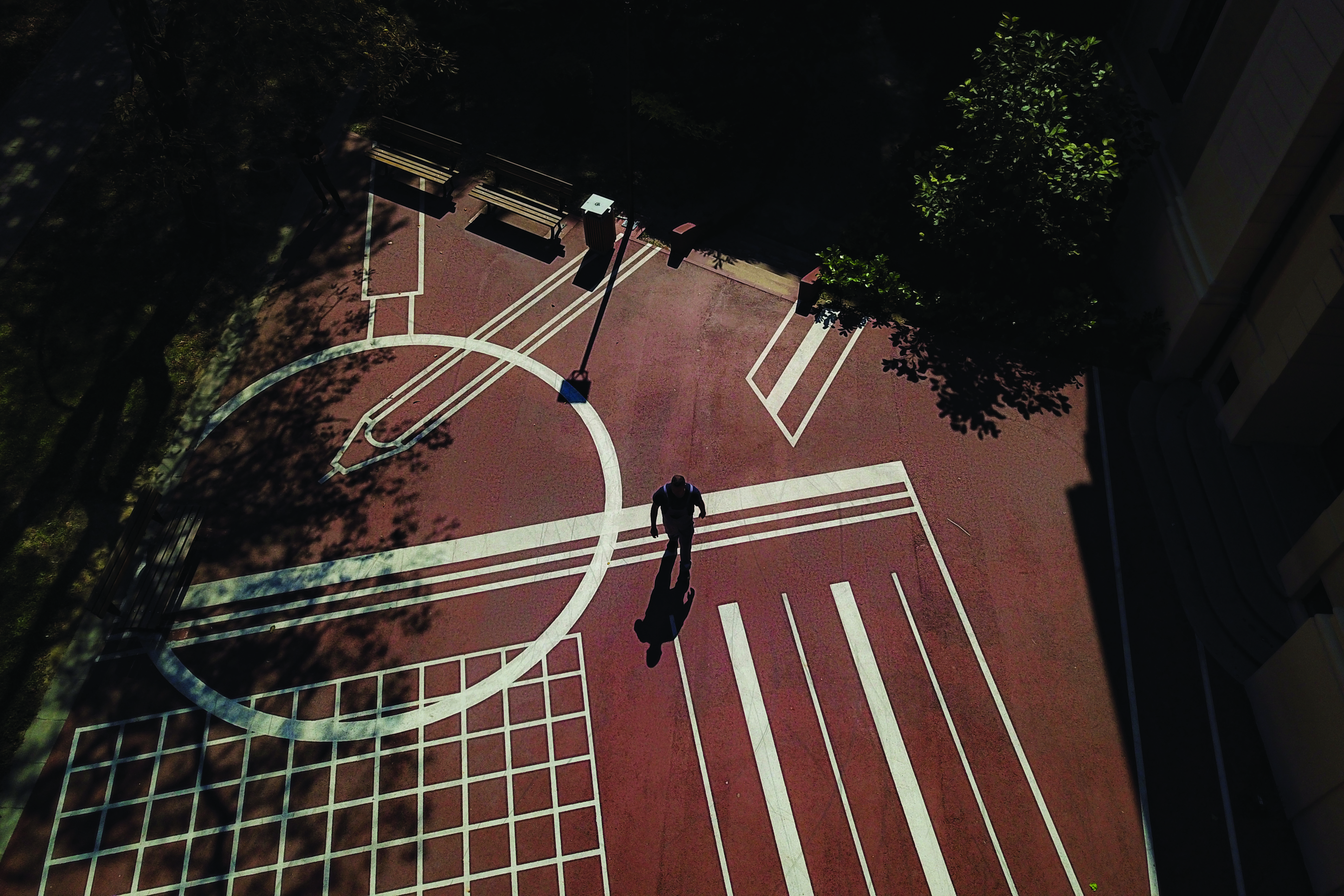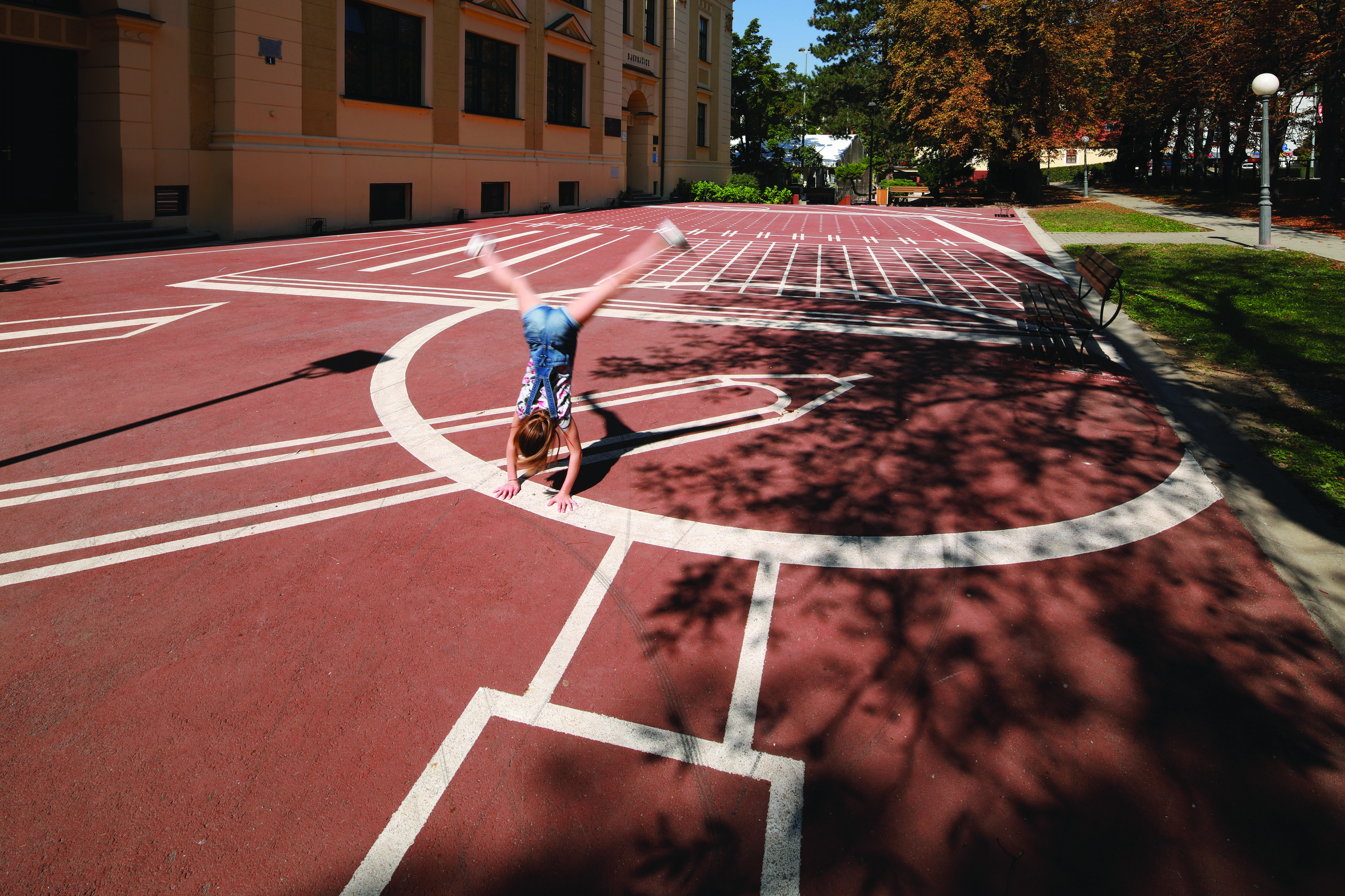 Vizual na školskom trgu s jedne strane potiče otvorenu i kreativnu igru budući da na njemu nema dodatne sportske ili druge opreme, a s druge, jasno komunicira da se radi o prostoru škole. Vizual uvećane situacije radnog stola — bilježnica, olovka, šiljilo, ravnalo, gumica, povećalo i spajalica nedvosmisleno je “školski” i kao što u stvarnosti prazna bilježnica potiče na pisanje i crtanje — u ovom uvećanom prikazu bilježnica postaje poligon koji omogućava djeci drugačije korištenje prostora za osmišljavanje novih igara koje su neopterećene prepoznatljivim vizualnim predlošcima.