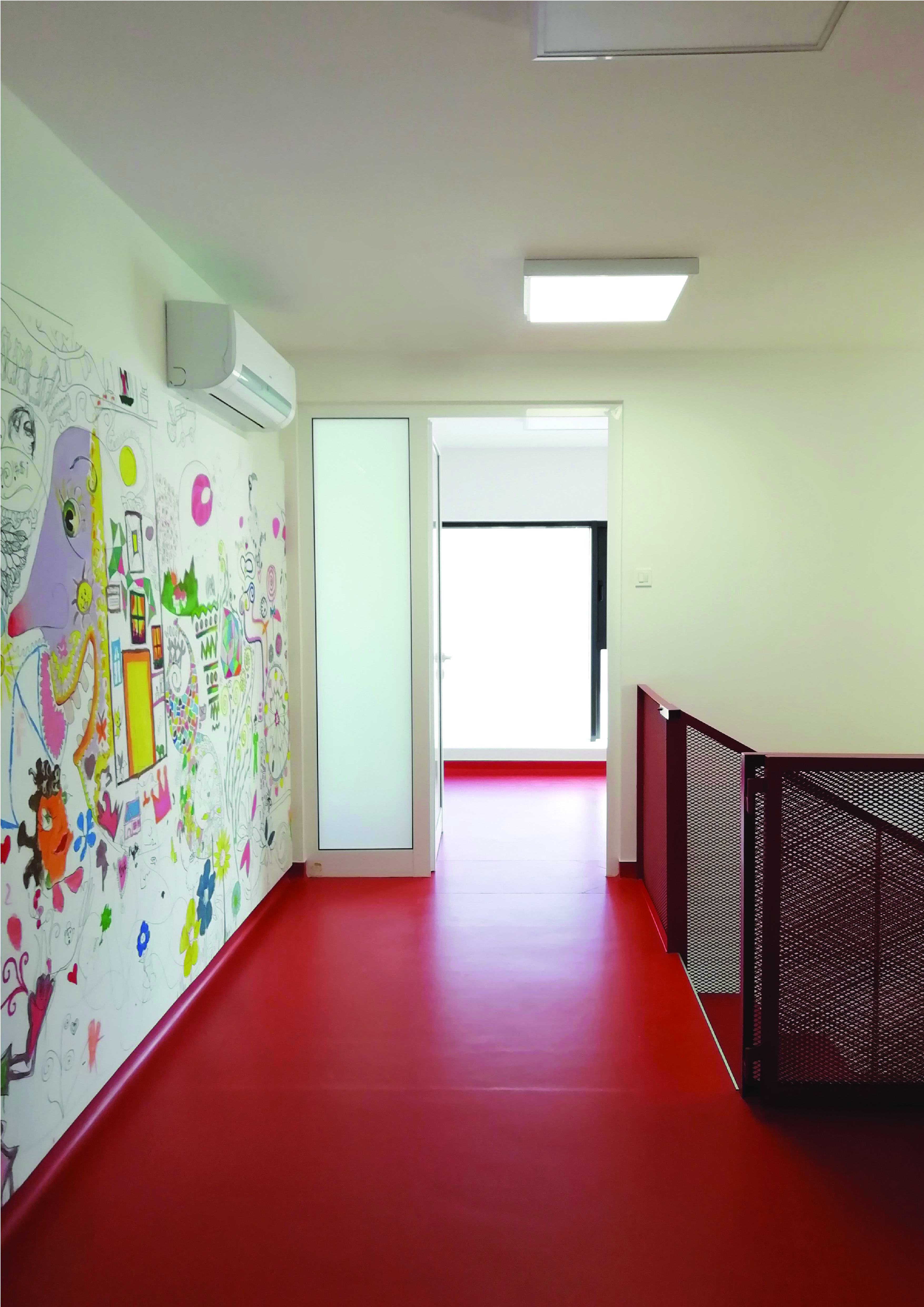 Interijer pedijatrijske poliklinike Štimac u Osijeku formiran je osnovnim prostornim elementima. Okosnicu interijera čine egzaktno izvedene čelične stube crvene boje. Crvena boja stuba prelijeva se na linoleumom obložene podove čekaonica i ordinacija. Saturirana crvena boja podova vizualno objedinjava prostor te prenosi dio ugođaja čekaonica u ordinacije. Ugrađeni i odabrani namještaj bijele je boje i potpuno nenametljiv te se gotovo stapa s bijelim plohama zidova. Jednostavnosti interijera suprotstavlja se lepršavost i razigranost oslikanog platna velikog formata postavljenog na uzdužni zid čekaonice na prvom katu. Platno je kao produkt art terapije i edukacije nastalo zajedničkim radom grupe osoba s posebnim potrebama i polaznika poslijediplomskog studija Kreativne terapije na Akademije za umjetnost i kulturu u Osijeku. Interakcijom osnovnih prostornih elementa formiran je vedar i optimističan prostor blizak djeci te otvoren za daljnju interpretaciju u korištenju.