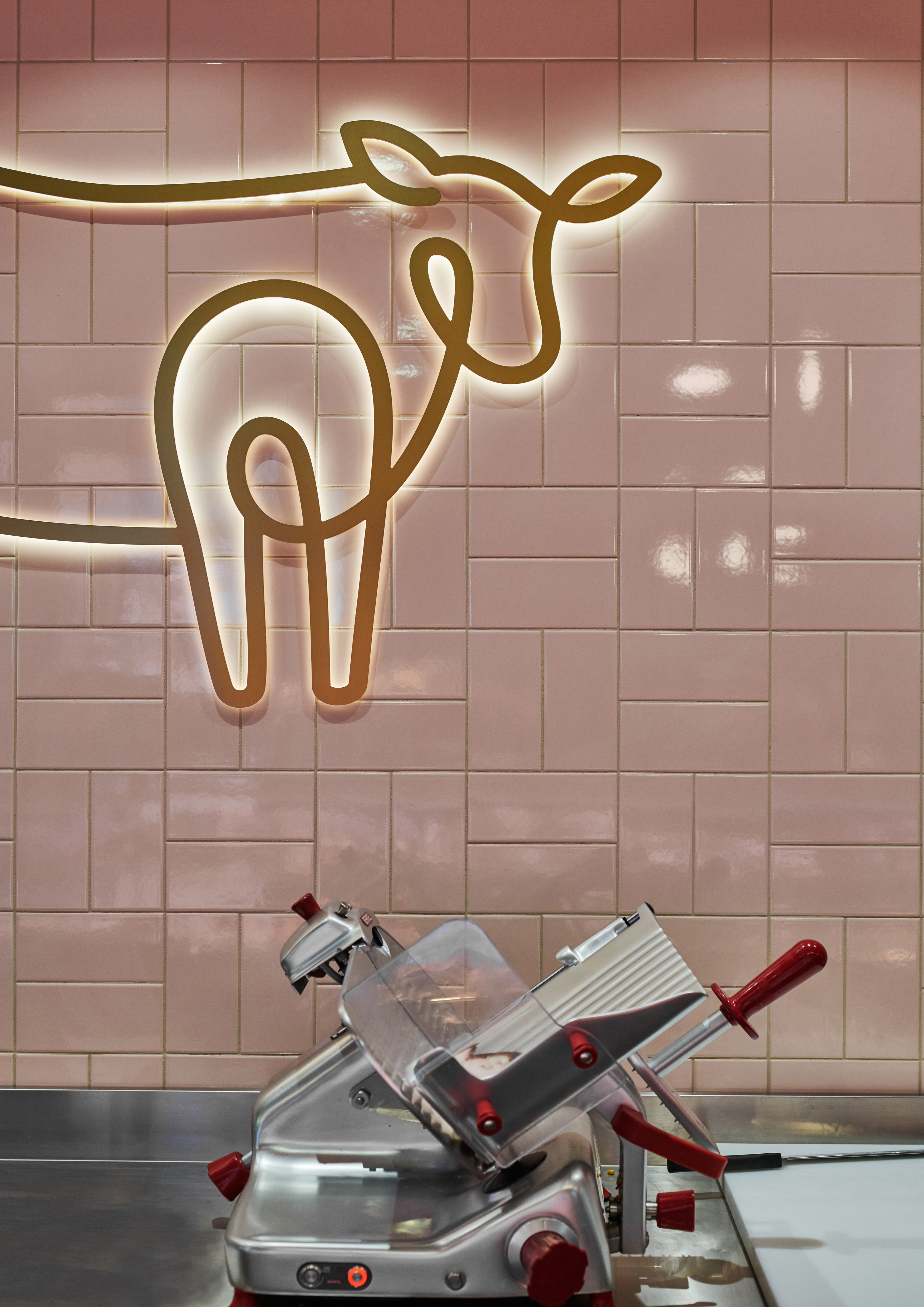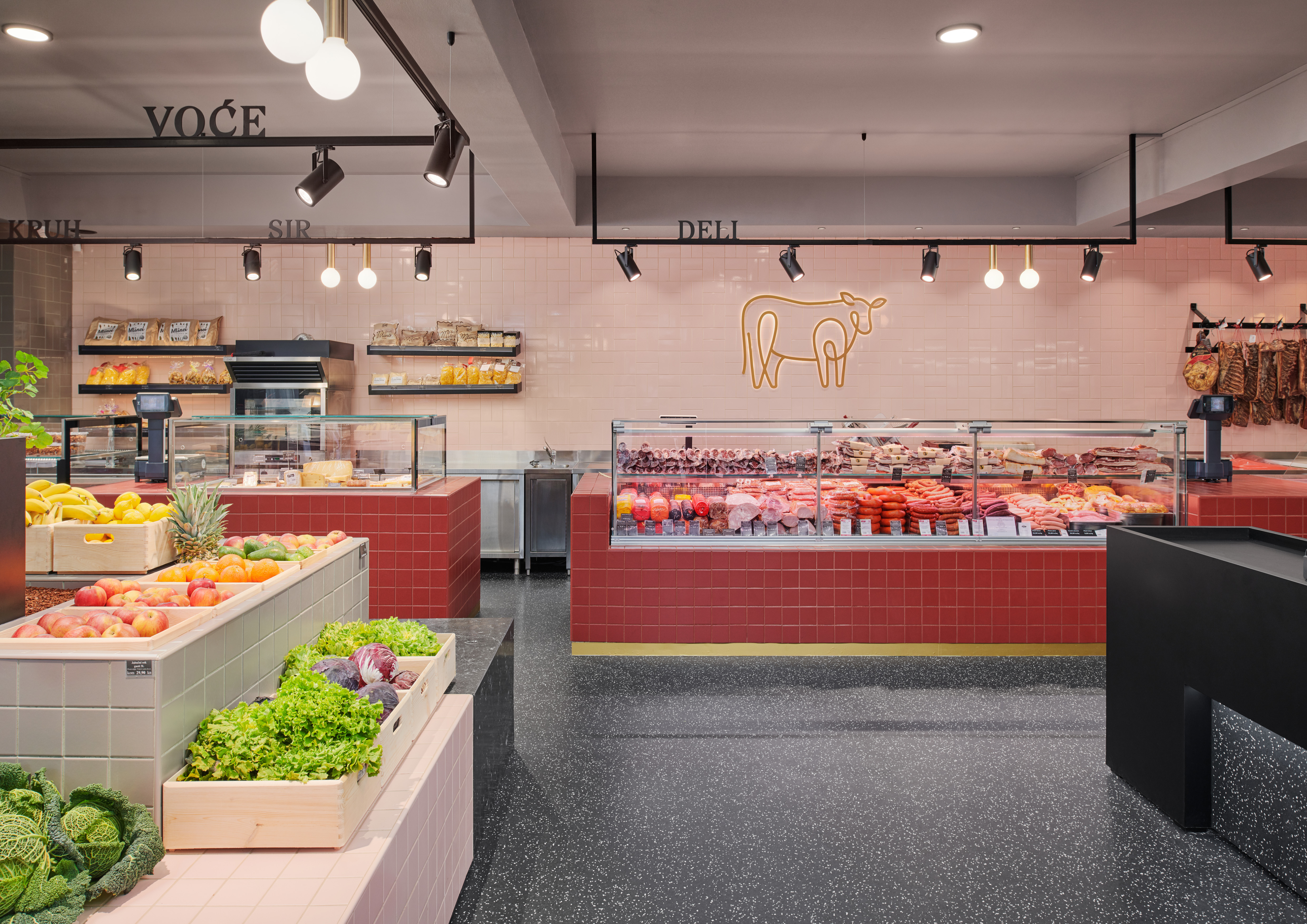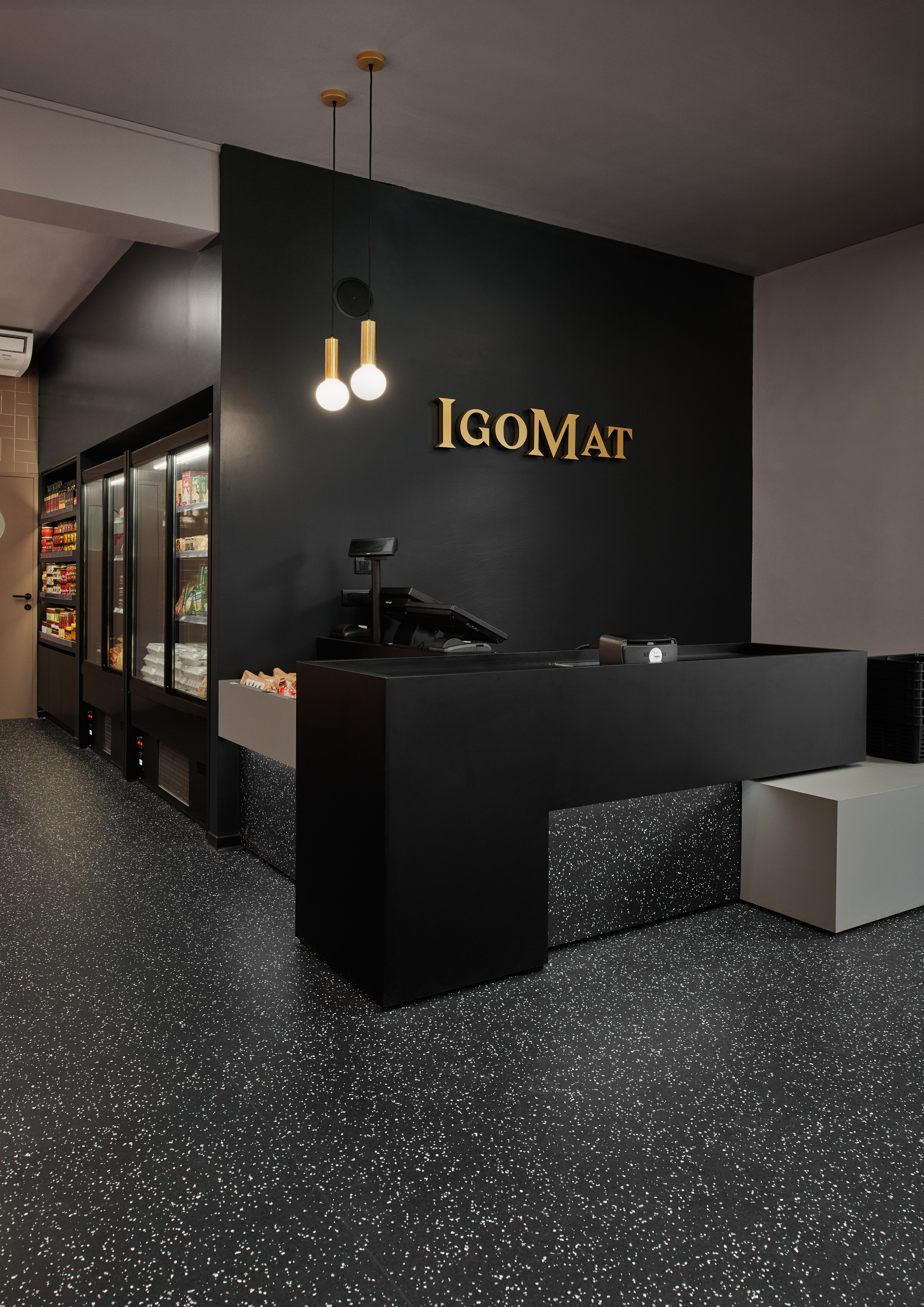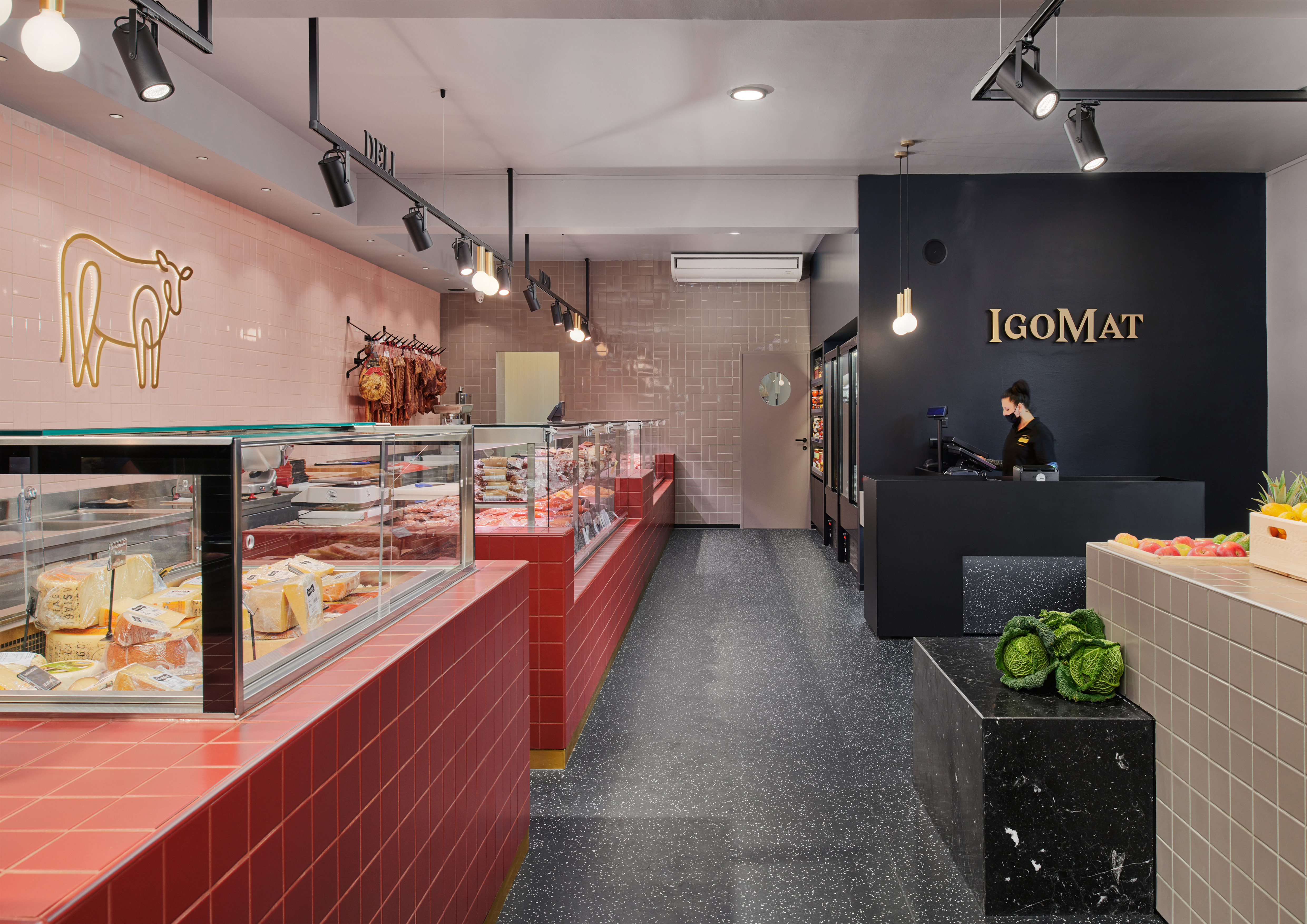 IgoMat je lanac mesnica samoborske obitelji Runtas. Nakon više od dvadeset godina krenuli su u redizajn koji komunicira vrijednosti brenda – inovativnost i kvaliteta. Smjer uređenja određen je projektom u Ilici i primjenjuje se na ostalim mesnicama. S obzirom na poziciju u centru, interijer ima nenametljivu sofisticiranost stare talijanske mesnice, upućujući na dugu tradiciju IgoMata. Svaki novi lokal je ipak priča za sebe pa se uspostavljeni elementi dopunjuju i transformiraju kako bi odgovorili potrebama specifičnog prostora, pozicije, ali i rokova za uređenje. S obzirom na količinu prometa specifične mesnice, određeni su rokovi za izvedbu – najduži period koji mesnica može biti zatvorena. Rekord je uređenje mesnice u Središću za tri dana. Mijenjaju se materijali, način izvedbe, prave gantogrami s najvećim dozvoljenim istovremenim boravkom određenog broja radnika zbog poštovanje COVID-smjernica. Projekti su se pokazali kao odličan case-study koncepta good/cheap/fast. Najreprezentativniji projekt je u Mlinovima, gdje je zadatak smišljanje novog koncepta luksuznije delikatesne trgovine u kojoj bi IgoMat, osim vlastitih, nudio proizvode domaćih OPG-ova. Želio se postići pregledan prostor jasnog layouta radi lakšeg snalaženja, poticanja na kretanje i istraživanje. S materijalima nema prostora za eksperimente zbog strogih higijenskih propisa. Važno je da su izdržljivi i laki za održavanje. No zato su brižljivo projektirani detalji kako bi prostor i s jednostavnim materijalima izgledao uredno i dizajnirano. Nakon odabira osnovnih materijala i boja dodani su završni slojevi i teksture – mramor, bakar, zelenilo. U interijeru su korišteni prigušeni tonovi kako bi naglasak bio na proizvodima. Gotovo sve rađeno je po mjeri, u suradnji s lokalnim majstorima i obrtnicima, osim talijanskih vitrina za meso i keramičkih pločica. Finalni izgled ima poznate elemente mesnice na Britancu, ali završni dojam je ipak nešto modernijeg izričaja.