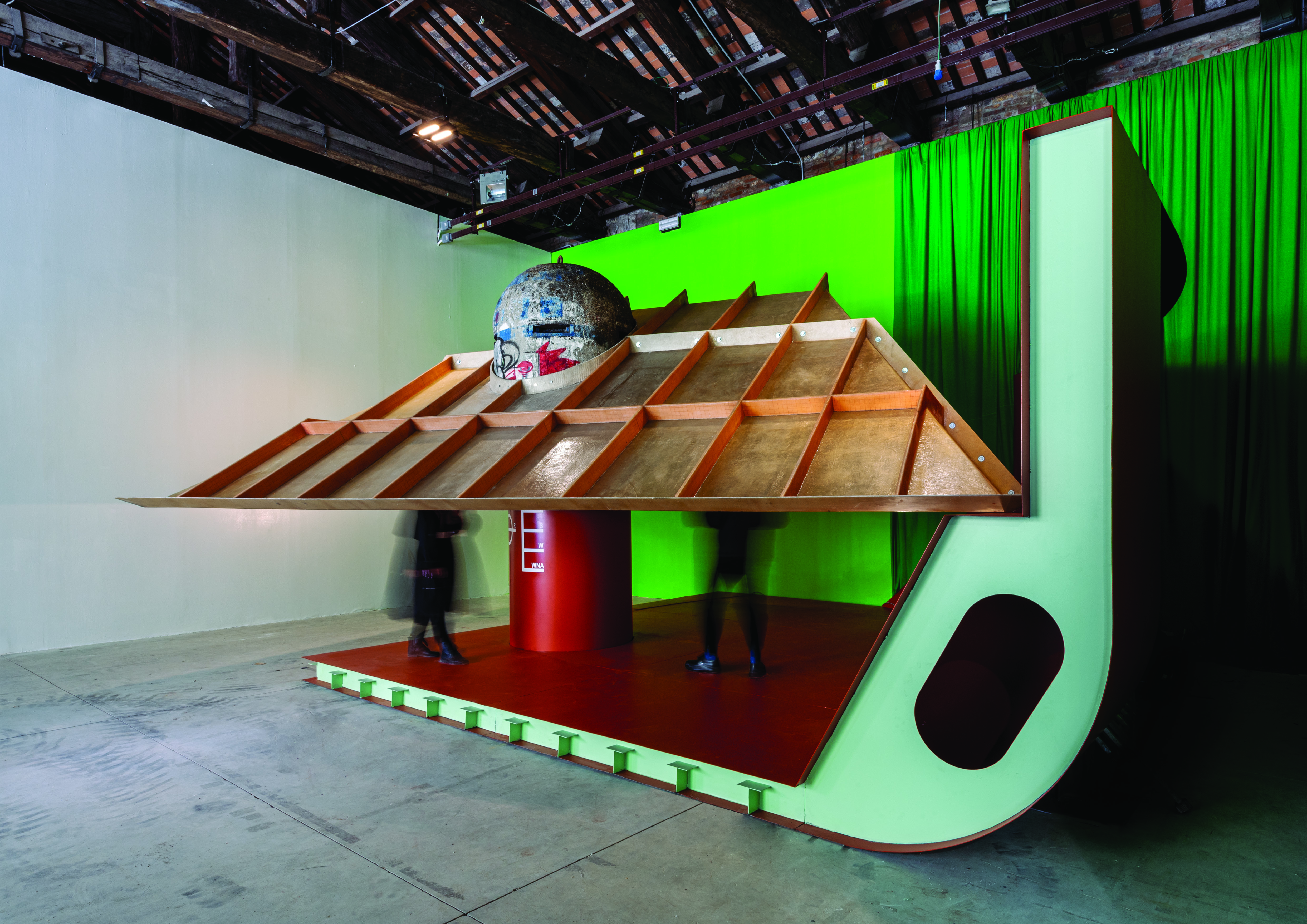Paviljon je prostorna kompozicija, asamblaž koji sugerira kako se bazičnim arhitektonskim elementima može stvoriti prostor trenutne zajednice, kao odgovor na temu Bijenala “How will we live together?”. Pojavnost paviljona definiraju tri univerzalna, izvanvremenska elementa arhitekture: pod, stup i krov. Materijalizirani su korištenjem resursa masovne proizvodnje i industrijskog nasljeđa Rijeke. Povijest i reference upisani u koncept paviljona ishodište nalaze u iskustvu projekta Rijeka 2020 – EPK, istraživačkih aktivnosti programskih pravaca te centra DeltaLab. Grad je shvaćen kao laboratorij i arhiv elemenata koji se istražuju, biraju te izmještaju u novo okruženje kako bi im se upisala nova značenja i drugačiji prostorni odnosi. Betonska stražarnica – riječki bunker stogodišnje povijesti, u paviljonu postaje stup i soba za pojedinca – jedinični modul i prostorni minimum. Konstrukcijski povezuje podni element paviljona i krov. Četverostrešni krov izveden je od oplate staklo-plastičnog laminata, skrojen u lokalnoj radionici izrade bazena i plovila. Postavljen je na visini koja posjetitelju uvjetuje nužnost saginjanja kako bi iskusio unutrašnjost paviljona, zaštićeni prostor pripadanja. Niska pozicija krova onemogućuje direktni vizualni kontakt posjetitelja Arsenala i onih pod krovom, a polu-transparentan materijal stvara nove odnose, potencirajući svijest (ne)pripadanja. Podni element paviljona izveden je od konstrukcije brodogradilišnih ostataka. On definira teritorij zajednice, stupanjem na njega posjetitelj se izdvaja iz ulice Arsenala. Istovremeno ima konstruktivnu funkciju protuteže ostalim elementima. Četvrti element paviljona je green-screen pozadina koja sugerira atmosferu filmskog seta, artikulirajući paviljon kao privremenu pozornicu za izvedbu i stvaranje novih narativa.