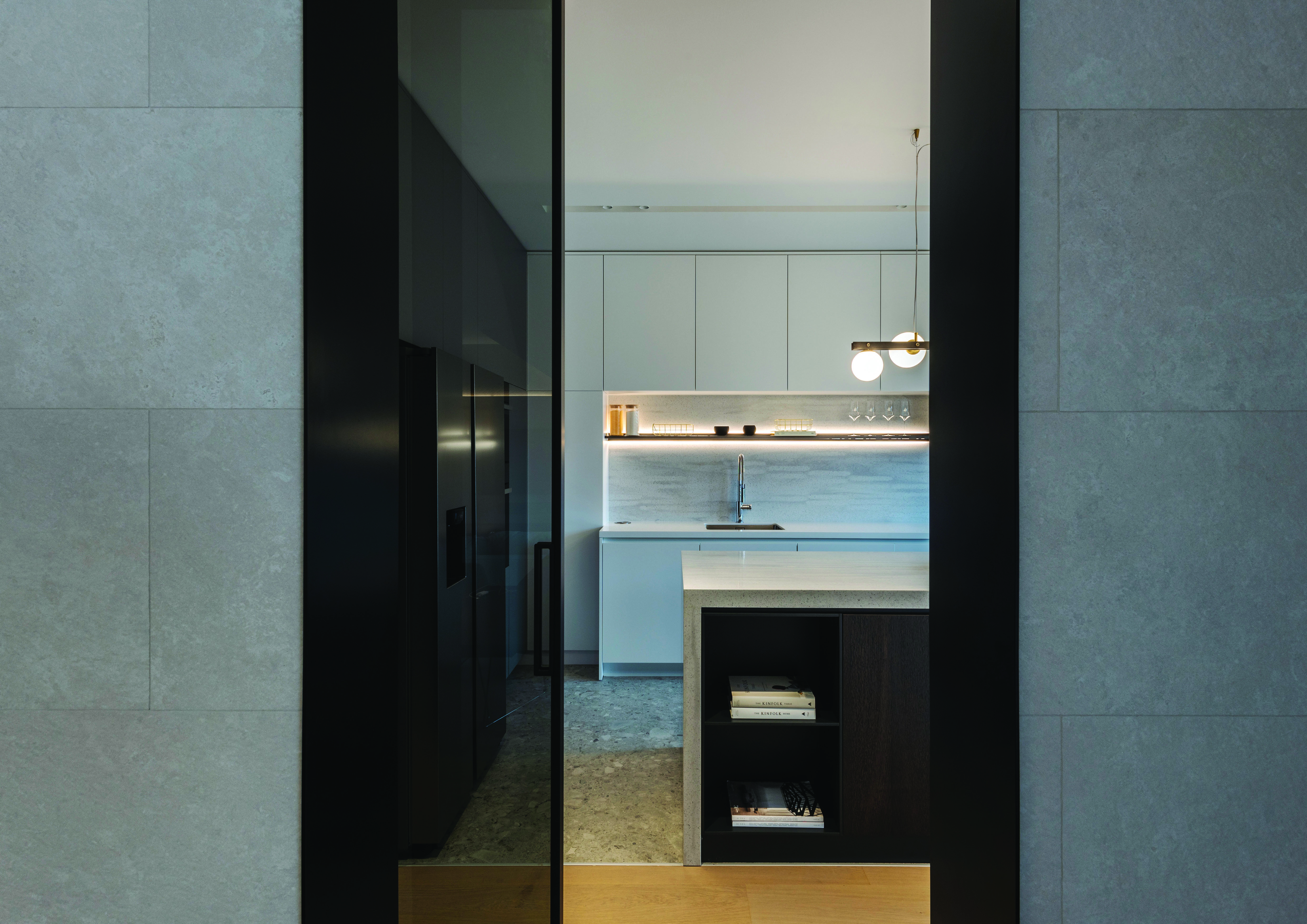 Prostrana kuhinja je zasebna prostorija u stanu. Monumentalni otok u kuhinji je idealno mjesto za okupljanje i druženje. Drvene žaluzine na staklenim stijenama daju posebnu toplinu prostoru te igru svjetla i sjene.