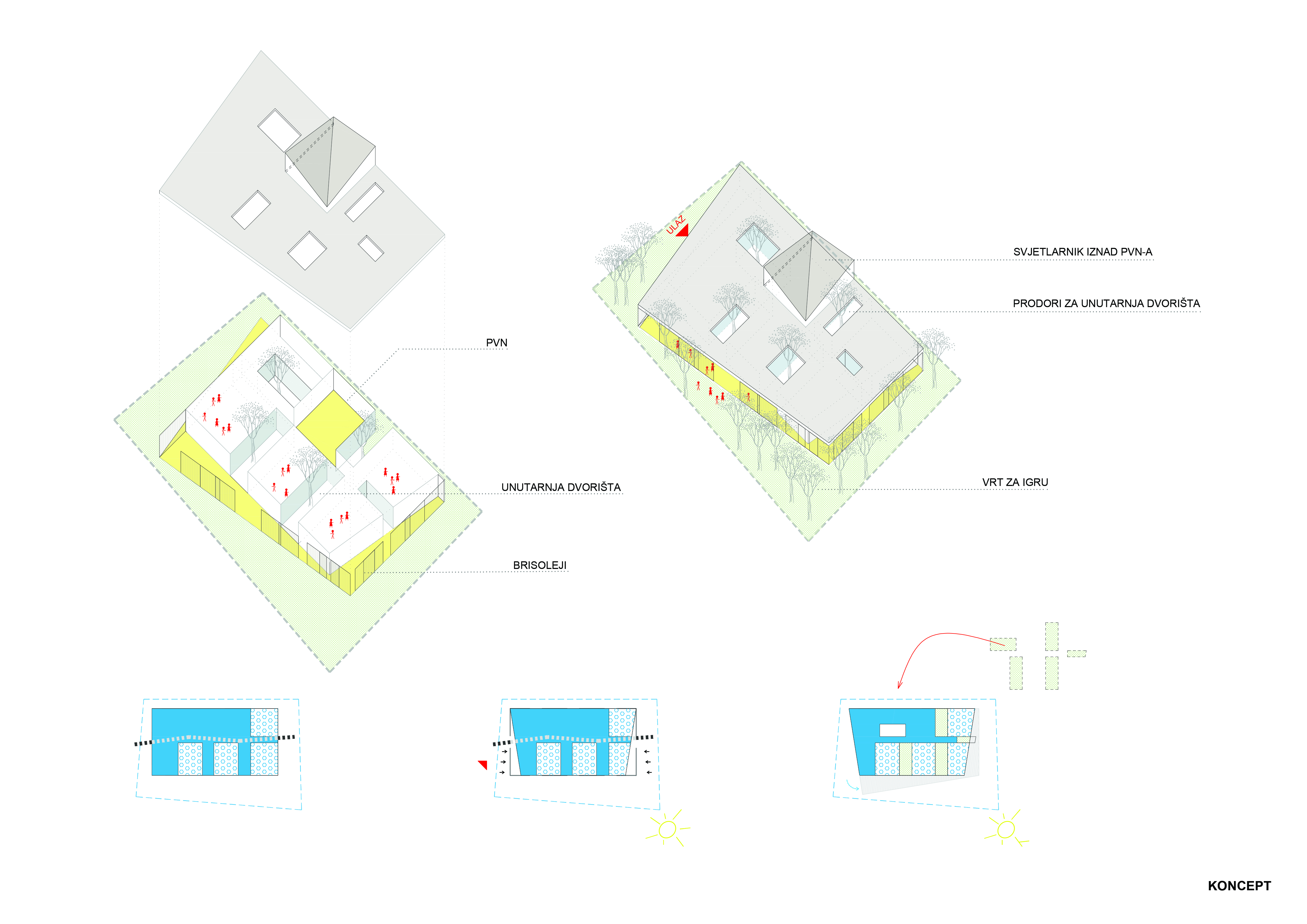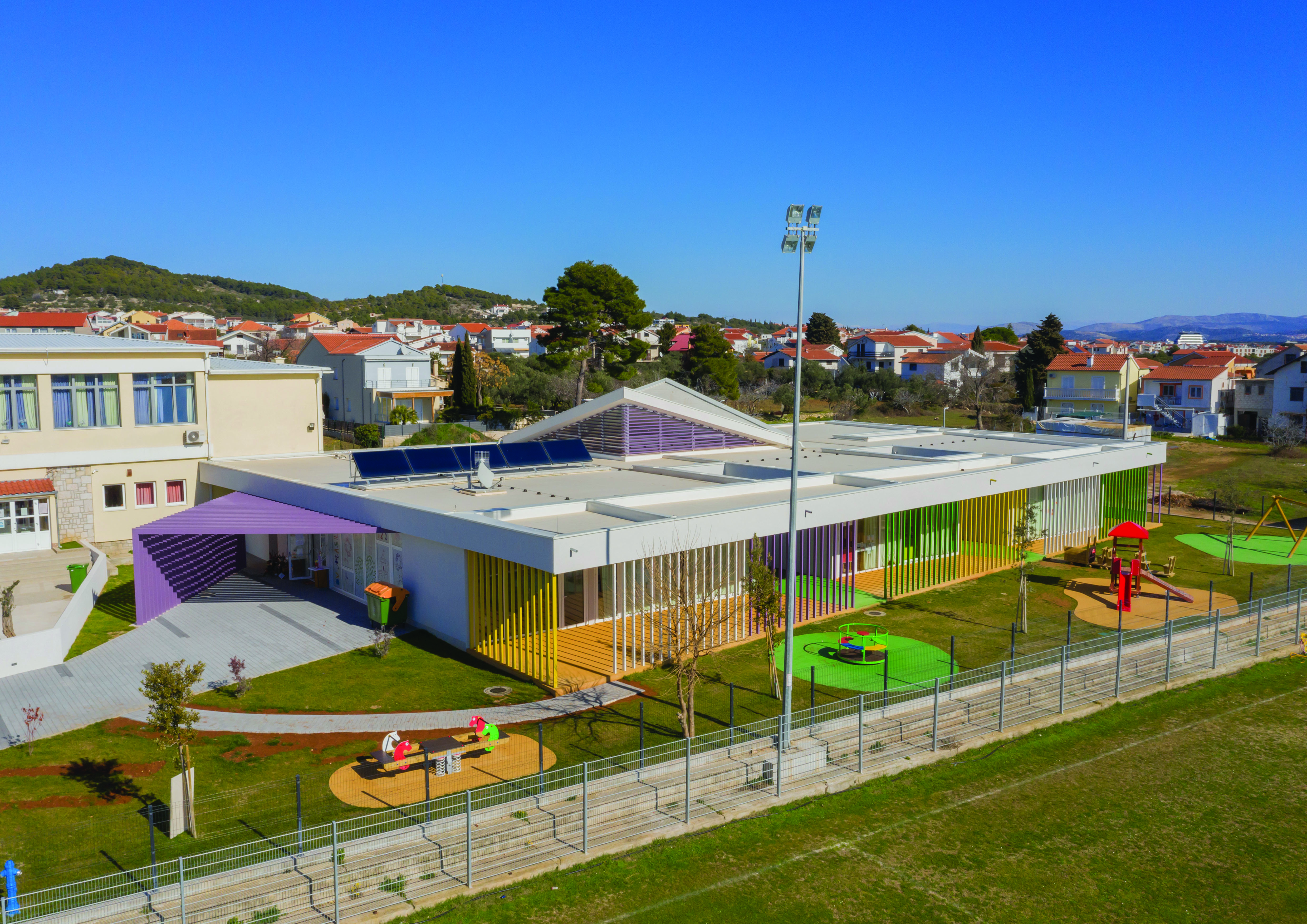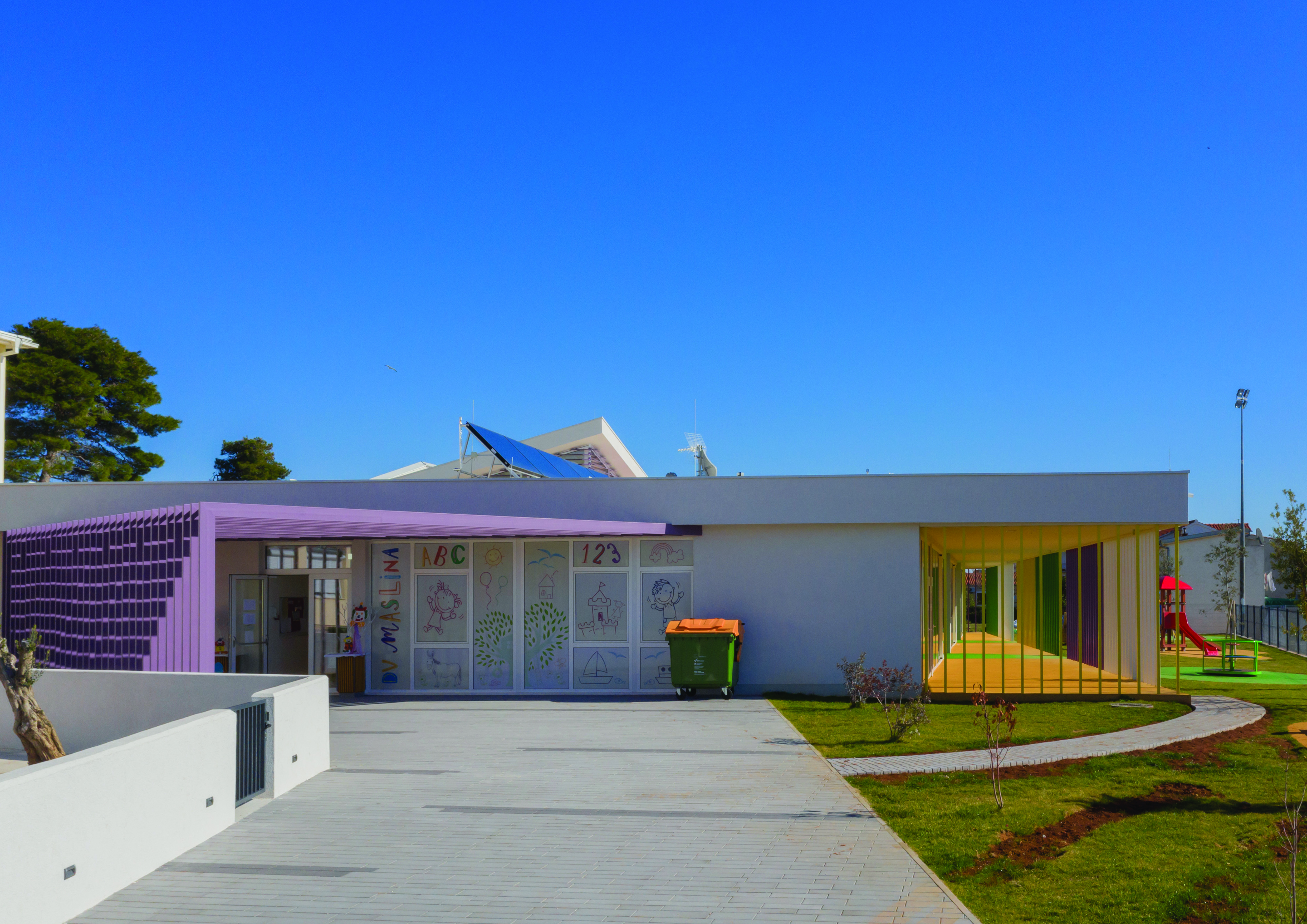 Lokacija vrtića je u neposrednoj blizini centra mjesta Tribunj, uz osnovnu školu i nogometno igralište lokalnog nogometnog kluba. Vrtić je izgrađen na lokaciji na kojoj je bila borova šume koja je zbog lošeg stanja uklonjena prije početka gradnje. Takav prirodni ambijent prožet je u konceptu dječjeg vrtića. Planirana zgrada zamišljena je kao prizemni objekt paviljonskog tipa s naglašenom plohom ravnog krova. Unutarnja dvorišta osnovni su koncept organizacije vrtića. Uvođenjem elementa unutarnjih dvorišta u trup vrtića rješavamo nekoliko problema organizacije prostora; prirodno provjetravanje i osvjetljenje, bolja zvučna izolacija između jedinica te distanciranje gospodarskog bloka od prostorija u kojima borave djeca. Projektom je predviđena izgradnja ukupno četiri skupne jedinice, od čega jedna jaslička i tri vrtićke. Uz skupne sobe predviđen je prostor za više namjena (PVN) te ostale prateće prostorije. Ukupna bruto površina objekta iznosi 660,92 m². Skupne sobe direktno su povezane s natkrivenim terasama na jugoistoku i jugozapadu preko kliznih staklenih stijena. Na ovaj način omogućeno je proširenje pojedine sobe dnevnog boravka na natkriveni vanjski prostor. Krov iznad PVN je obrnuti dvostrešni prelomljen po dijagonali čime smo dobili svjetlarnik ali i potrebnu visinu prostorije. Tema vertikalnih brisoleja kao zaštita od insolacije definira izgled vrtića, pa je i formiranje nadstrešnice iznad ulaza proizašlo iz teme vertikalnih brisoleja na pročeljima.