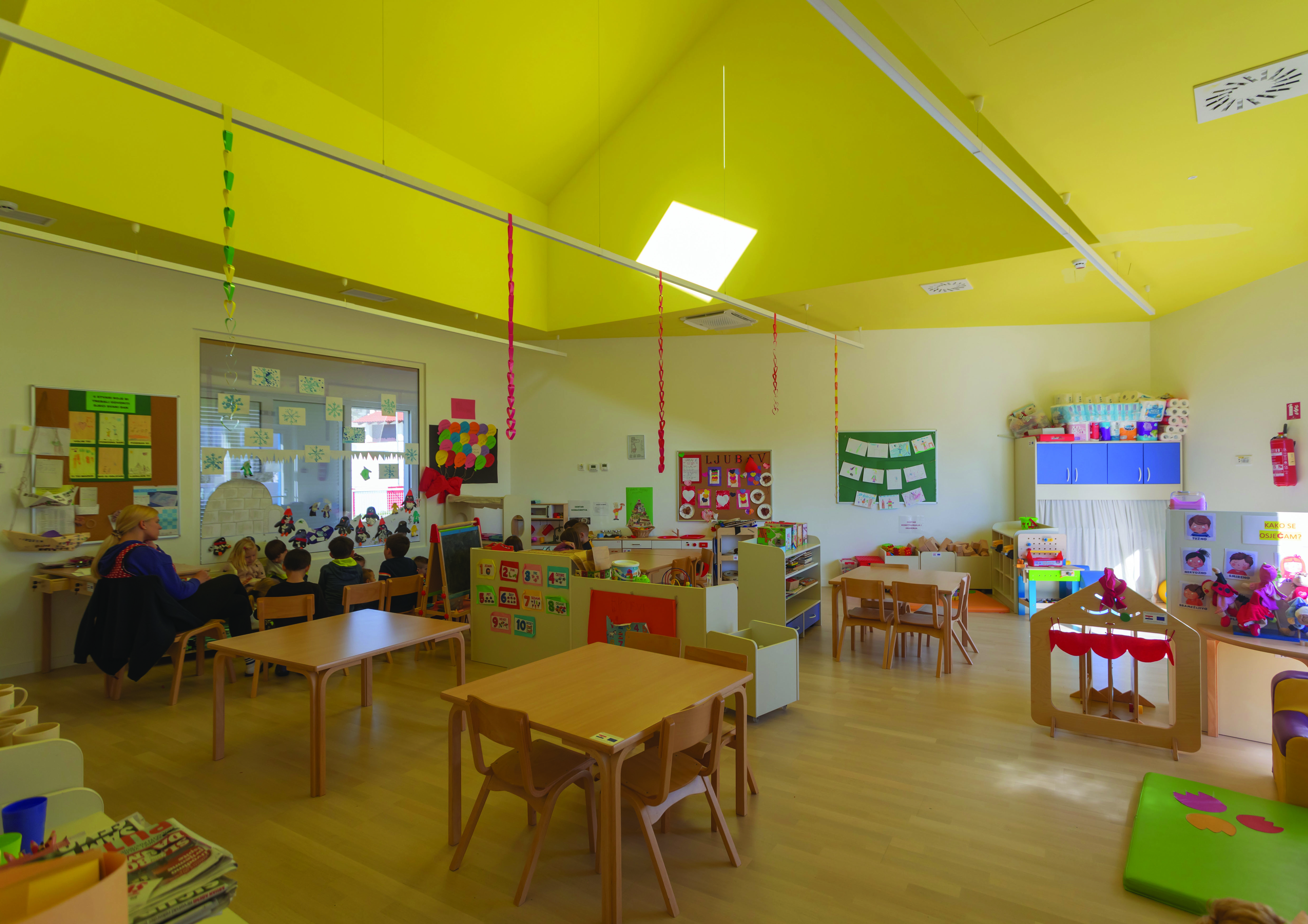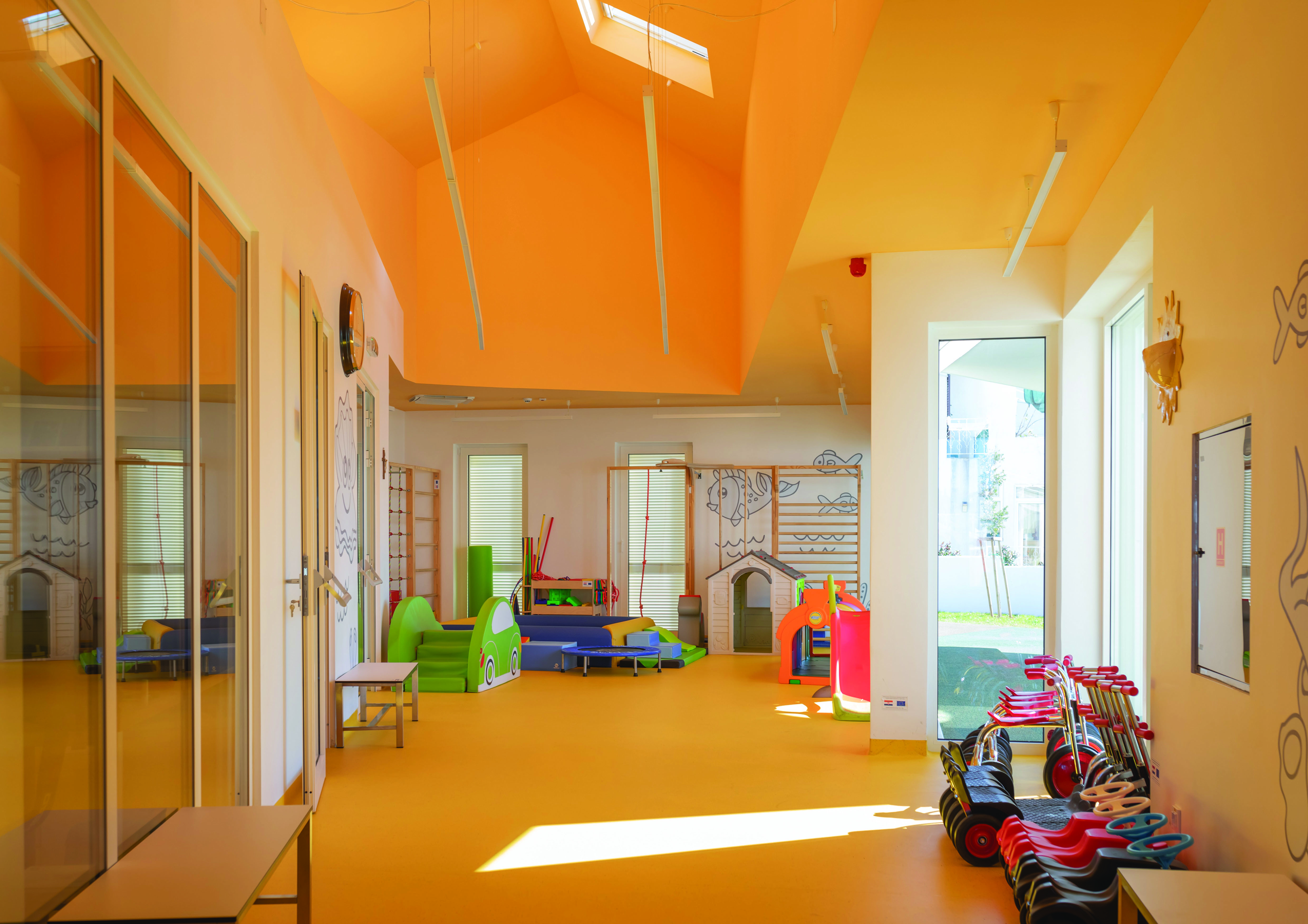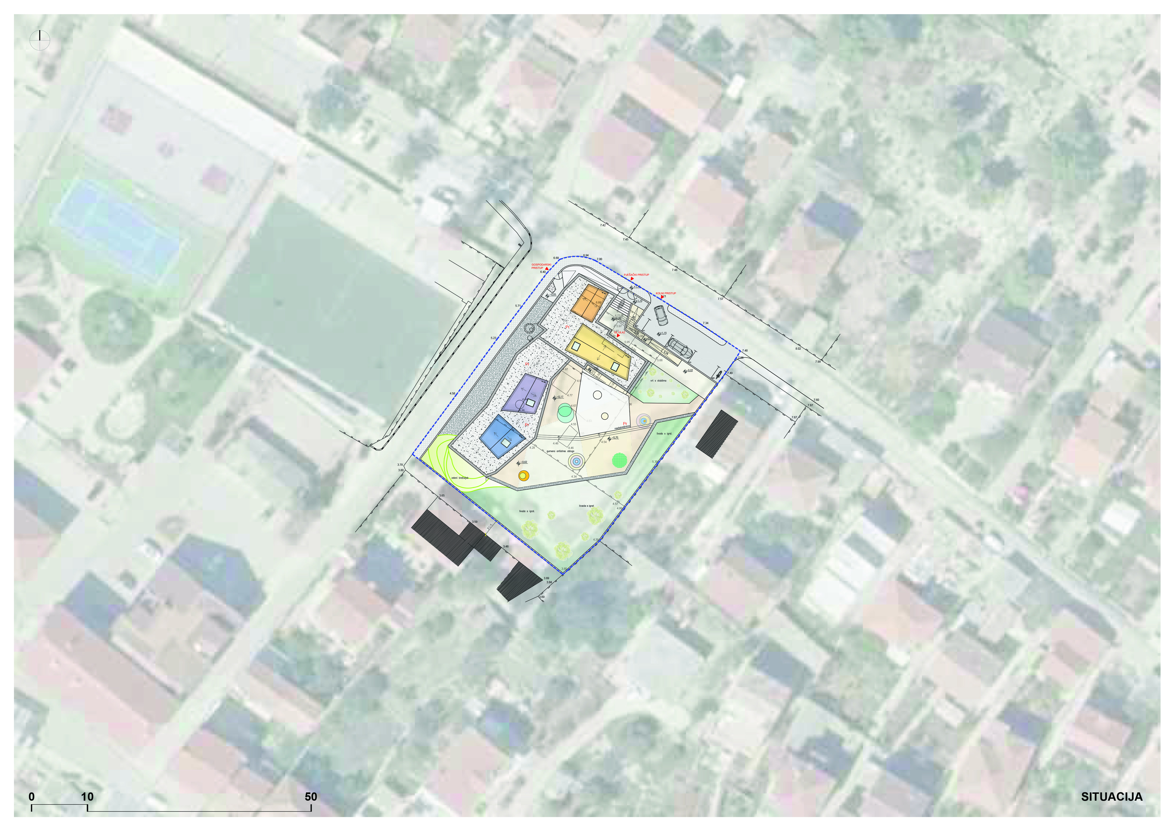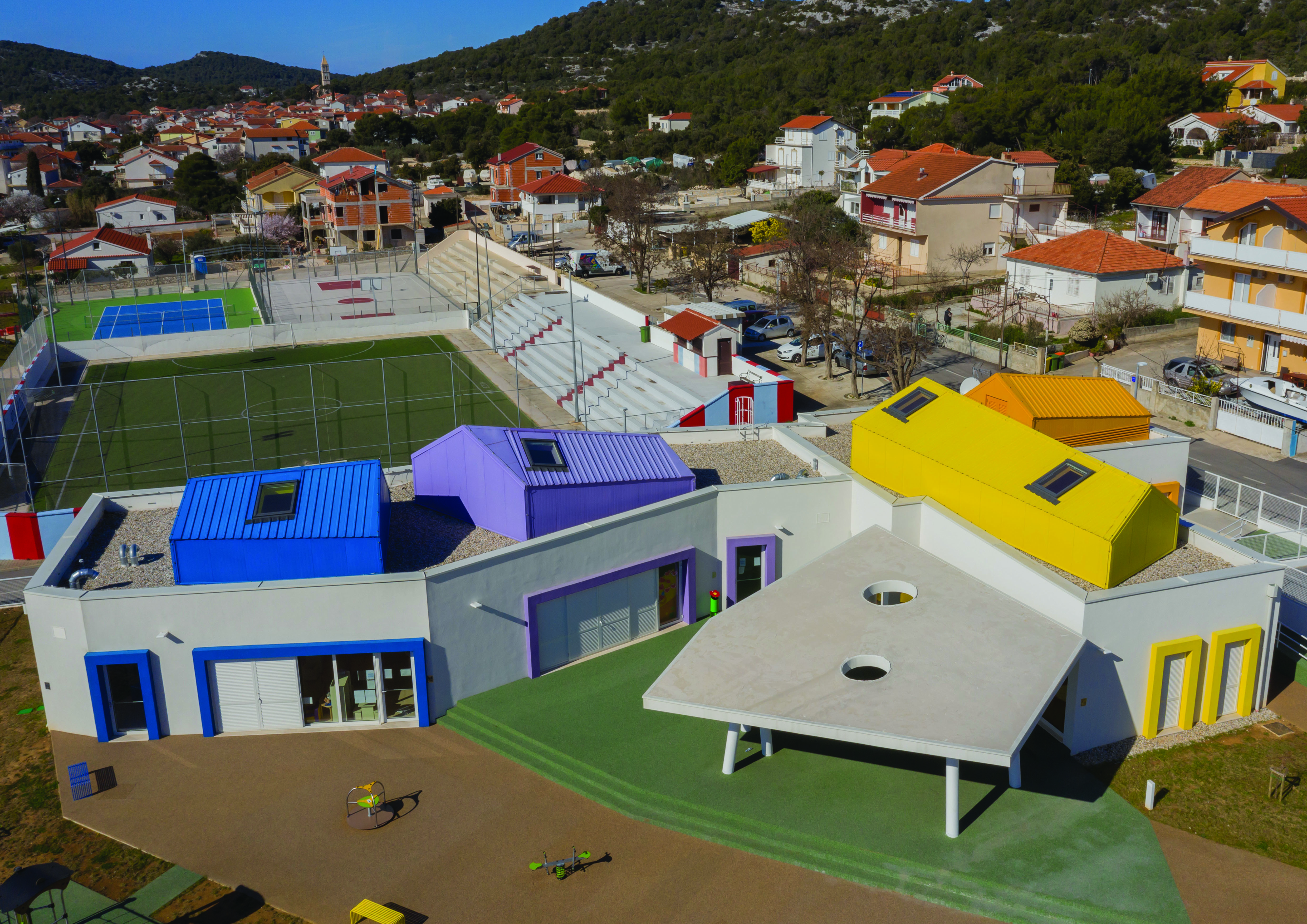 Ovim projektom realizirala se rekonstrukcija odgojno – obrazovne građevine nedovoljnog kapaciteta, te je nadogradnjom formiran nepravilni tlocrtni oblik. Prilikom pozicioniranja objekta težilo se stvaranju unutarnjeg otvorenog prostora za igru djece gdje objekt služi kao paravan okolnim prometnicama – od tuda je i proizišao oblik građevine. Objekt je visinski koncipiran tako da prati strukturu i nagib terena. Teren pada prema jugozapadu, a objekt se preko rampi lomi duž cijele konstrukcije sukladno padu. Nagib terena definirao je formu vijenca objekta – nagib terena projiciran je na vanjsku liniju vijenca. Vanjska terasa smještena je centralno u dvorišnom prostoru kao nastavak PVN-a, a ostale površine uređene su kroz edukativne kutke.