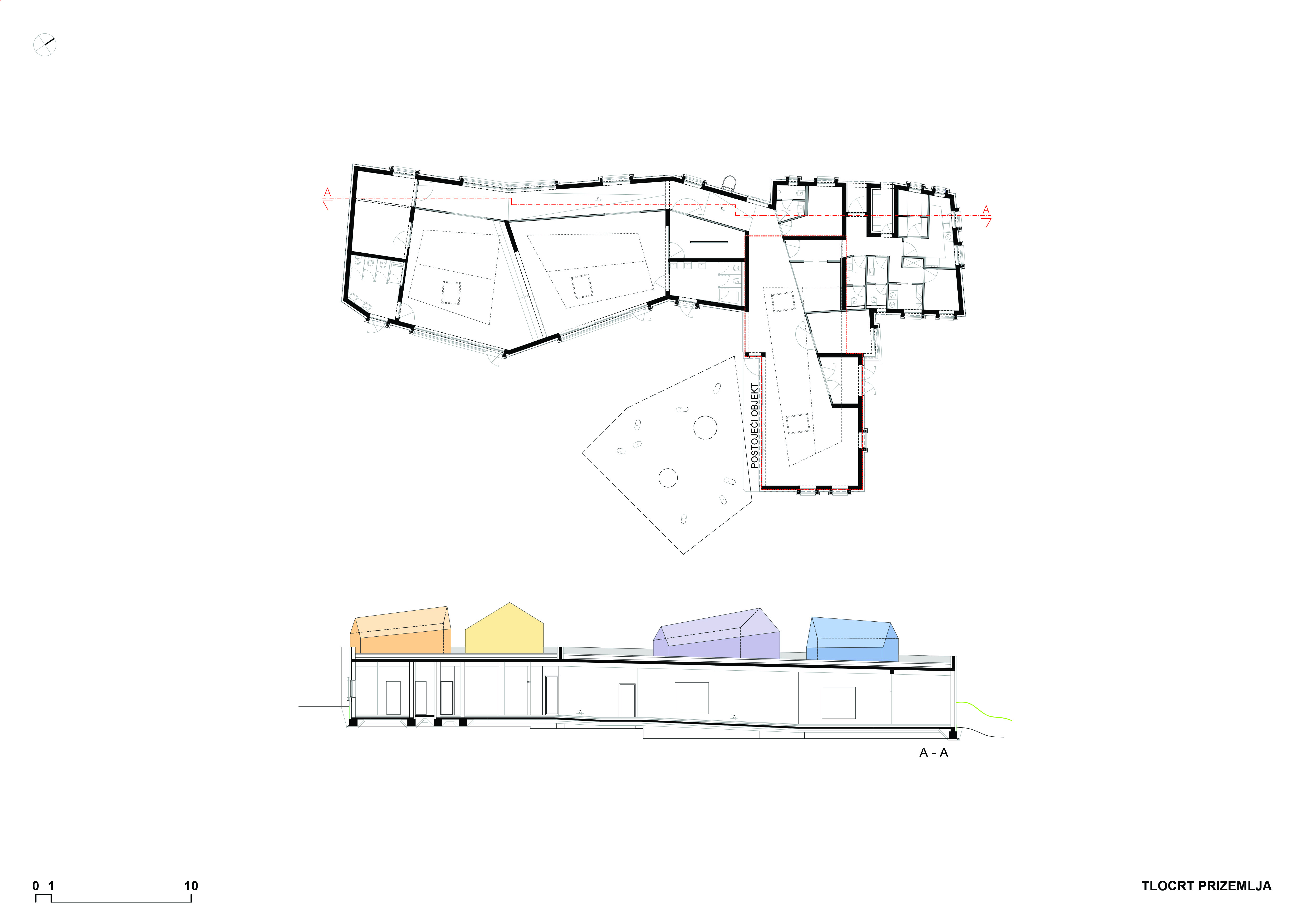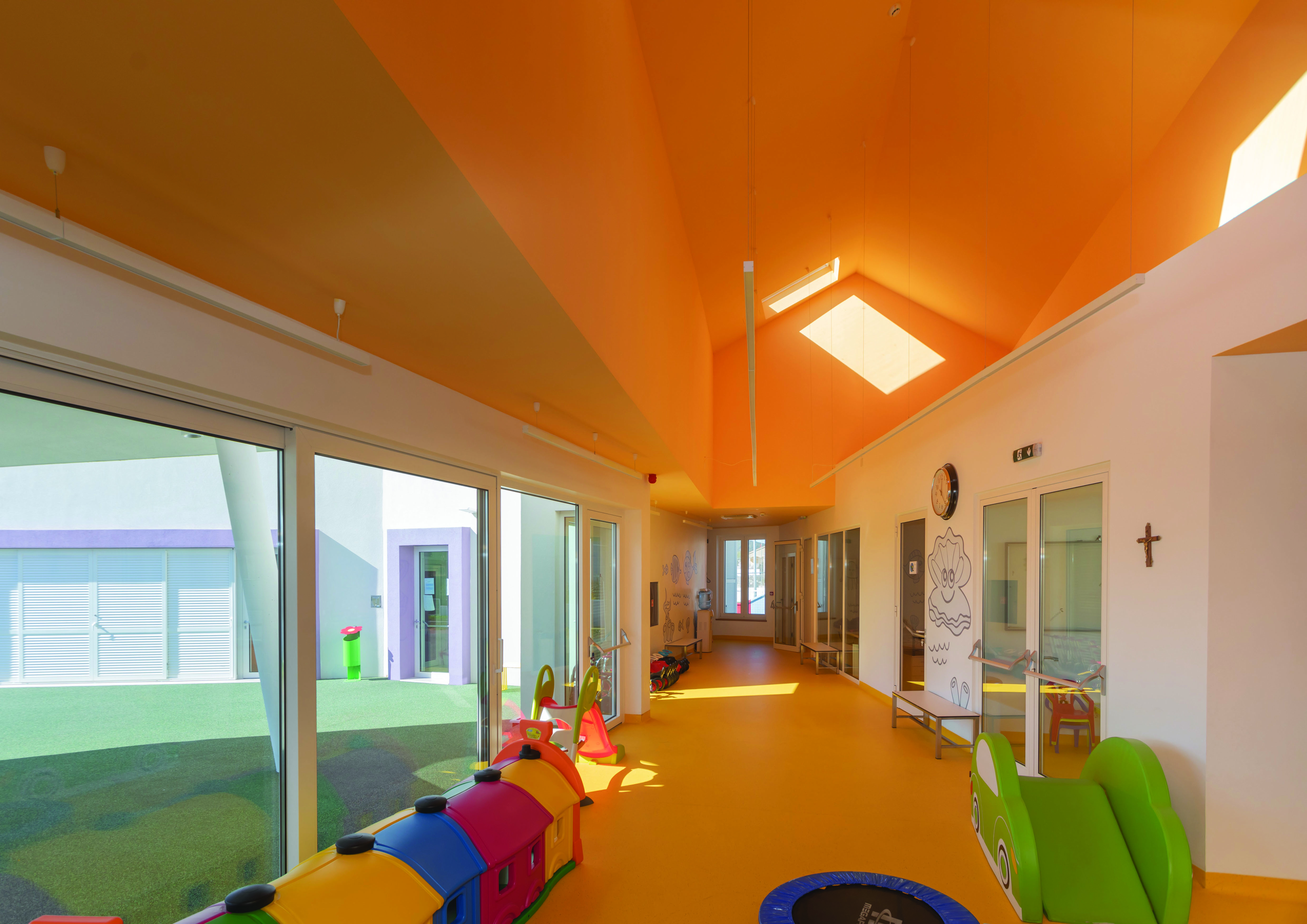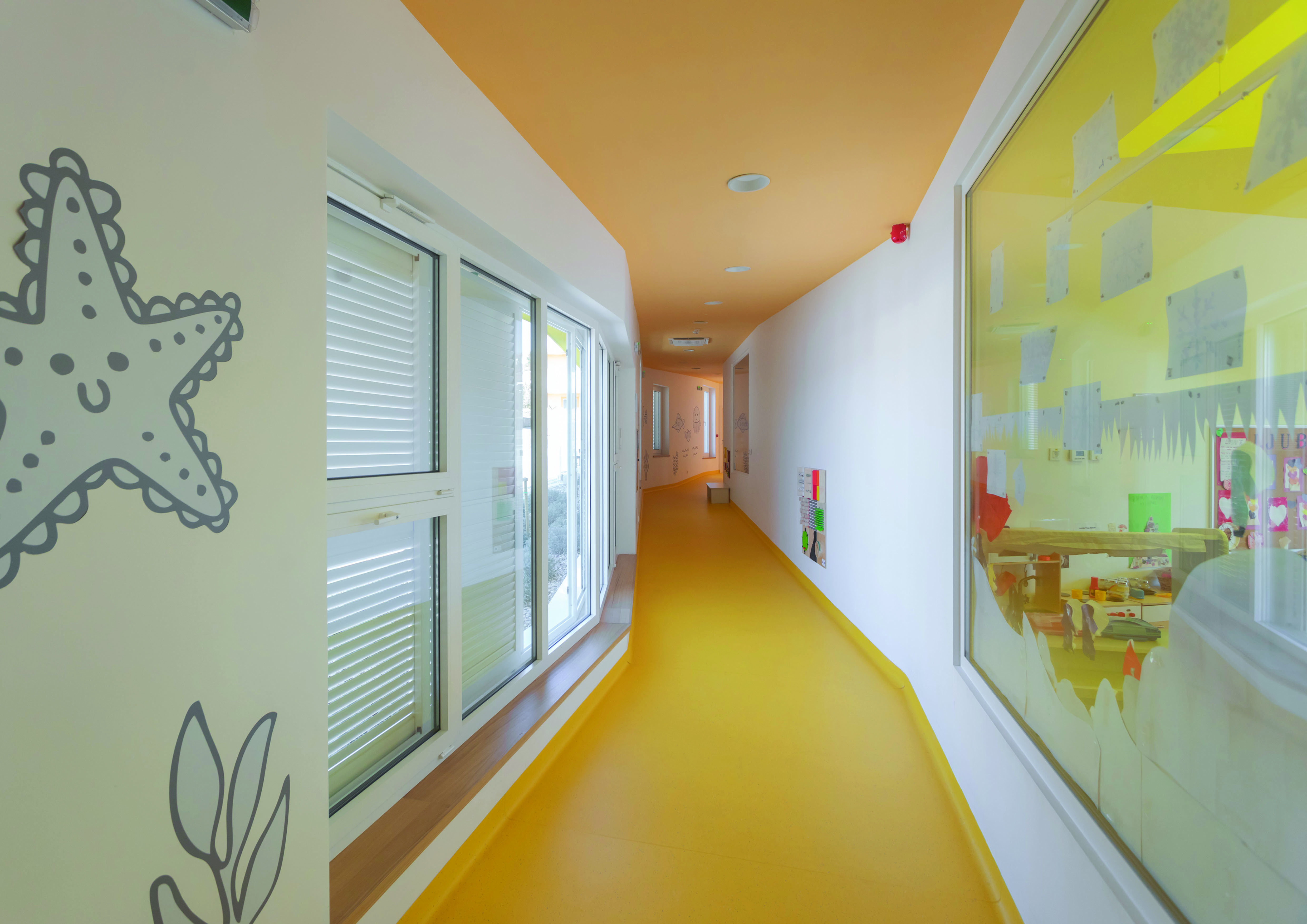 Ovim projektom realizirala se rekonstrukcija odgojno – obrazovne građevine nedovoljnog kapaciteta, te je nadogradnjom formiran nepravilni tlocrtni oblik. Prilikom pozicioniranja objekta težilo se stvaranju unutarnjeg otvorenog prostora za igru djece gdje objekt služi kao paravan okolnim prometnicama – od tuda je i proizišao oblik građevine. Objekt je visinski koncipiran tako da prati strukturu i nagib terena. Teren pada prema jugozapadu, a objekt se preko rampi lomi duž cijele konstrukcije sukladno padu. Nagib terena definirao je formu vijenca objekta – nagib terena projiciran je na vanjsku liniju vijenca. Vanjska terasa smještena je centralno u dvorišnom prostoru kao nastavak PVN-a, a ostale površine uređene su kroz edukativne kutke.