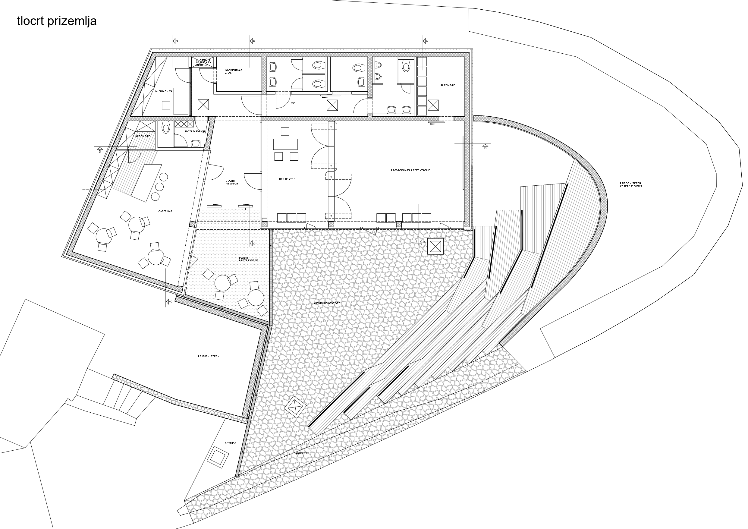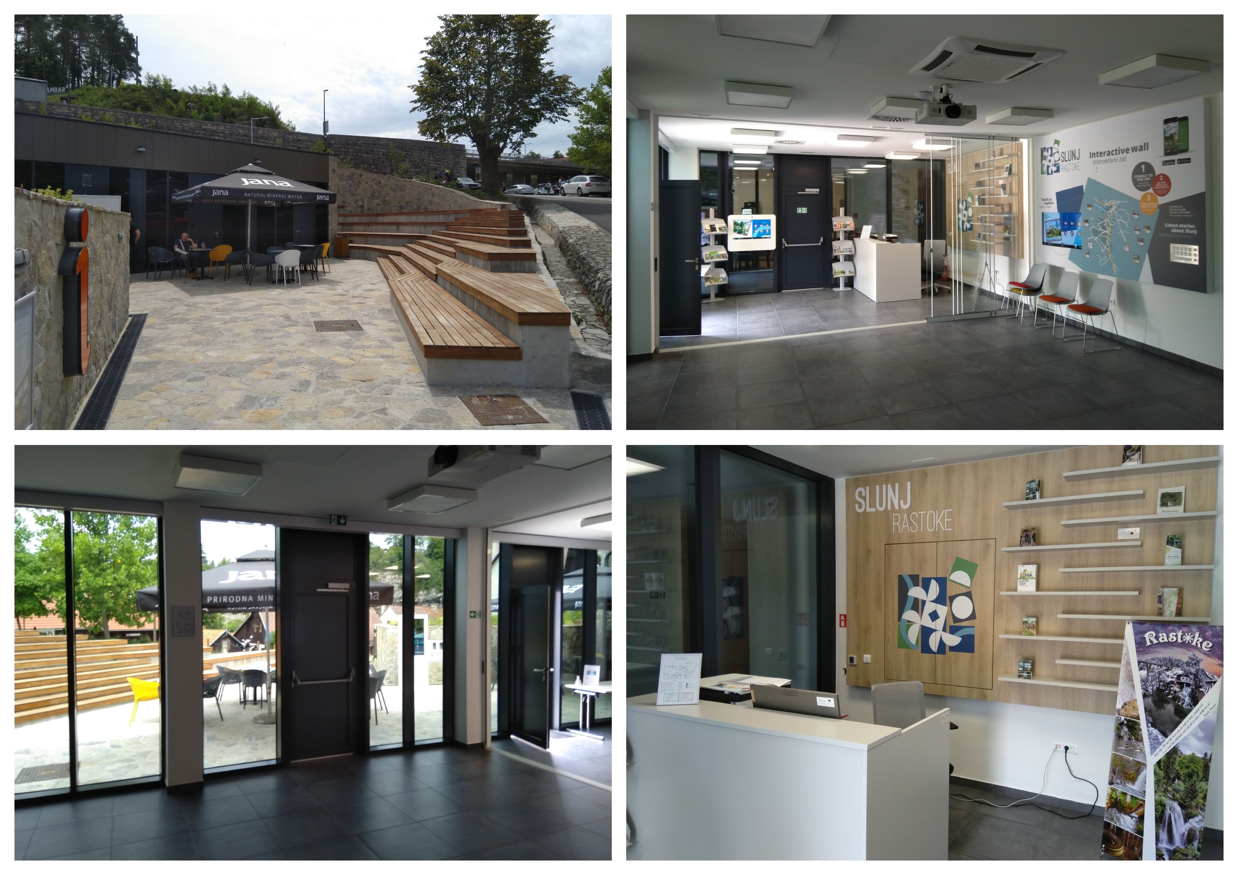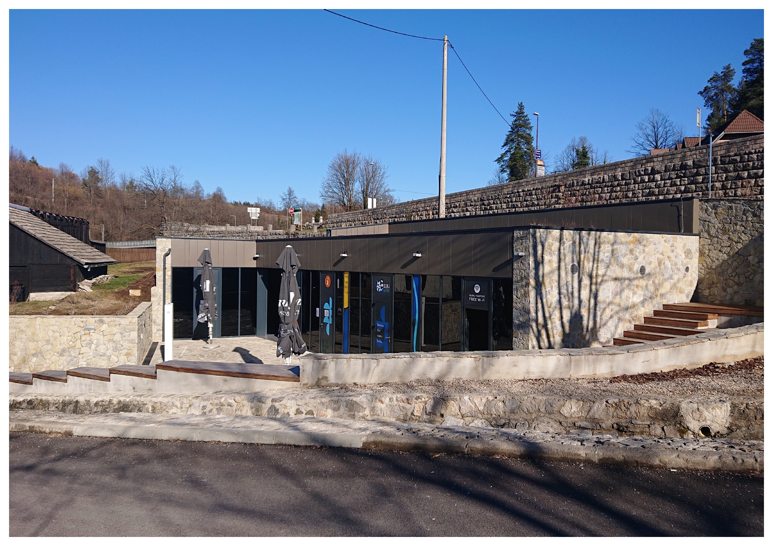 Planirana građevina je poslovne – turističko ugostiteljske namjene. Nalazi na ulazu u Donje Rastoke, kraj Slunja. Ideja projekta je diskretno uklopiti planiranu građevinu unutar prirodnog terena, tj. ukopati je pod zemlju prema konzervatorskim smjernicama bez žrtvovanja kvaliteta kao što su prirodno osvjetljenje i osunčanje, ventilacija te vizure prema Rastokama. Oblikovanjem ulaznog trga i unutarnjeg dvorišta omogućuju se navedene kvalitete, a istovremeno zadovoljava introvertan program konzervatorske podloge. Krov građevine uklopljen je u ozelenjene serpentine koje svojim oblikovanjem prate serpentinu kolnog prilaza i naglašavaju njen specifični oblik. Sama građevina sastoji se od tri osnovna sklopa: snack bara, informacijskog centra i javnog wc-a. Sklopovi su međusobno vezani natkrivenim ulaznim prostorom. Organizacijom sklopa omogućeno je samostalno funkcioniranje pojedinih jedinica neovisno o njihovom radnom vremenu. Kako je građevina ukopana u kosi teren, veći dio njenog volumena prekriven je nasipom zemlje, oblikovan u skladu s okolnim terenom i ozelenjen, a manji dio sjevernog volumena koji se izdiže iz kosine terena prekriven je ravnim ozelenjenim krovom. Izgradnja je započela 2019. godine, a završena je 2021. godine.