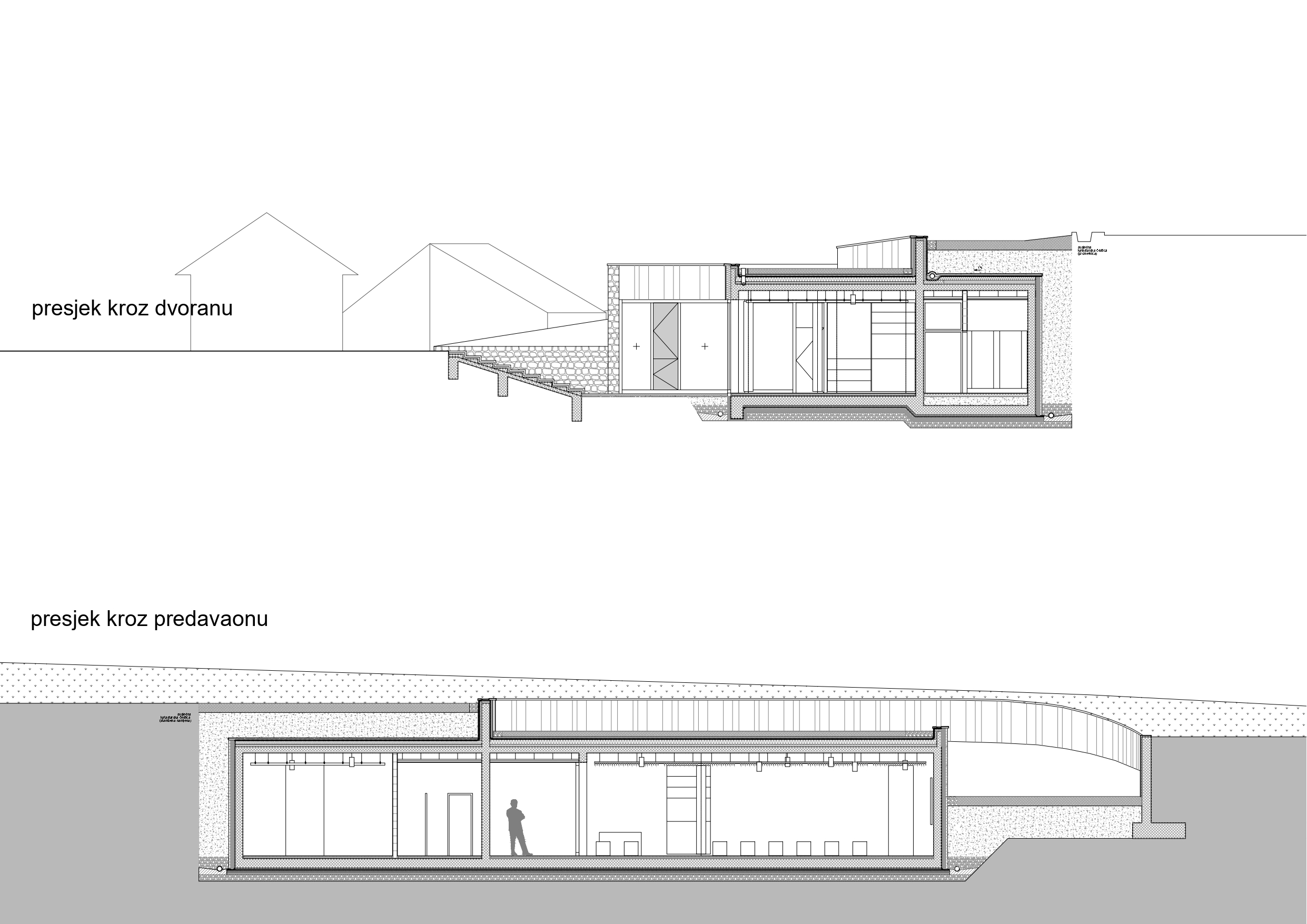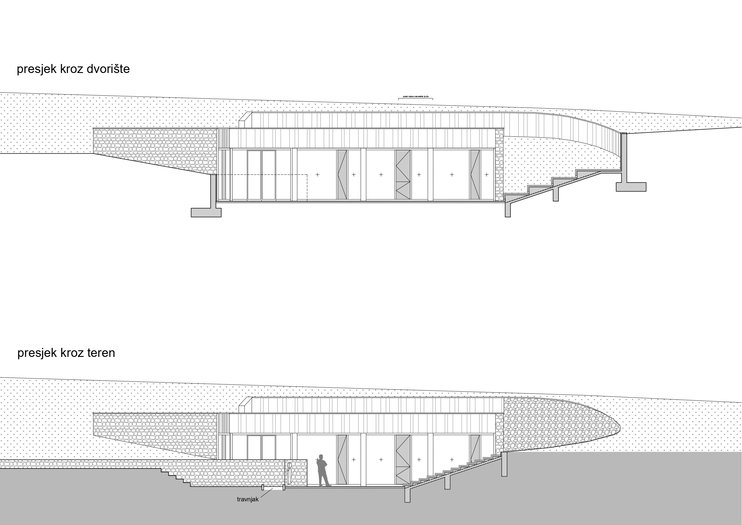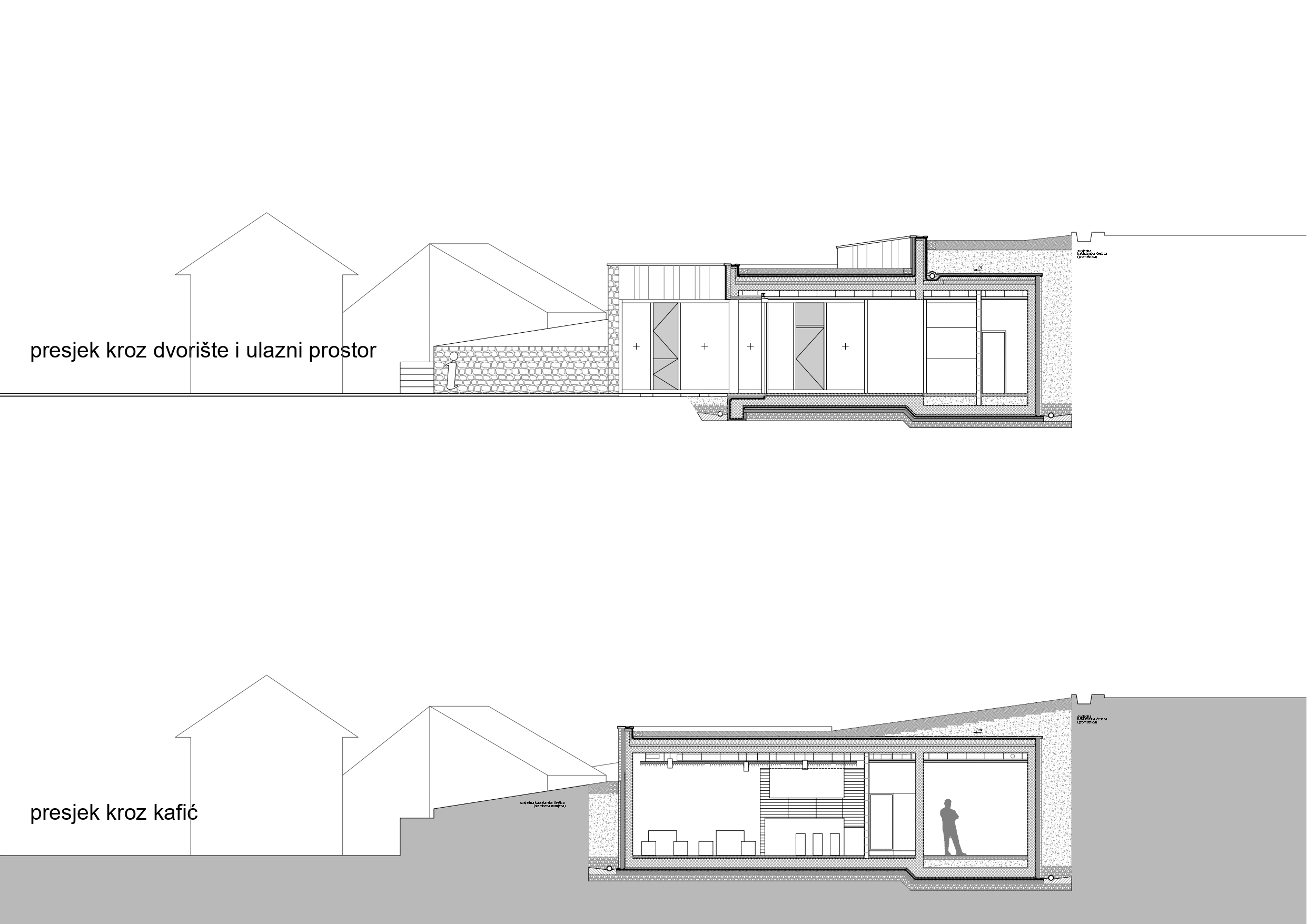 Planirana građevina je poslovne – turističko ugostiteljske namjene. Nalazi na ulazu u Donje Rastoke, kraj Slunja. Ideja projekta je diskretno uklopiti planiranu građevinu unutar prirodnog terena, tj. ukopati je pod zemlju prema konzervatorskim smjernicama bez žrtvovanja kvaliteta kao što su prirodno osvjetljenje i osunčanje, ventilacija te vizure prema Rastokama. Oblikovanjem ulaznog trga i unutarnjeg dvorišta omogućuju se navedene kvalitete, a istovremeno zadovoljava introvertan program konzervatorske podloge. Krov građevine uklopljen je u ozelenjene serpentine koje svojim oblikovanjem prate serpentinu kolnog prilaza i naglašavaju njen specifični oblik. Sama građevina sastoji se od tri osnovna sklopa: snack bara, informacijskog centra i javnog wc-a. Sklopovi su međusobno vezani natkrivenim ulaznim prostorom. Organizacijom sklopa omogućeno je samostalno funkcioniranje pojedinih jedinica neovisno o njihovom radnom vremenu. Kako je građevina ukopana u kosi teren, veći dio njenog volumena prekriven je nasipom zemlje, oblikovan u skladu s okolnim terenom i ozelenjen, a manji dio sjevernog volumena koji se izdiže iz kosine terena prekriven je ravnim ozelenjenim krovom. Izgradnja je započela 2019. godine, a završena je 2021. godine.