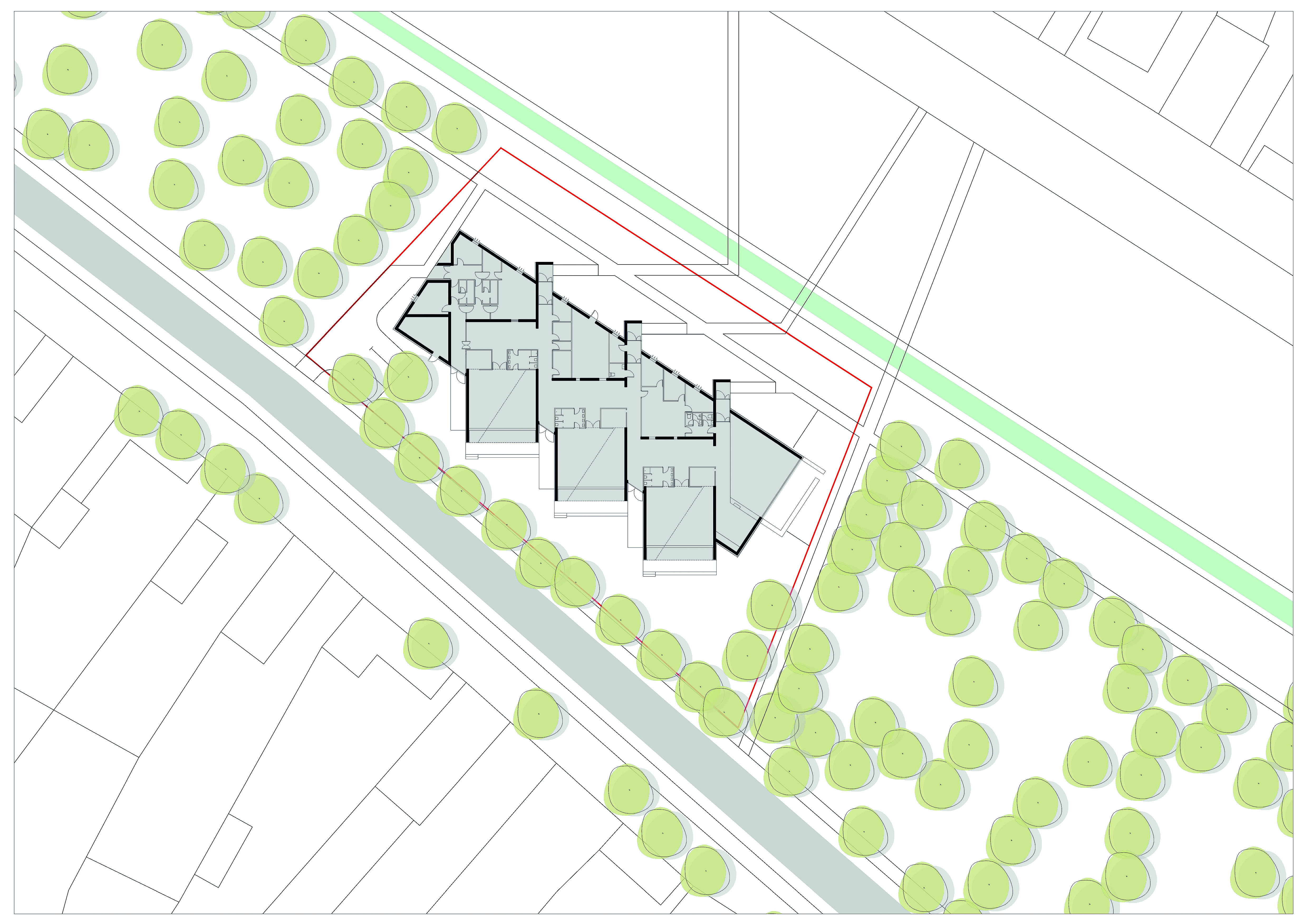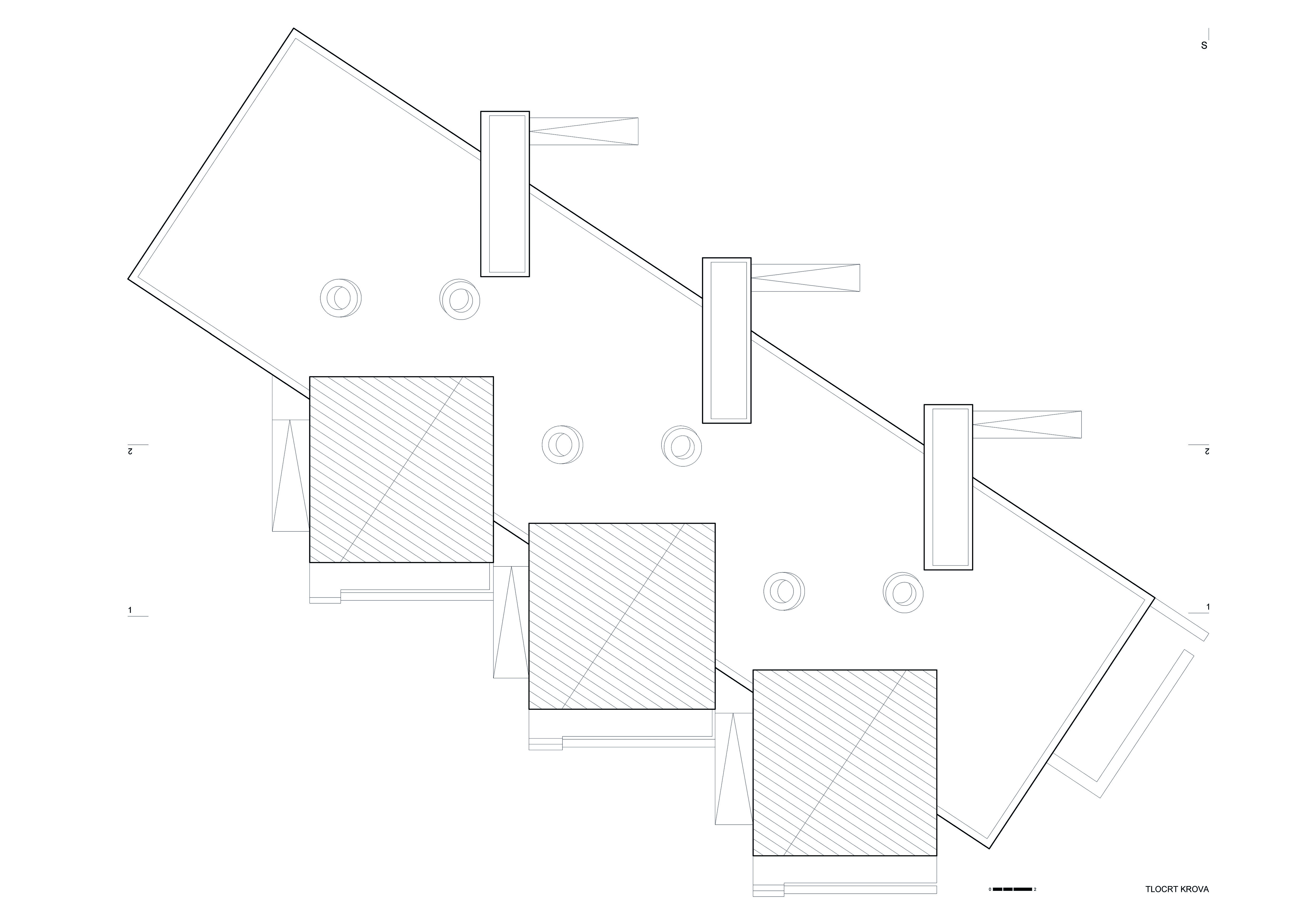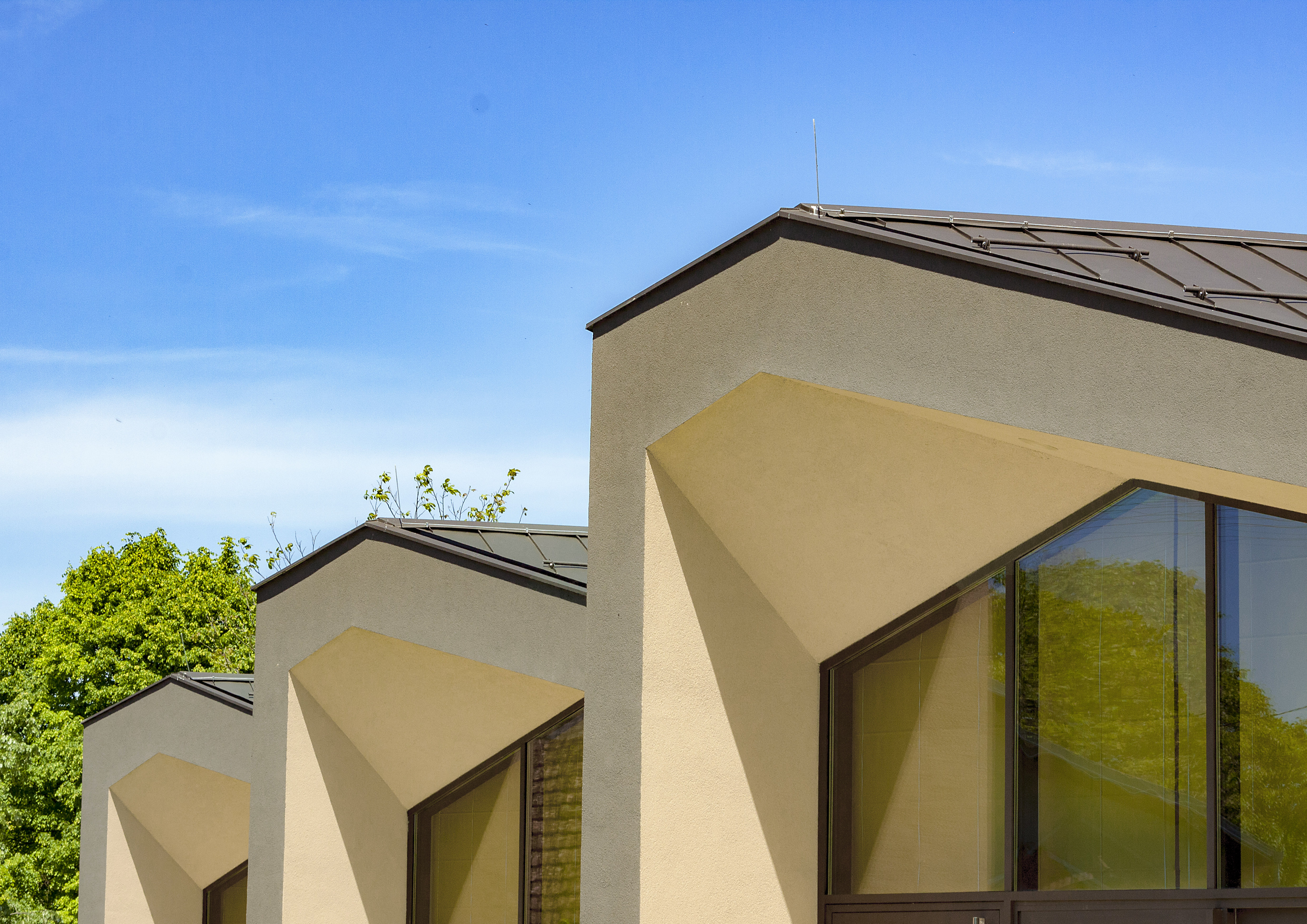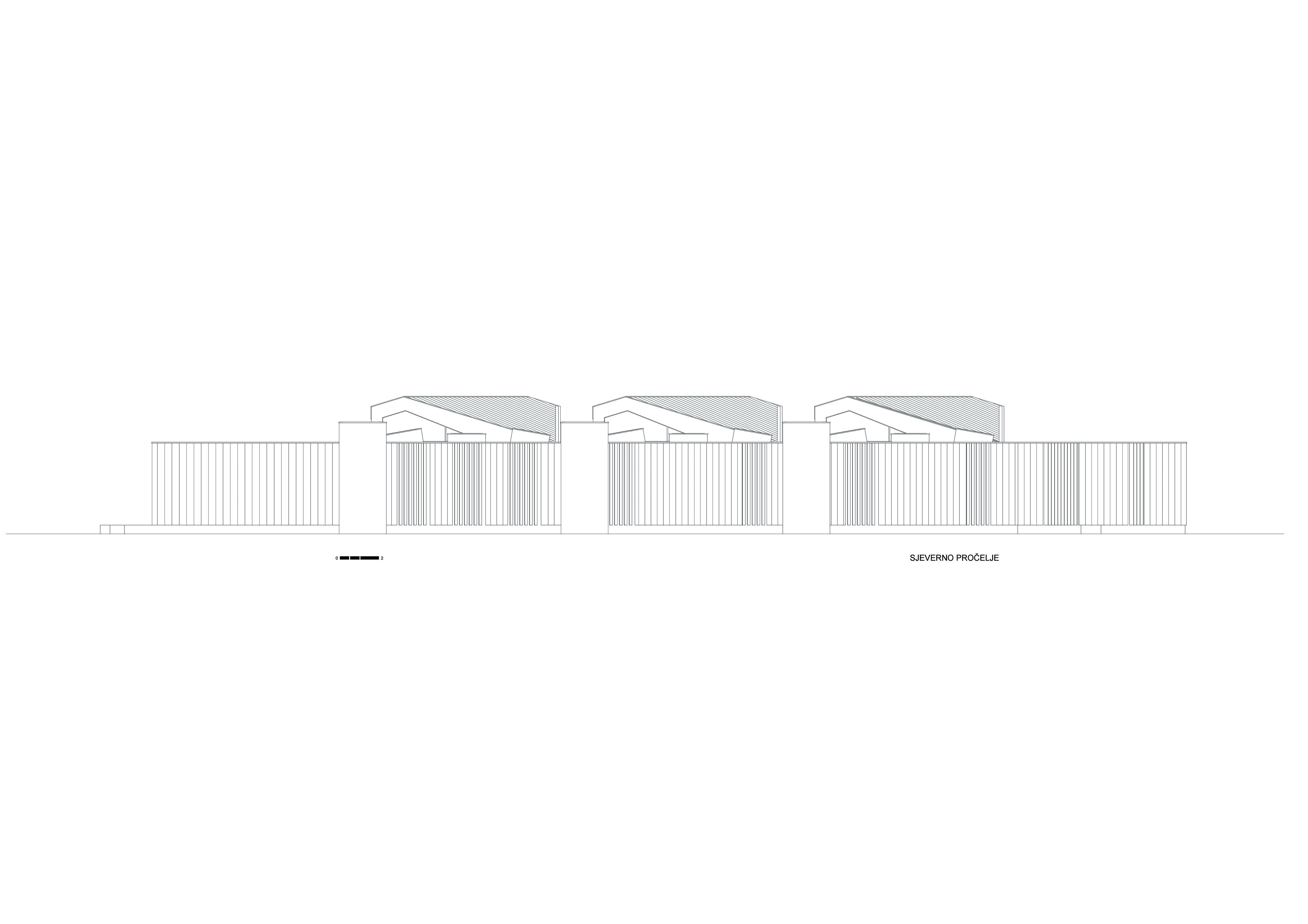 Na jugozapadnoj strani su vrtićke jedinice, nepravilno postavljene u odnosu na centralni volumen i raster ulice zbog zadane orijentacije. Skošenjem sljemena poštuje se ritam tradicionalne gradnje – sljeme okomito na regulacijski pravac.
