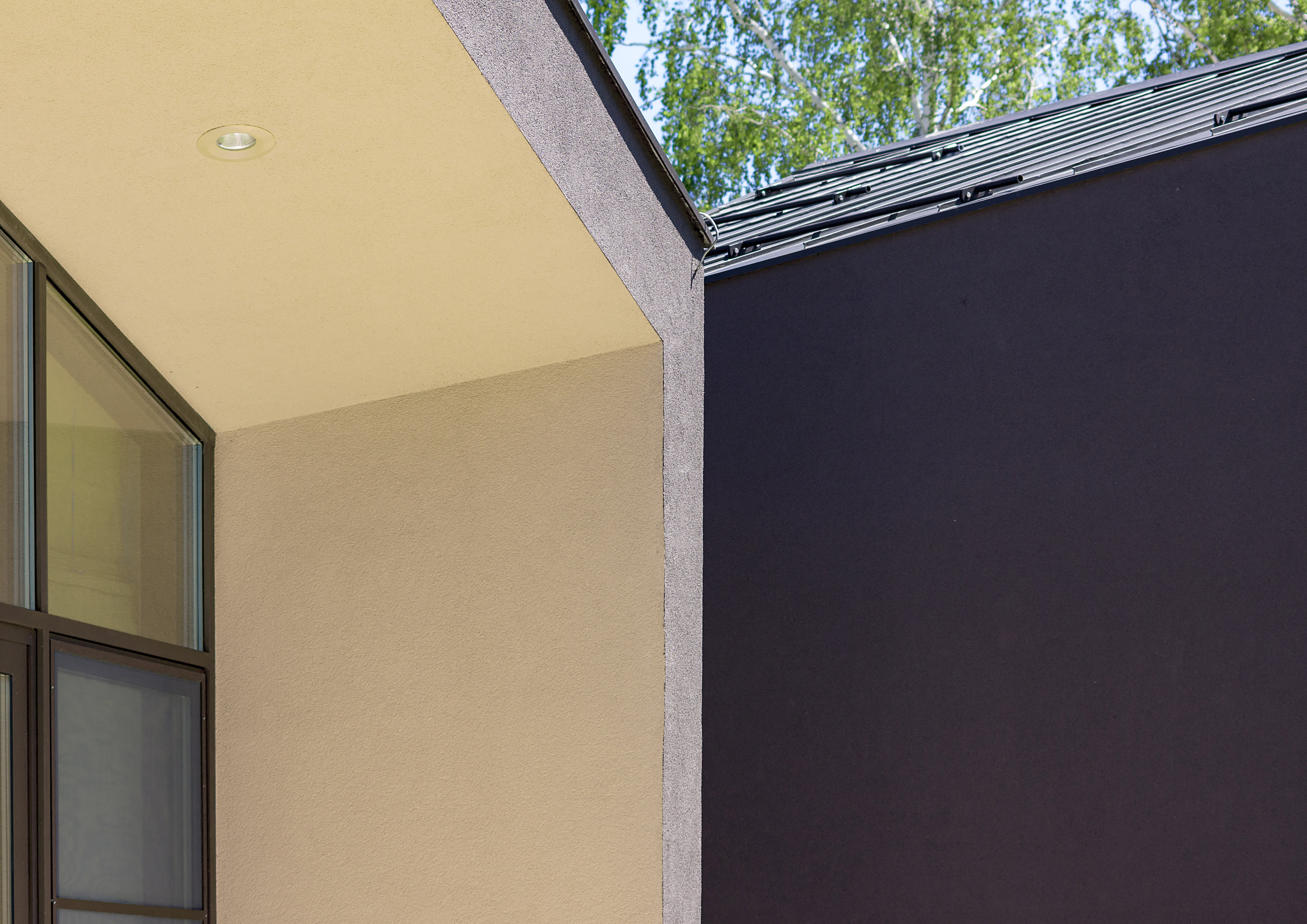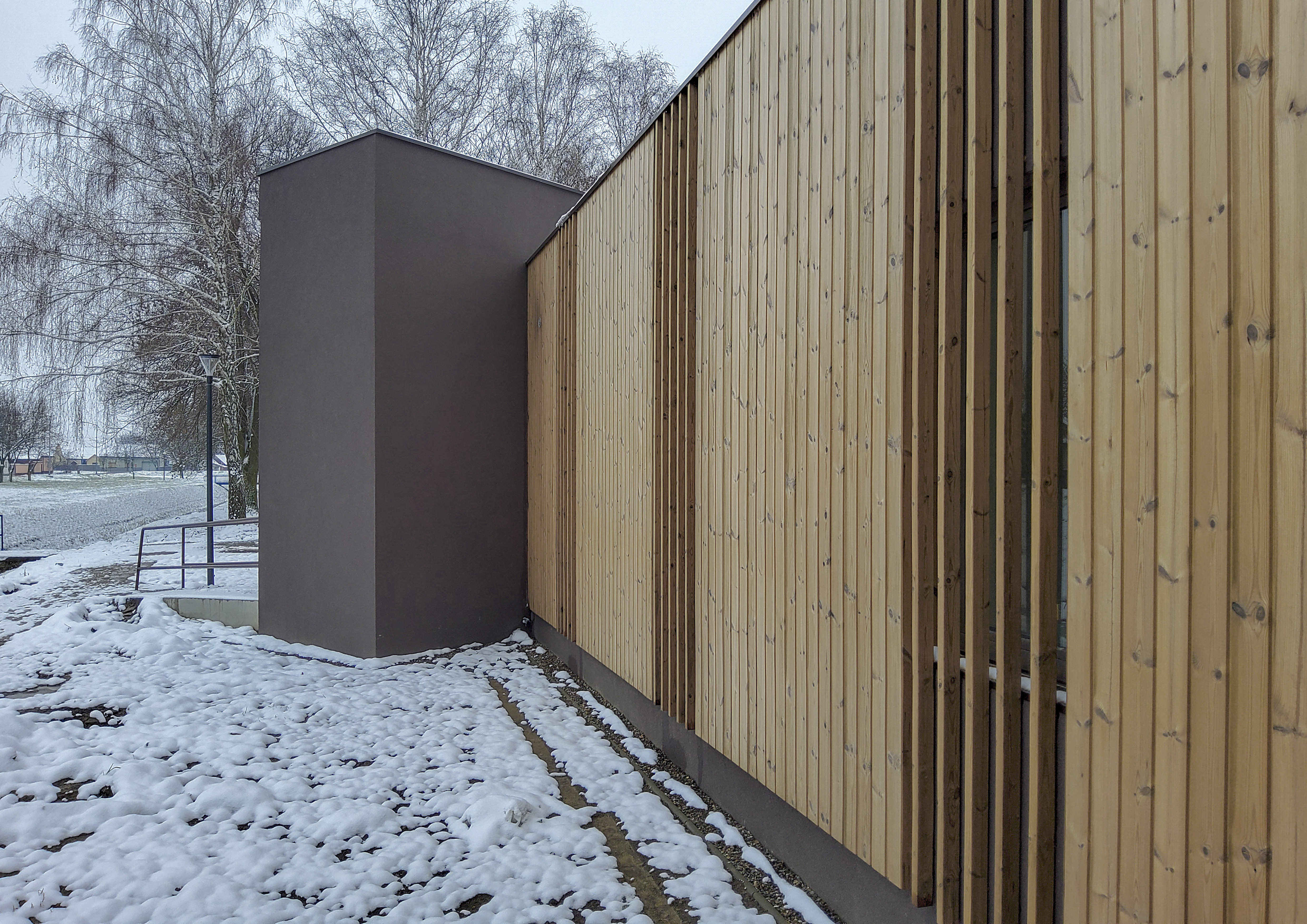 Centralni volumen je pravilan, obložen vertikalnom drvenom oblogom (drvena ograda česti je lokalni element) koja na mjestima otvora prelazi u brisoleje. Otvori su u drugom planu, a vanjska obloga neprekinuta.