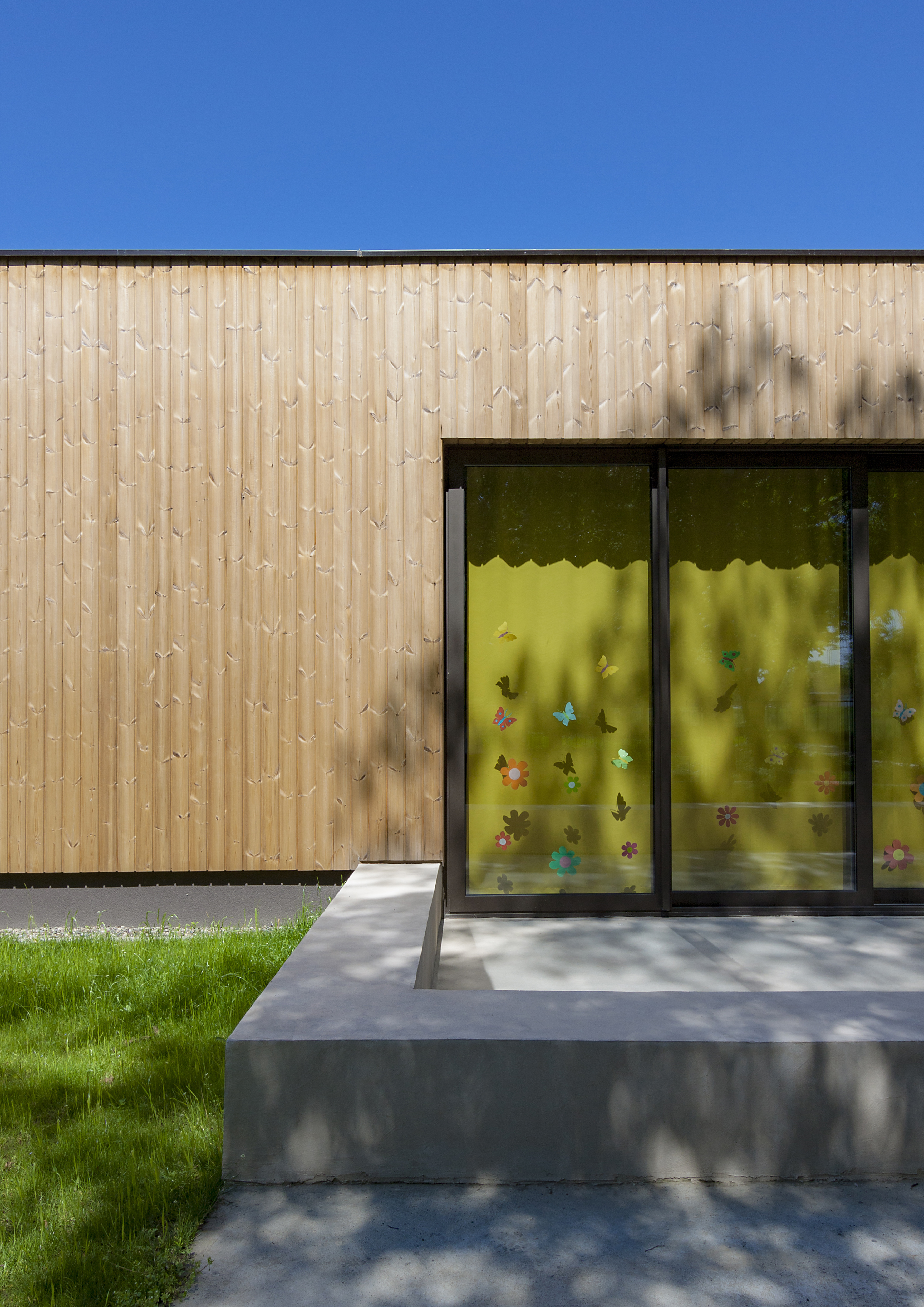 Na sjeveroistočnoj strani su tri volumena ulaza, u istom ortogonalnom sustavu kao vrtićke jedinice, odvojeni po različitoj funkciji: ulaz u jaslice, dječji vrtić i ulaz odgojitelja.