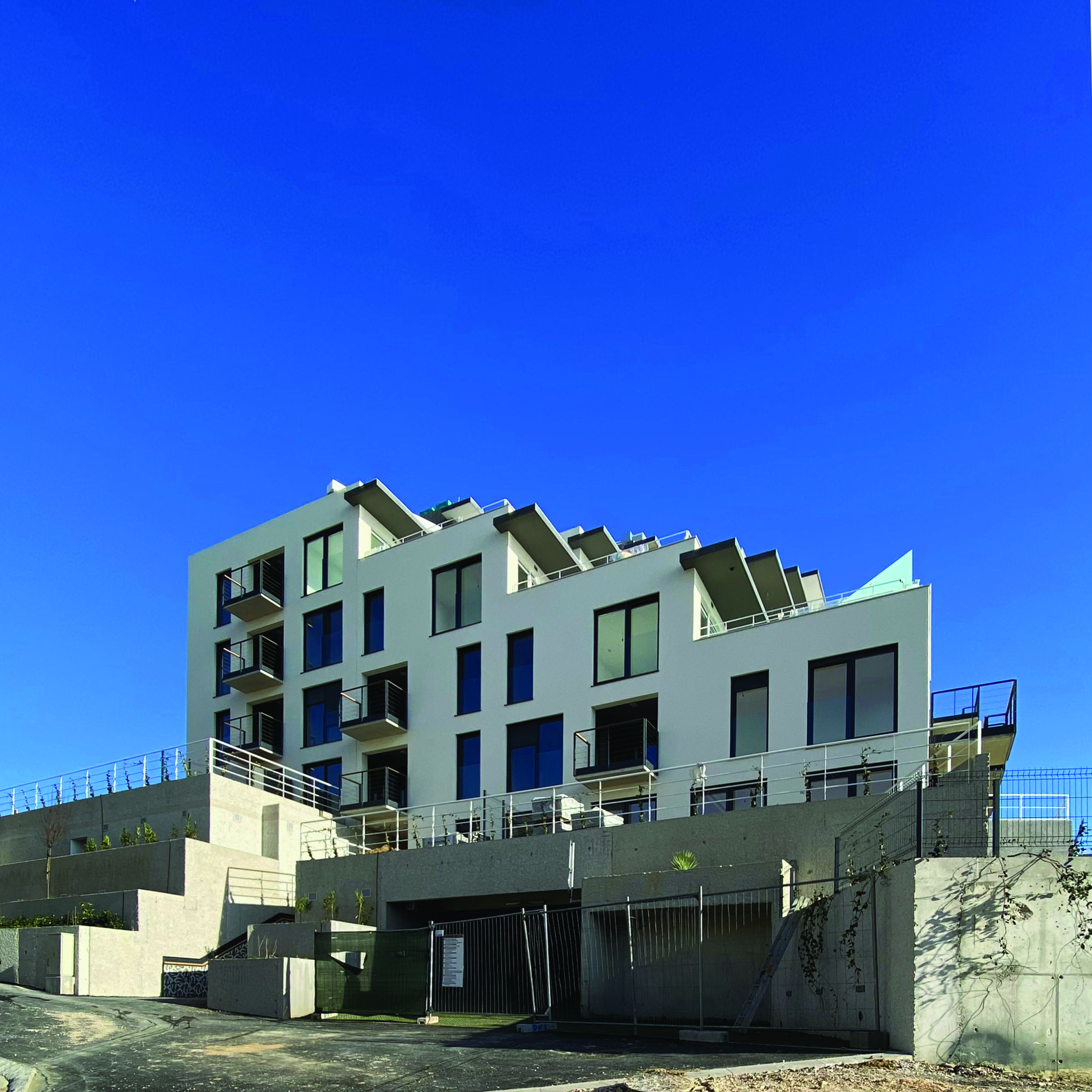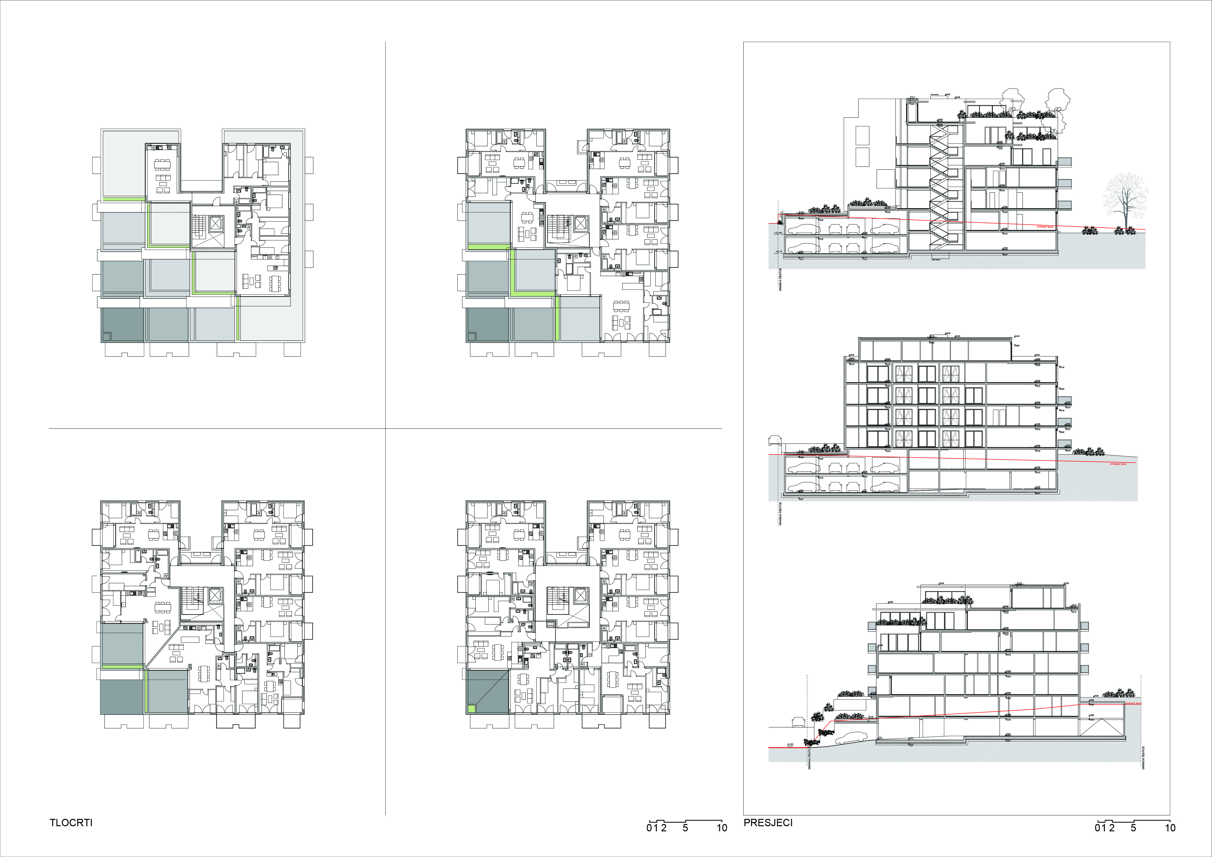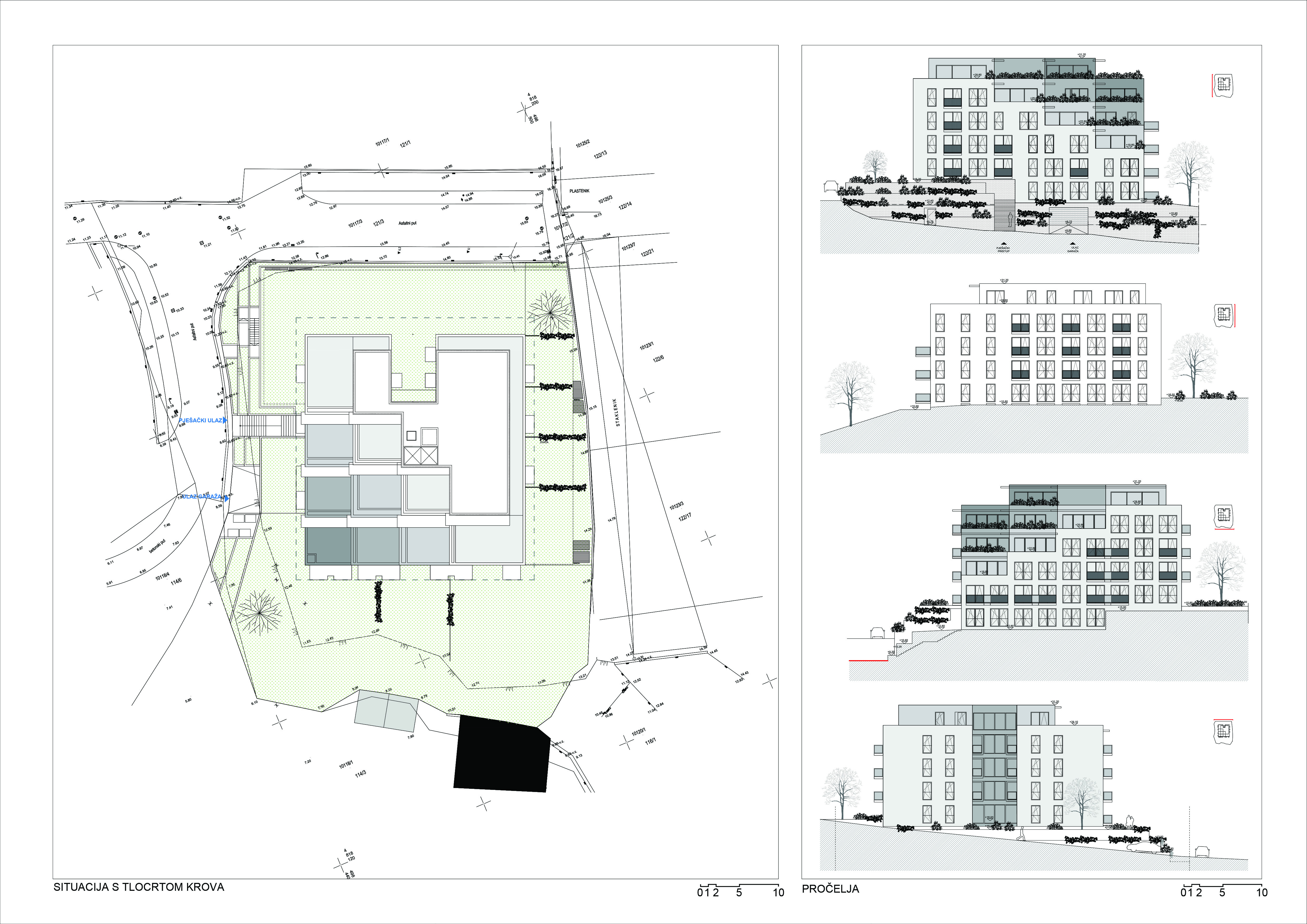 Lokacijskim uvjetima definirana je duboka kvadratna zona gradnje, potpuno neprikladna za stambenu namjenu. Istovremeno je predmetna parcela u znatnom nagibu prema jugozapadu. Urbanistički je ekstrudirani zadani volumen presložen u formu koja prati nagib terena, istovremeno stvarajući kaskadni krov sa stambenim terasama i "penthouse" stambenim prostorima. Ovom odlukom, umjesto ravnog, krov je atomiziran terasama stanova, formirajući vanjske terase/prostore stanova. U konačnici je kreirana "nagnuta tepih-kuća". Organizacija objekta je oko zenitalno osvijetljenog centralnog atrija s vertikalnim komunikacijama koji formira "zajednički prostor stanara". Pročelja slijede osnovnu ideju kuće. Strukturirana su kvadratnim otvorima, kreirajući neutralni repetitivni "uzorak" fasadnog platna koji se "mota" oko volumena objekta.