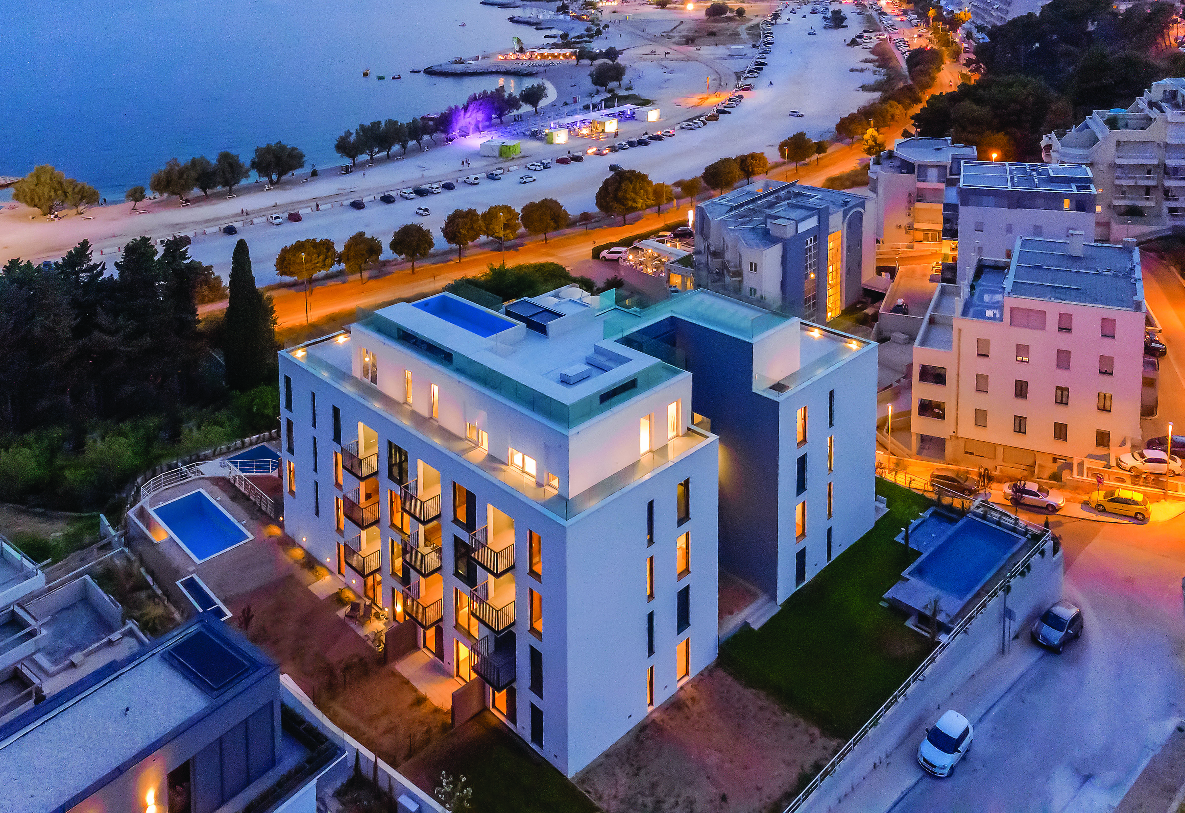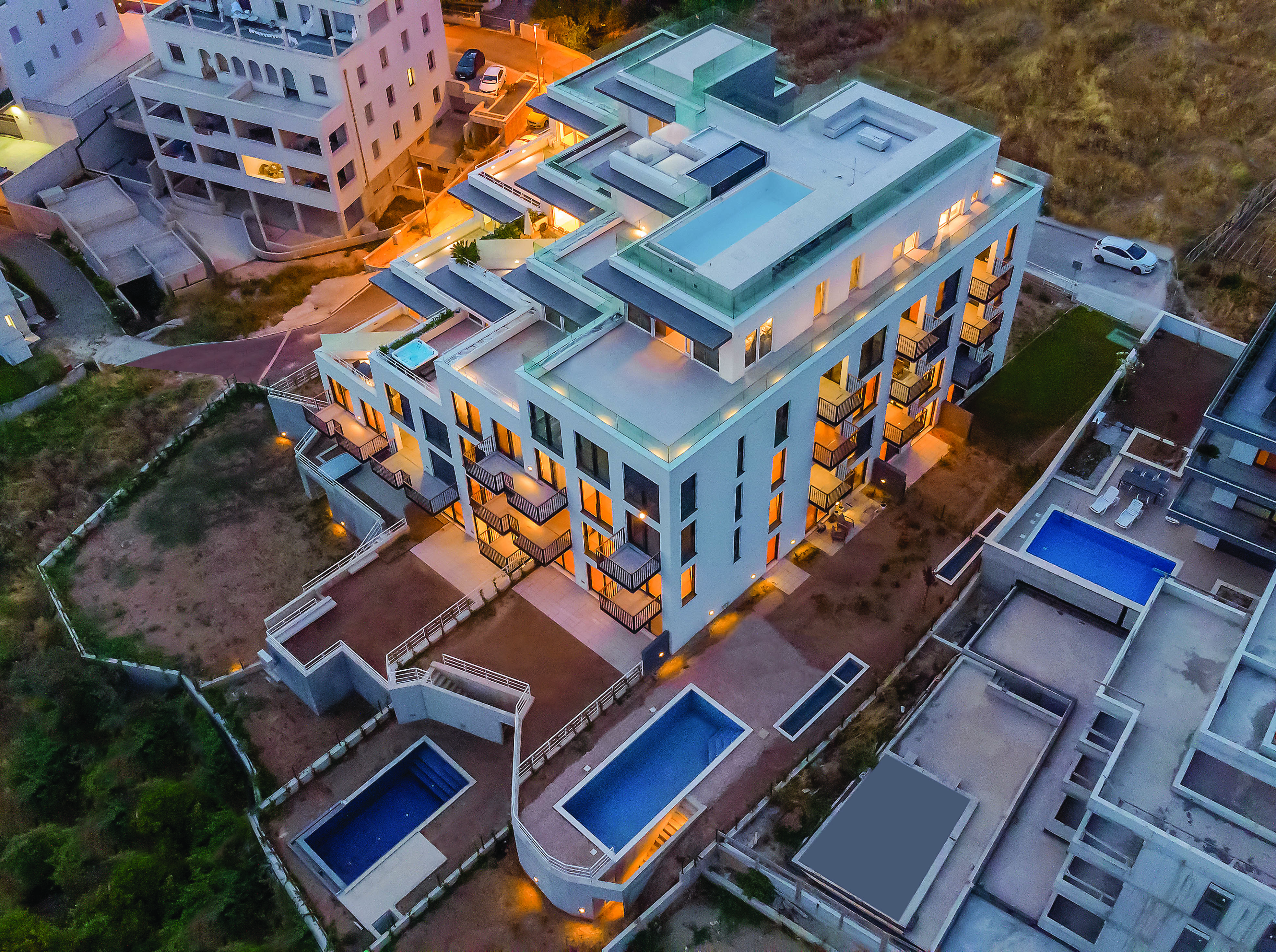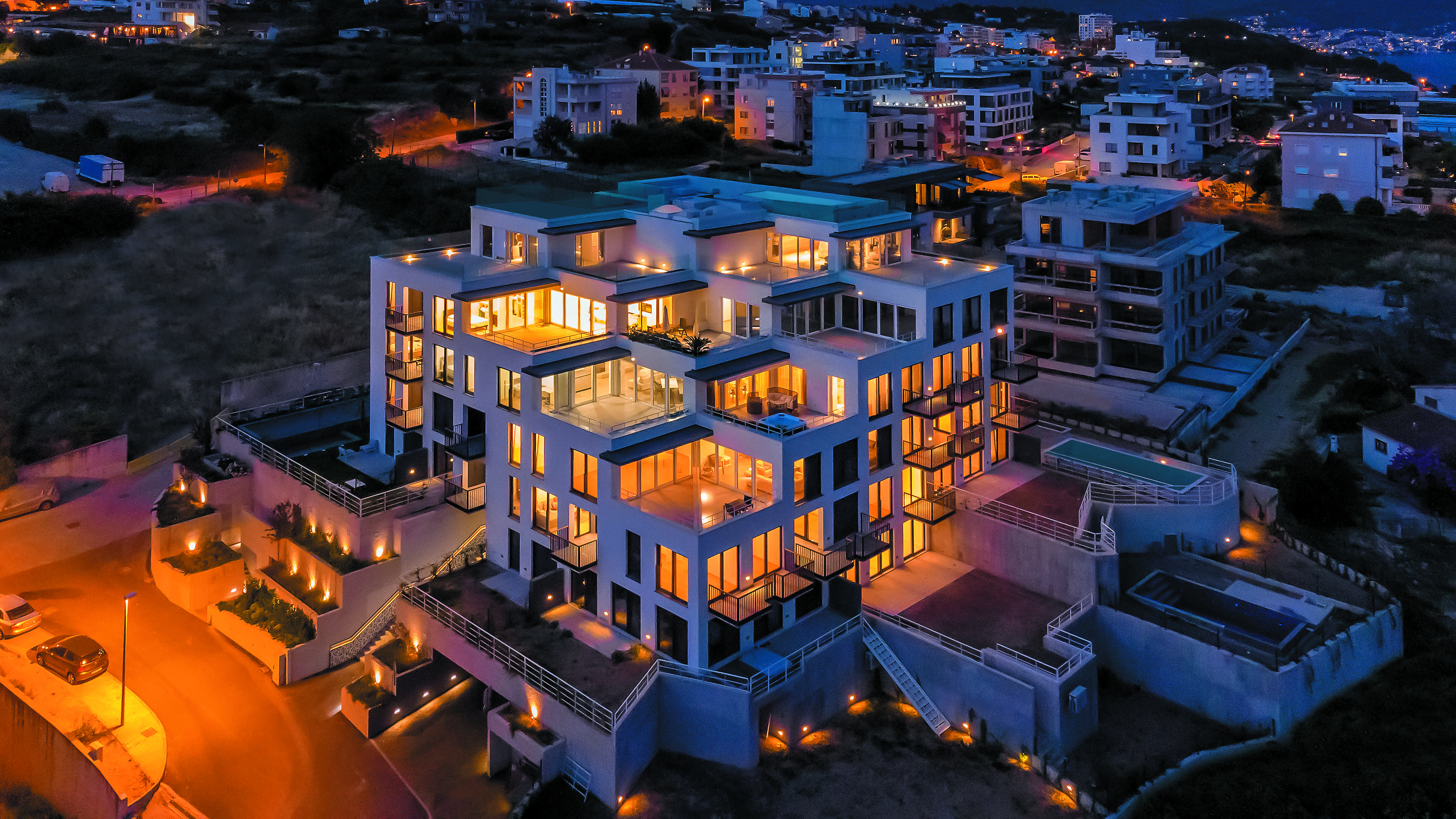 Lokacijskim uvjetima definirana je duboka kvadratna zona gradnje, potpuno neprikladna za stambenu namjenu. Istovremeno je predmetna parcela u znatnom nagibu prema jugozapadu. Urbanistički je ekstrudirani zadani volumen presložen u formu koja prati nagib terena, istovremeno stvarajući kaskadni krov sa stambenim terasama i "penthouse" stambenim prostorima. Ovom odlukom, umjesto ravnog, krov je atomiziran terasama stanova, formirajući vanjske terase/prostore stanova. U konačnici je kreirana "nagnuta tepih-kuća". Organizacija objekta je oko zenitalno osvijetljenog centralnog atrija s vertikalnim komunikacijama koji formira "zajednički prostor stanara". Pročelja slijede osnovnu ideju kuće. Strukturirana su kvadratnim otvorima, kreirajući neutralni repetitivni "uzorak" fasadnog platna koji se "mota" oko volumena objekta.