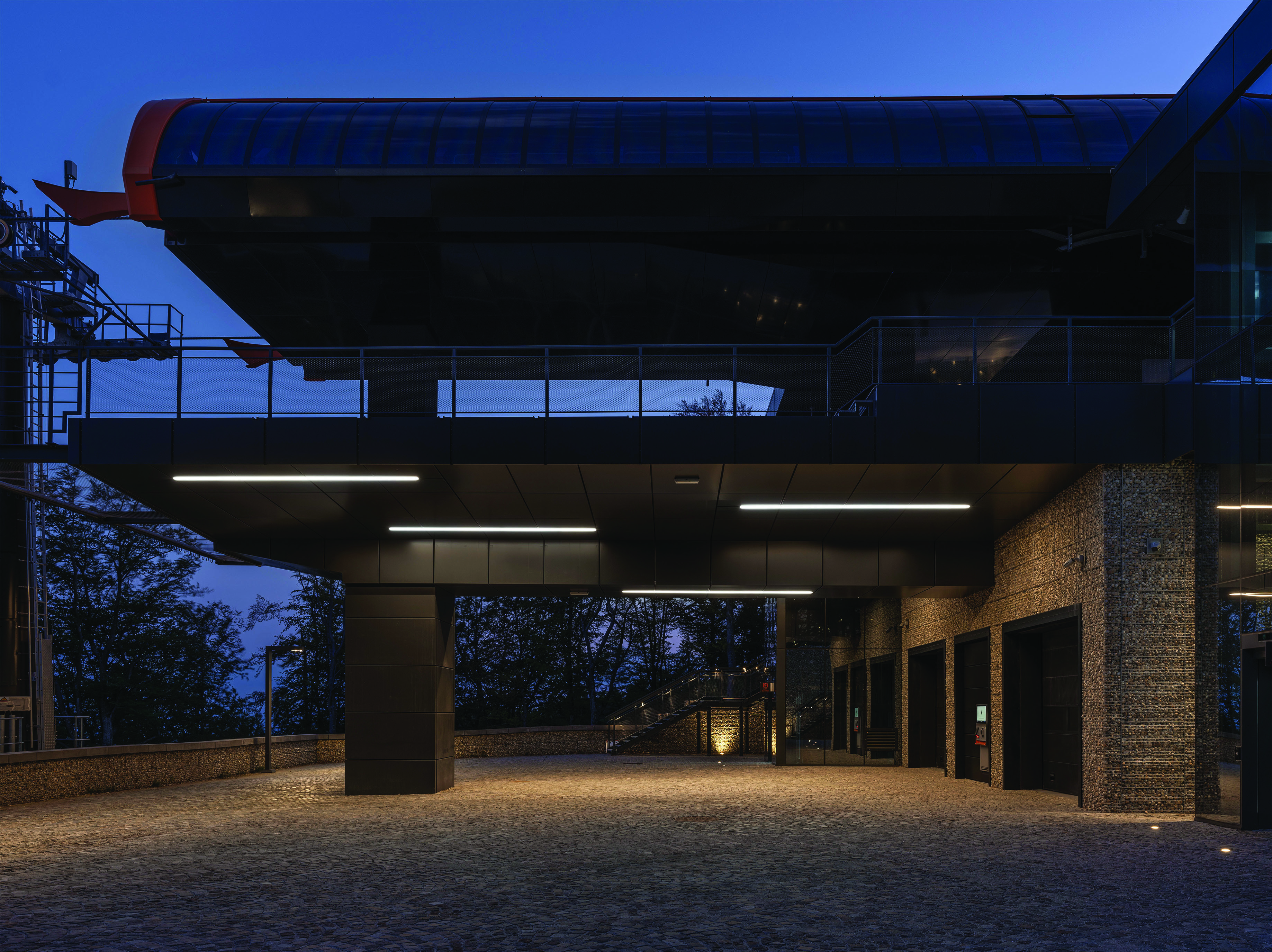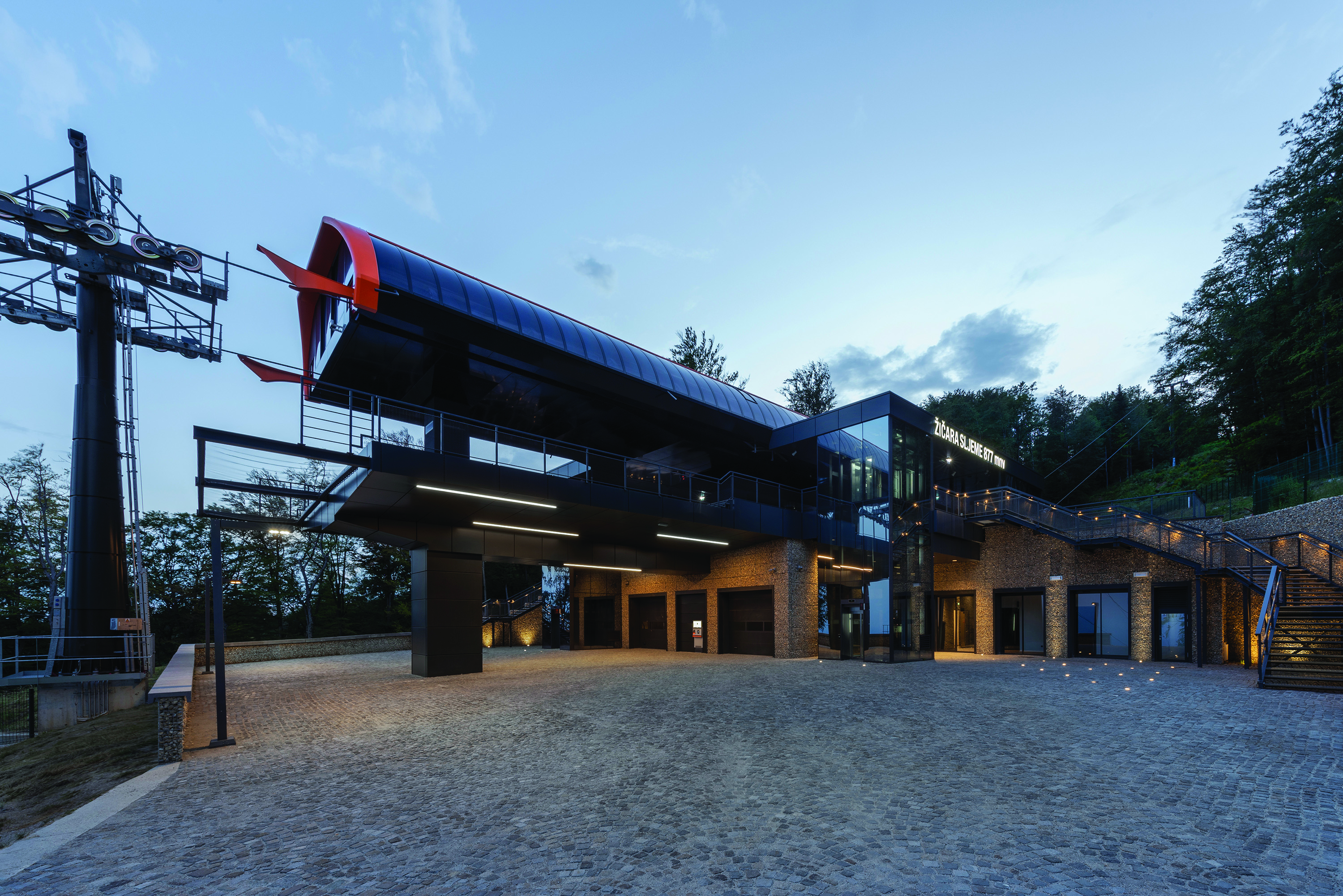 Između kubusa s dizalima, na trasi žičare, smješten je volumen oblika tube u kojoj se nalazi peronski mehanizam za manipulaciju kabinama za ukrcaj i iskrcaj putnika.