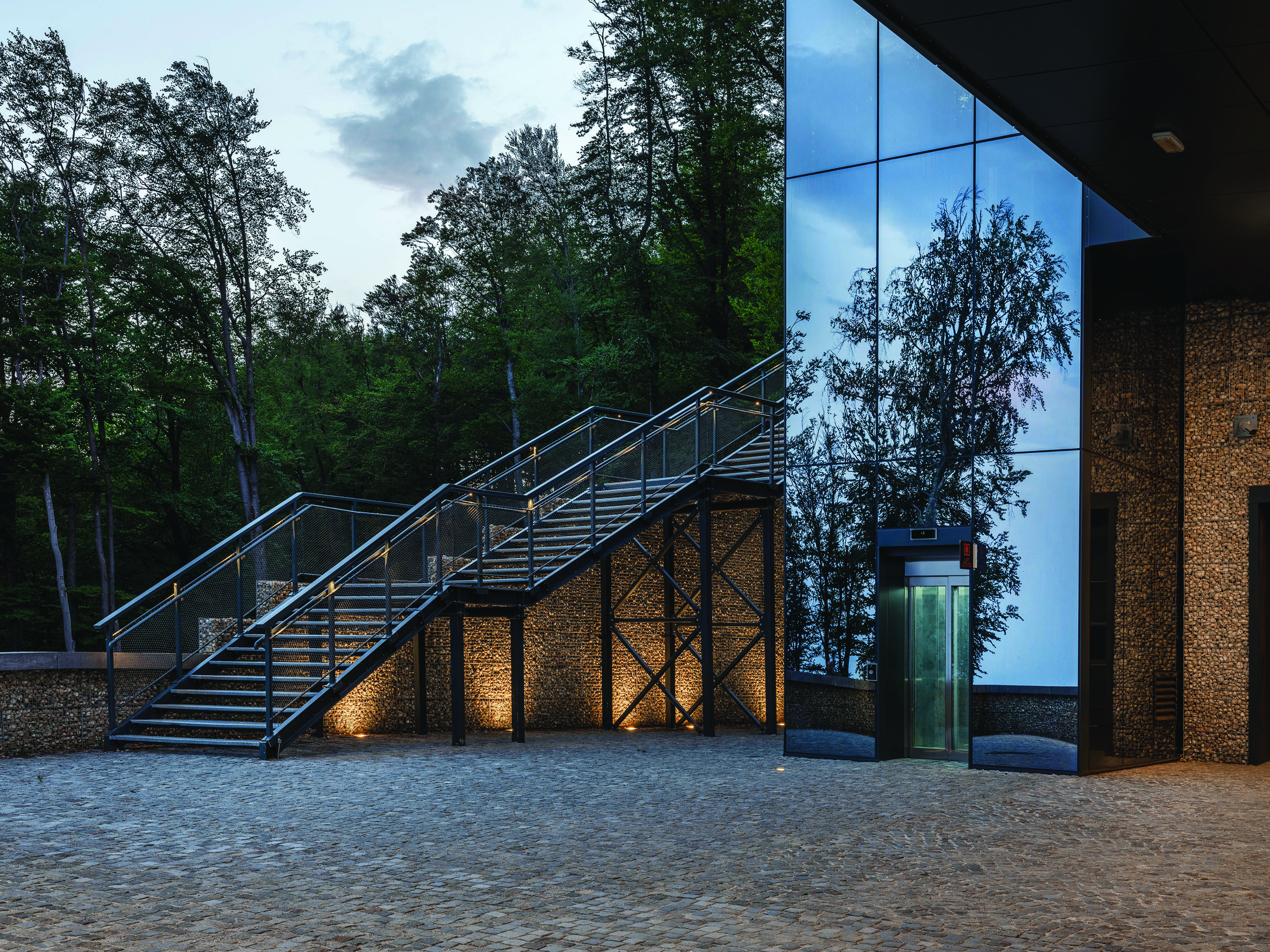 Otvorena stubišta su pozicionirana na rubove pristupnog platoa koji je završno obložen kamenim kockama. Konstrukcija stubišta je čelična s gazištima izvedenim od prozračne čelične rešetke.