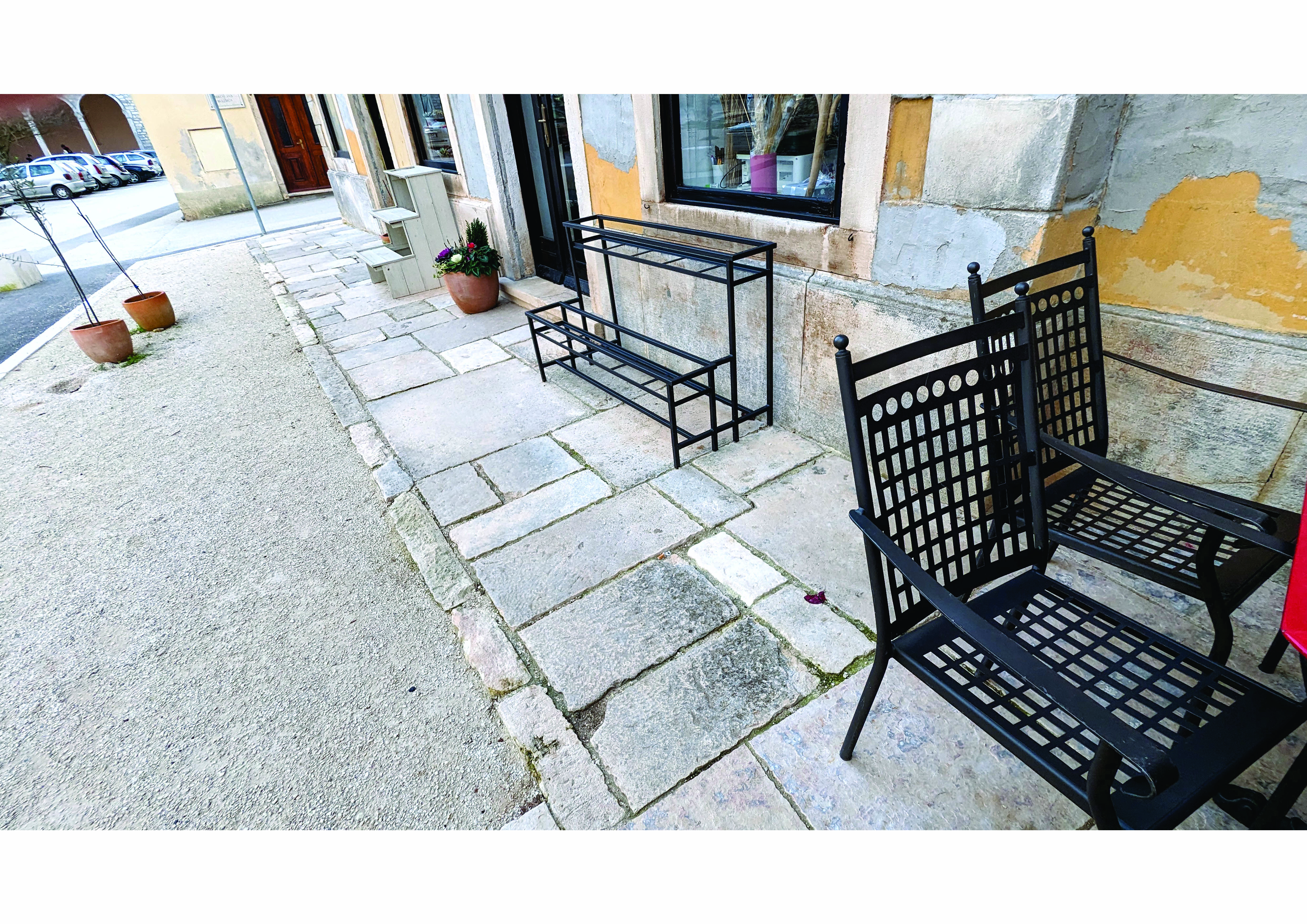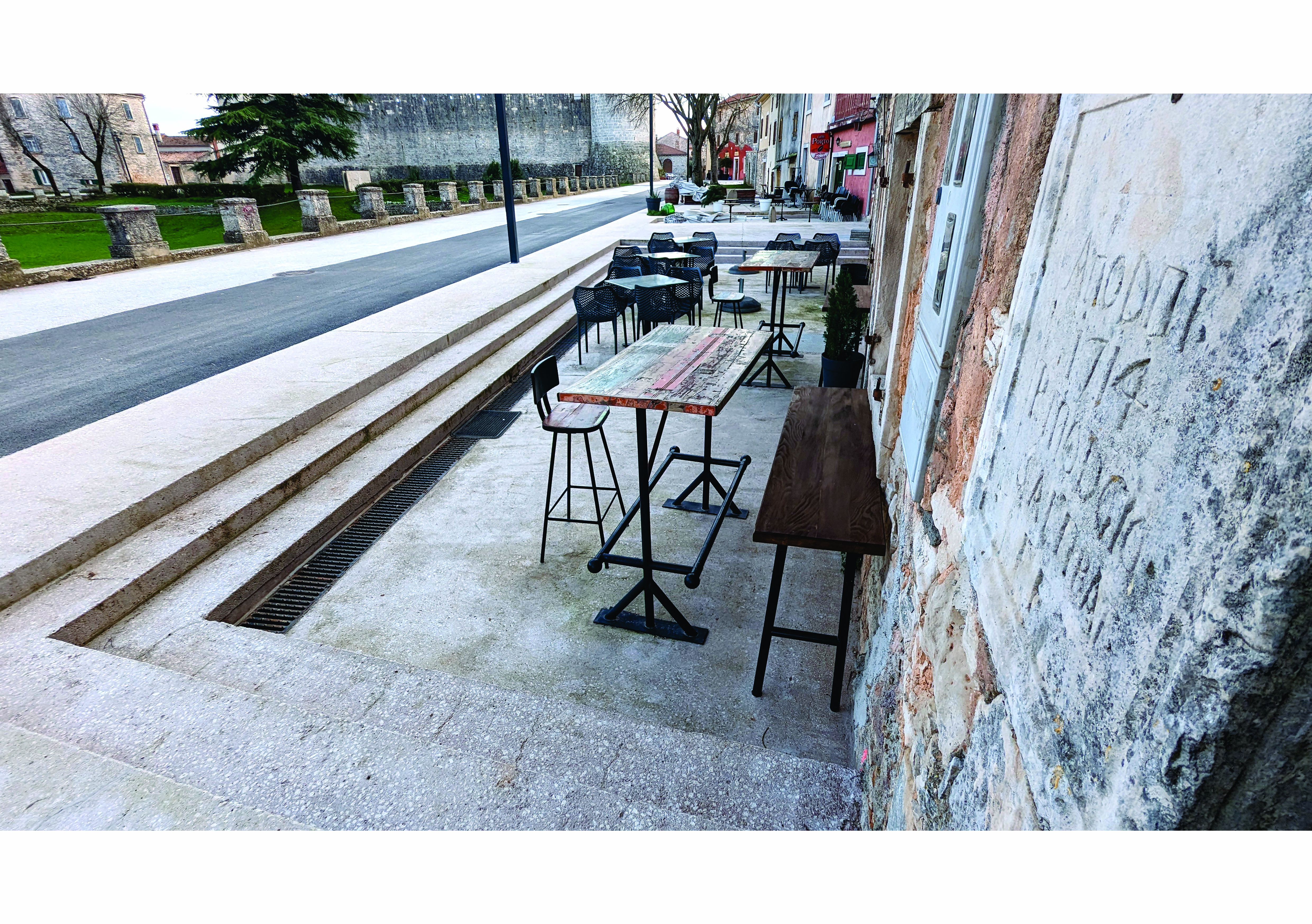 Predloženim rješenjem duž prometnice se formira „prijelazna zona“ izvedena u bušenom betonu neutralnog izgleda, vidljive teksture, u ravnini s prometnicom. Na dijelovima gdje je to bilo moguće zadržano je povijesno opločenje kamenim pločama. Zone partera koje ne spadaju ni u tradicionalno popločenje ni „ugostiteljsku zonu“ obrađene su „stabilizierom“, kombinacijom cementa i sitnog tucanika. Sva postojeća stabla su zadržana, a oko njih razmještena je nekolicina tipskih betonskih blokova za sjedenje.