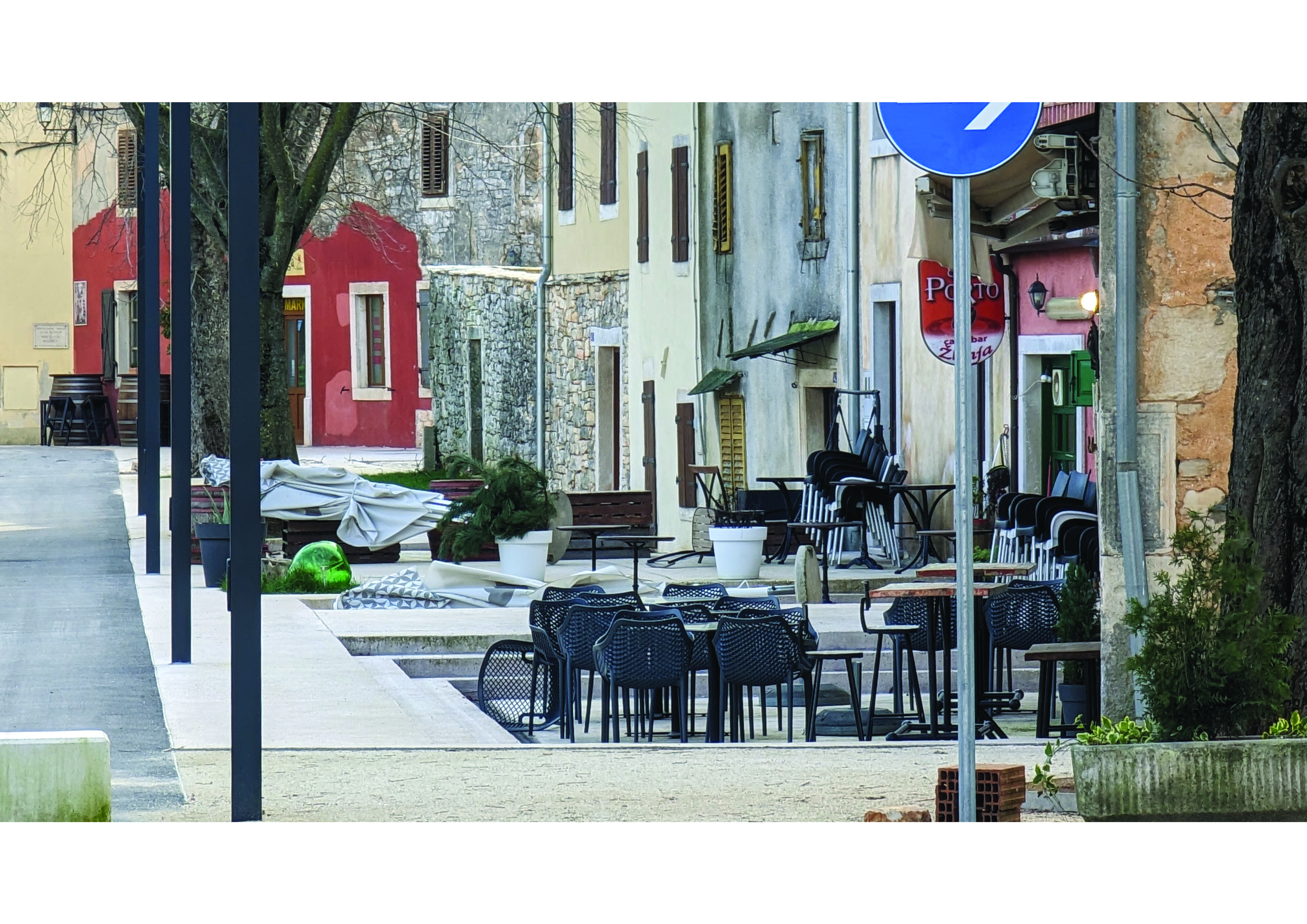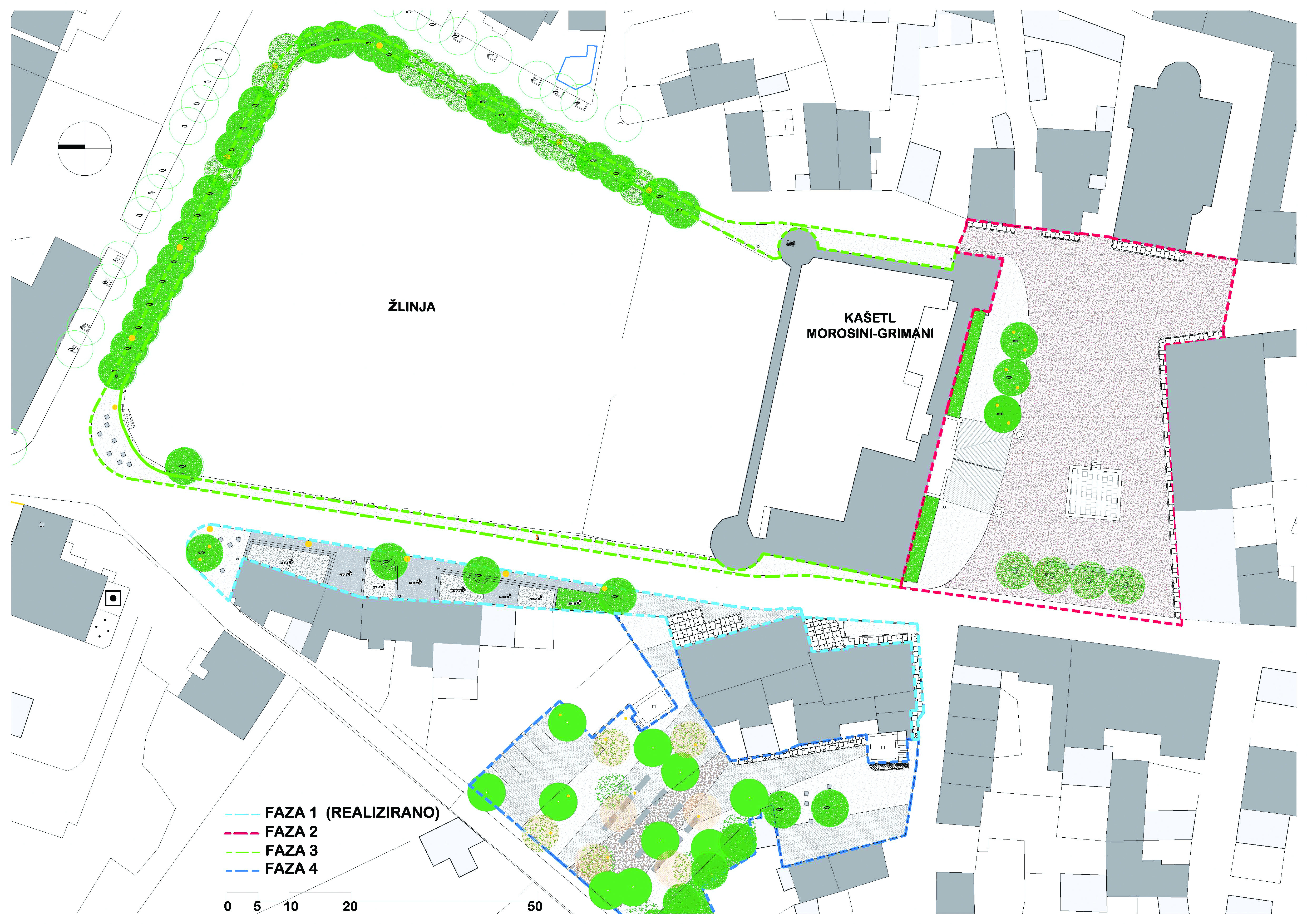 Prva faza obuhvatila je uređenje partera na potezu zapadno od glavne ulice, Žlinje i Kaštela Morosini Grimani, ispred kuća i ugostiteljskih objekata. Zapadni niz uz glavnu ulicu čini sitna gradnja s malim dvorištima koja su tijekom vremena pretvorena u terase ugostiteljskih objekata. Ulazi u objekte su na različitim visinama zbog čega i kote terasa variraju.