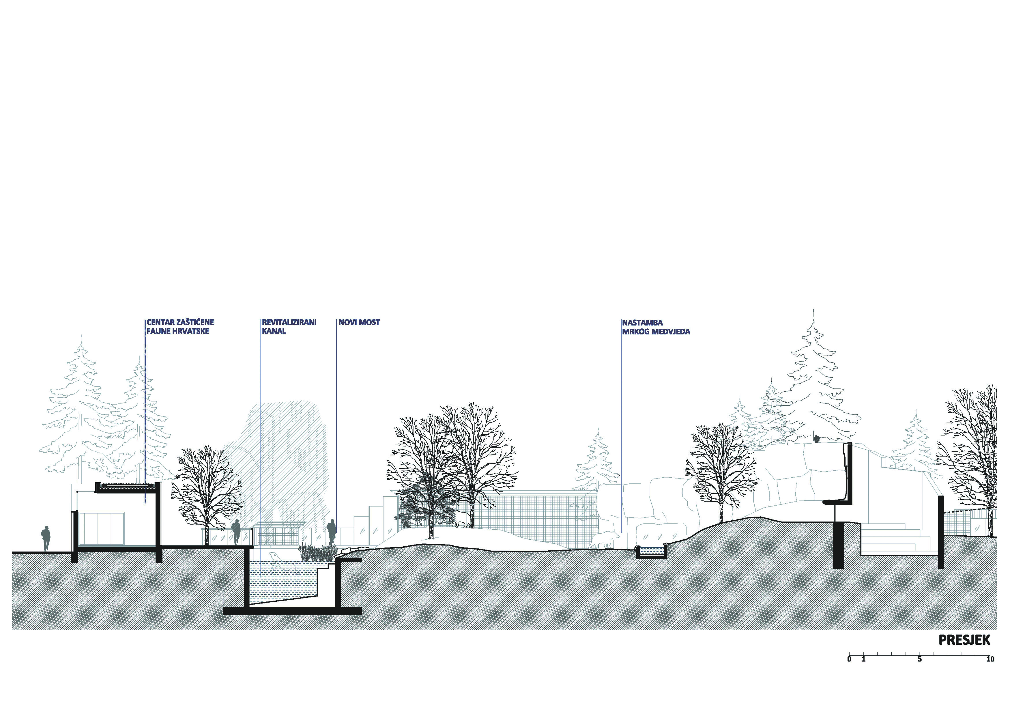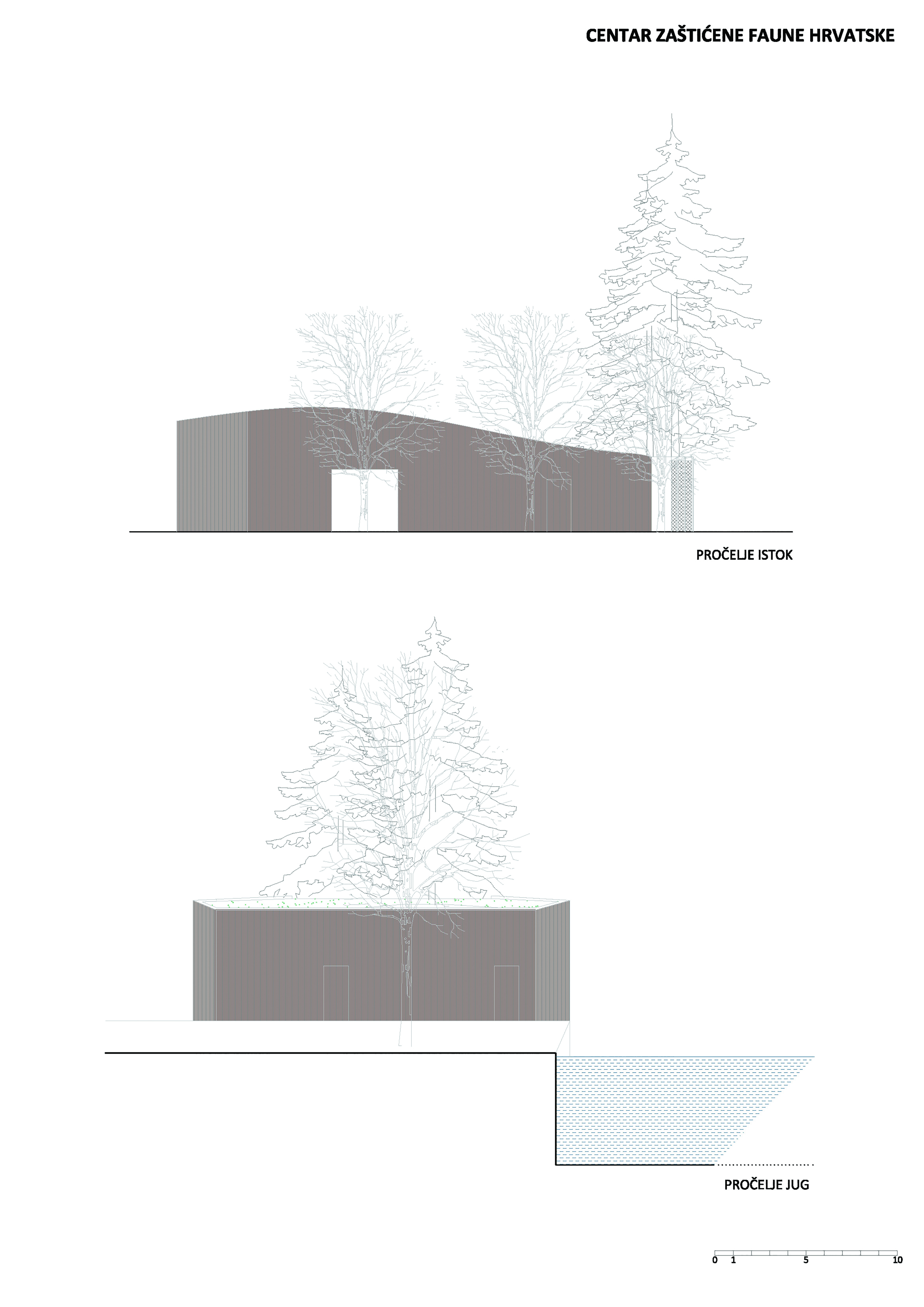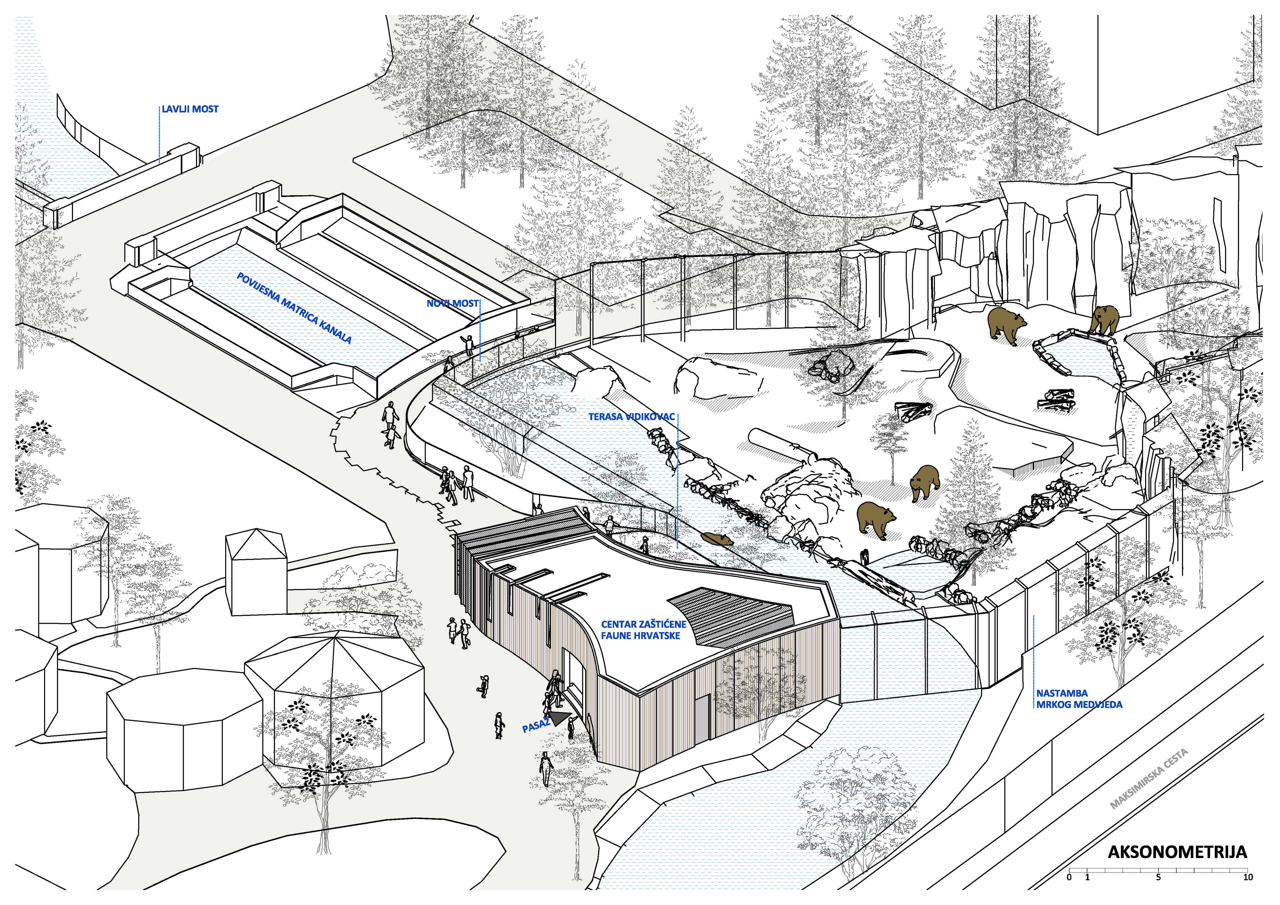 Centar Zaštićene faune Hrvatske nalazi se u kontaktnom području urbanog i visoko vrijednog zelenog tkiva Zagreba, unutar Zoološkog dijela Parka Maksimir, tangirajući kanal velikog Maksimirskog jezera. Na lokaciji nekadašnje neugledne građevine „ptičarije za močvarice“ stvorena je višesmjerna, konkavna kuća koja nenametljivo obavlja nekoliko zadanih joj „taskova“. Ta mrka kuća (obloga paljeno drvo) artikulirana je kao mjesto pozivanja, intrigiranja posjetioca i prolaznika, te uz educiranje i popratne sadržaje voliere ptica pjevica i šumskih vjeverica, prožimanjem unutarnjeg i vanjskog preko pasaža vodi znatiželjnika na otvaranje neočekivanog pogleda. Novi doživljaj se stvara na terasi s pomalo vedutskom vizurom na duboku vodu revitaliziranog kanala i novu otvorenu nastambu mrkog medvjeda s drvećem, stijenama, slapom i jezercem, u zelenom srcu Grada.