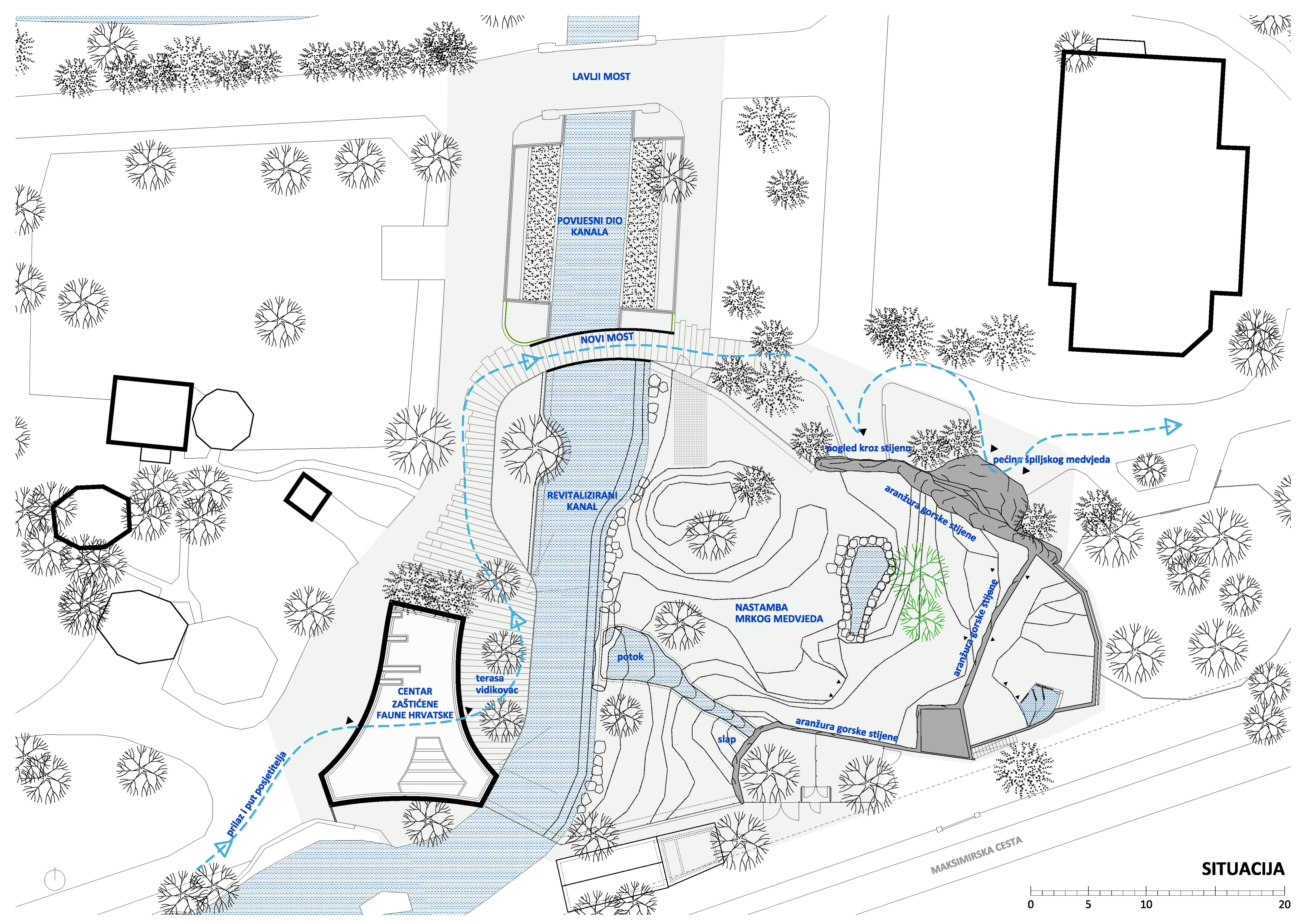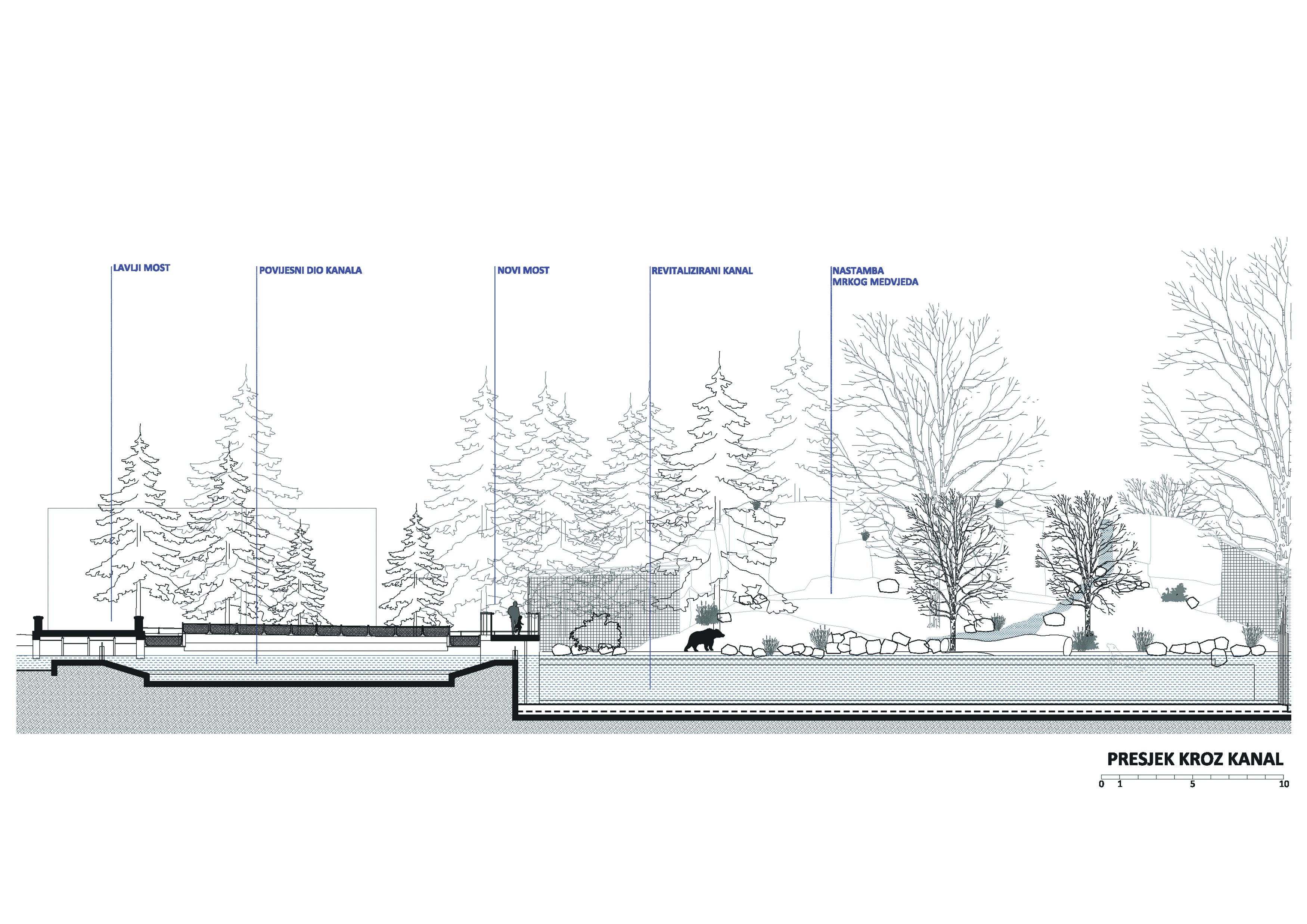 Vizualno bogat i prostorno saturiran krajolik ostaje uz promatrača dok ga intriga dalje vodi putem novog mosta preko kanala u fluidnom, besramno prilagodljivom obliku (statičari su ludjeli) s otoka na drugu obalu. Na mostu se može zastati i promatrati sjeverni dio zahvata koji je vraćen na povijesnu stoljetnu matricu izgledom i funkcijom, a preko kaskada gdje su dame 19. stoljeća sa suncobranima šetale, u punom sjaju se uspjelo prikazati sjaj parkovne arhitekture. S novog mosta puca pogled u osi zaštićenog Lavljeg i Čipkastog mosta direktno na „gospon Fulirov“ vidikovac. Sjever i zapadna obala pripada ljudima i urbanizmu, a jug zahvata najmoćnijoj životinji „Zvjerinjaka“. Teritorij projekta tu ne prestaje naglo, već kao što drvena podna obloga postepeno nestaje u asfaltnoj bazi Zoo mreže puteva tako i šetač završno može kroz stakleno okno doživjeti medu iz blizine, a potom prolazi i arheološki edukativnu medvjeđu špilju.