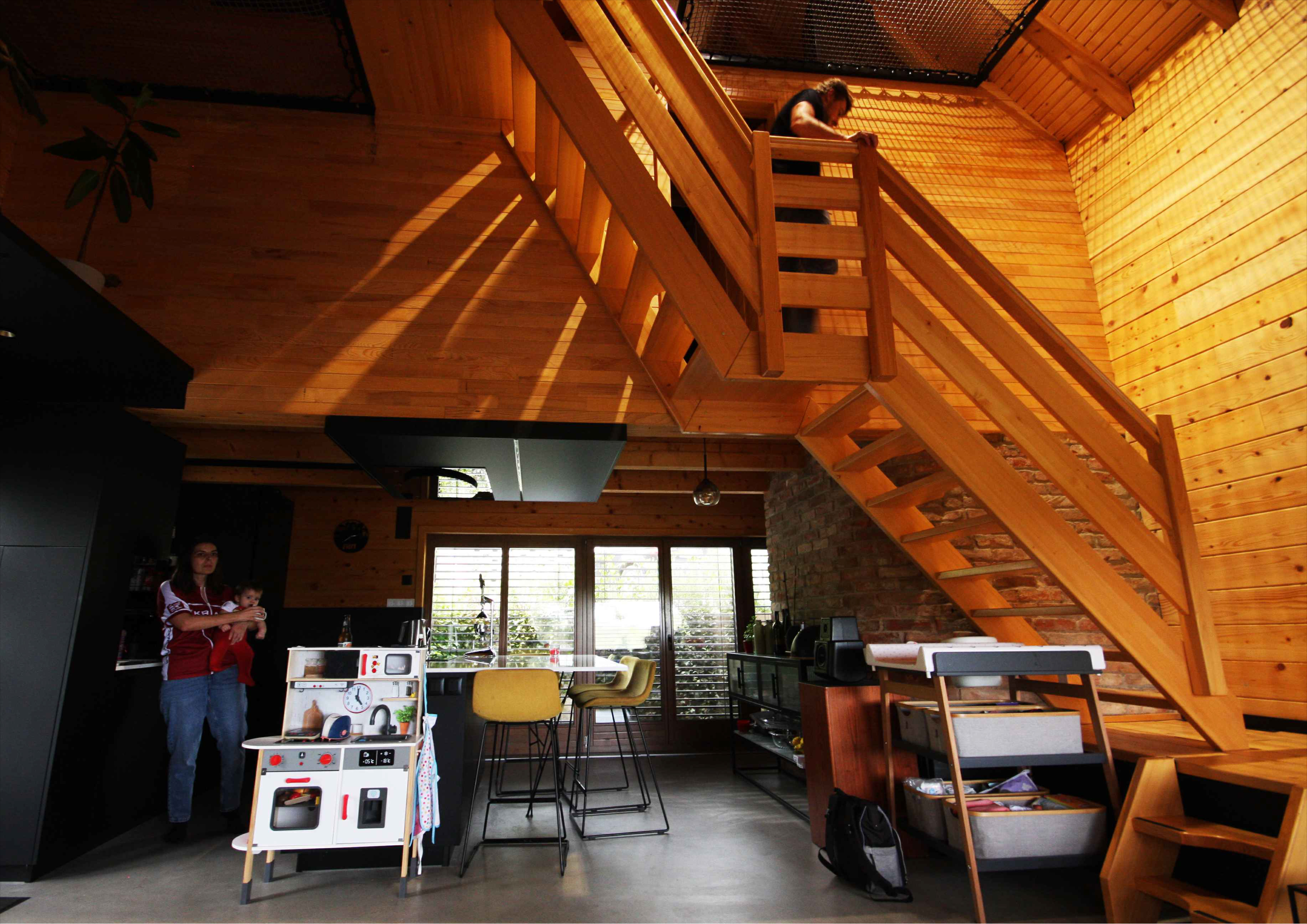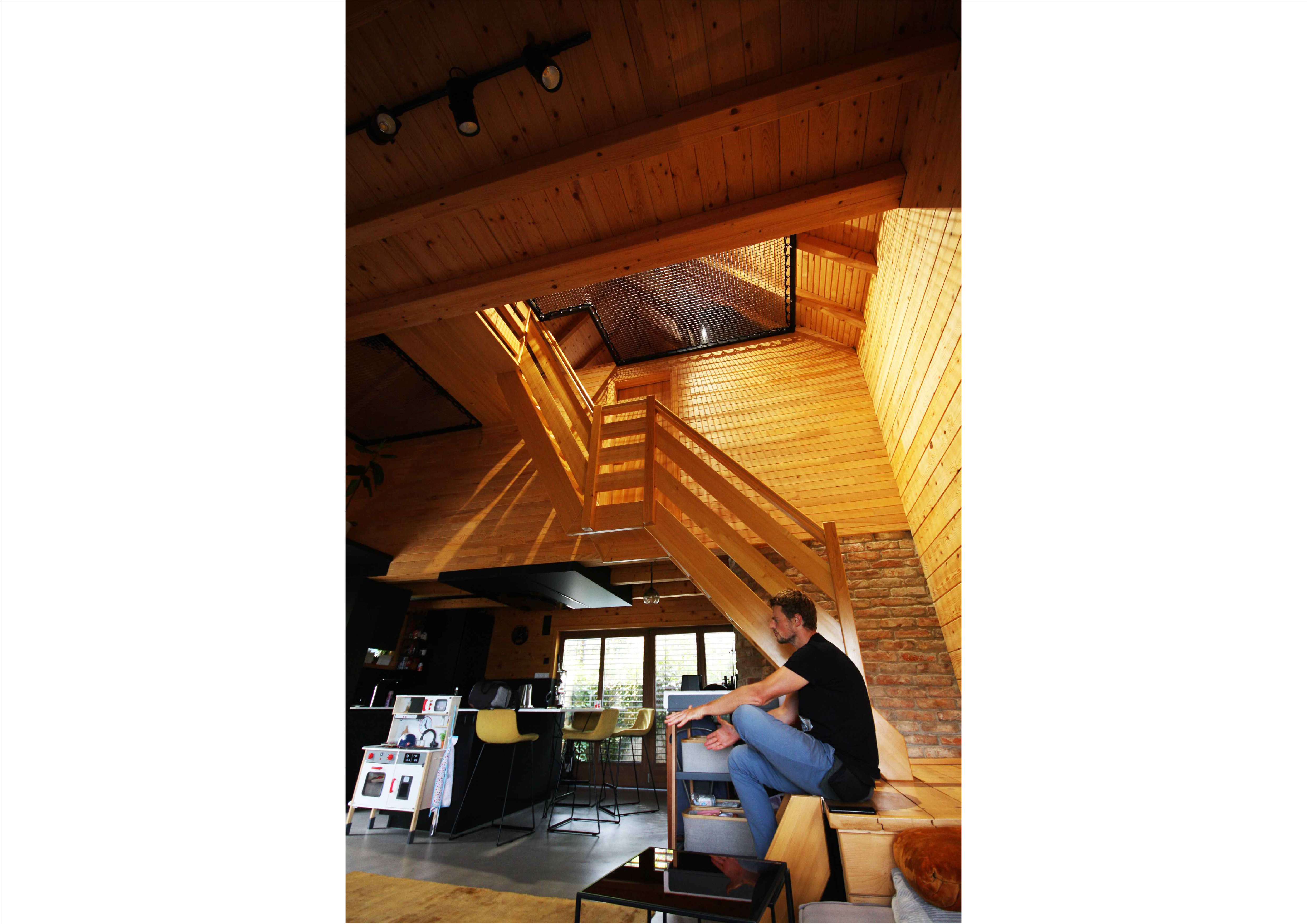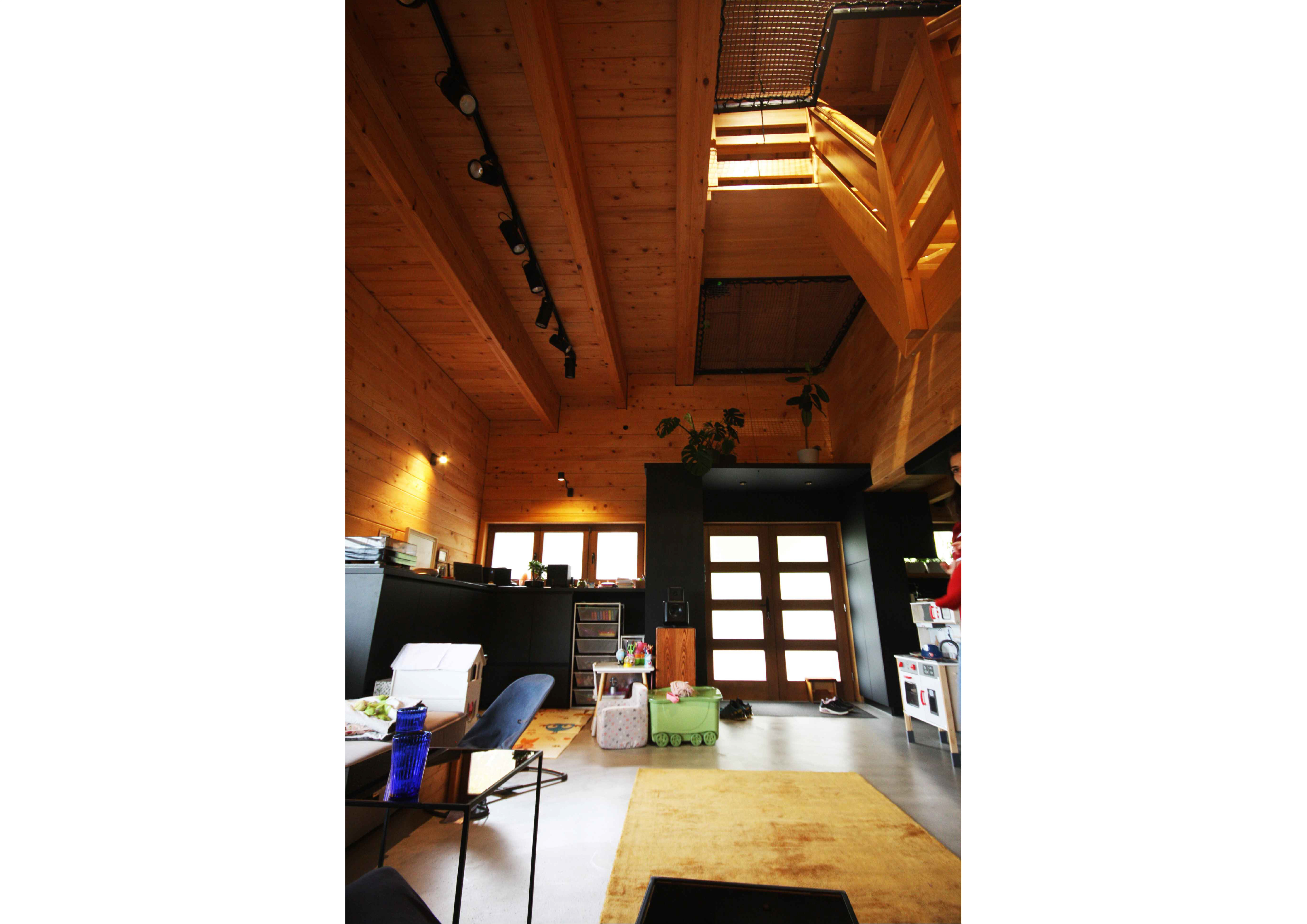 Poštujući gabarite podruma i tehnologiju gradnje izrađujemo idejni projekt baziran na kontaktu s terenom, pogledu prema gradu te upadu sunca u kuću što rezultira dinamičnim presjekom, stepenastom dječjom sobom i terasastom igraonicom iznad spavaće sobe.