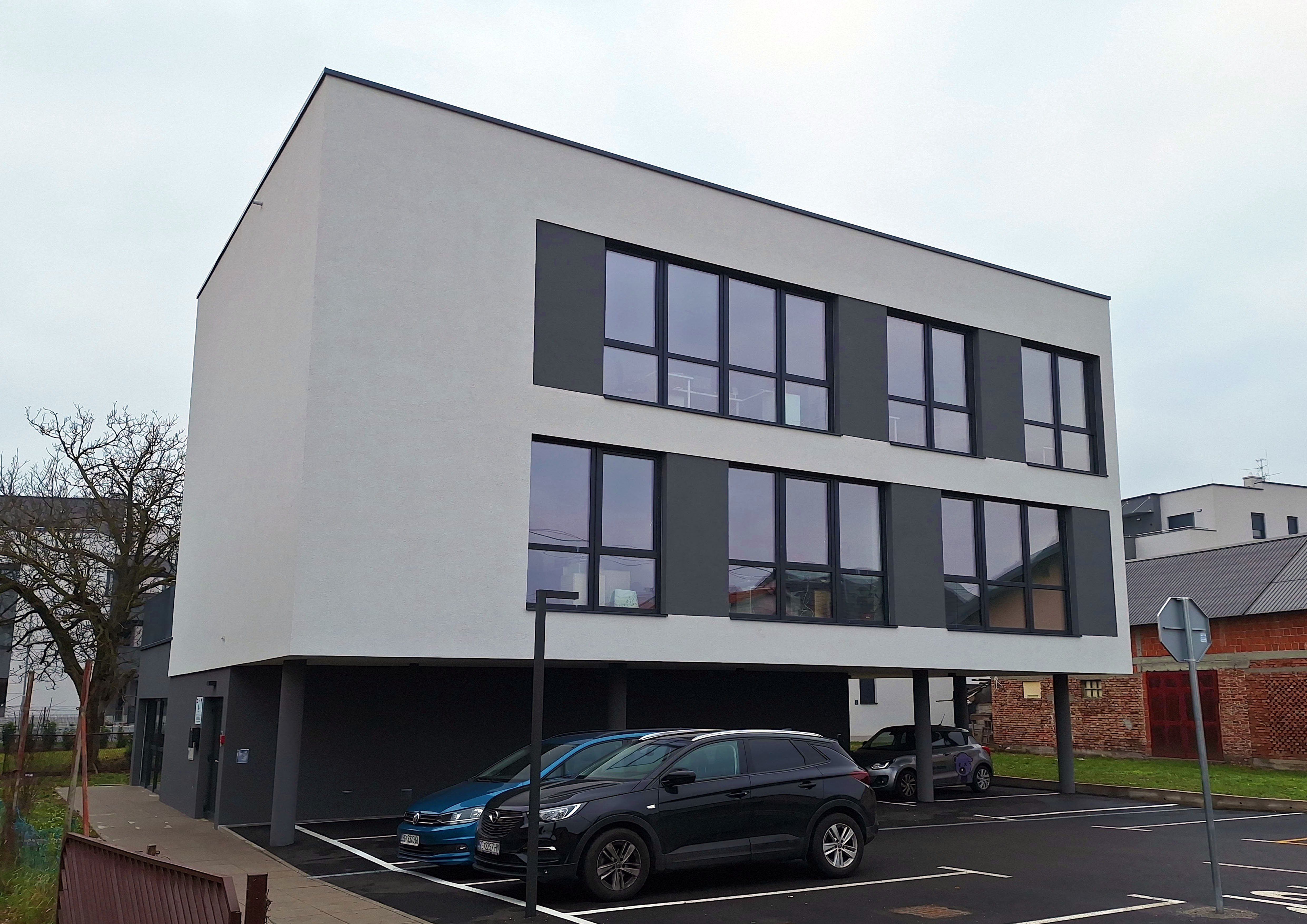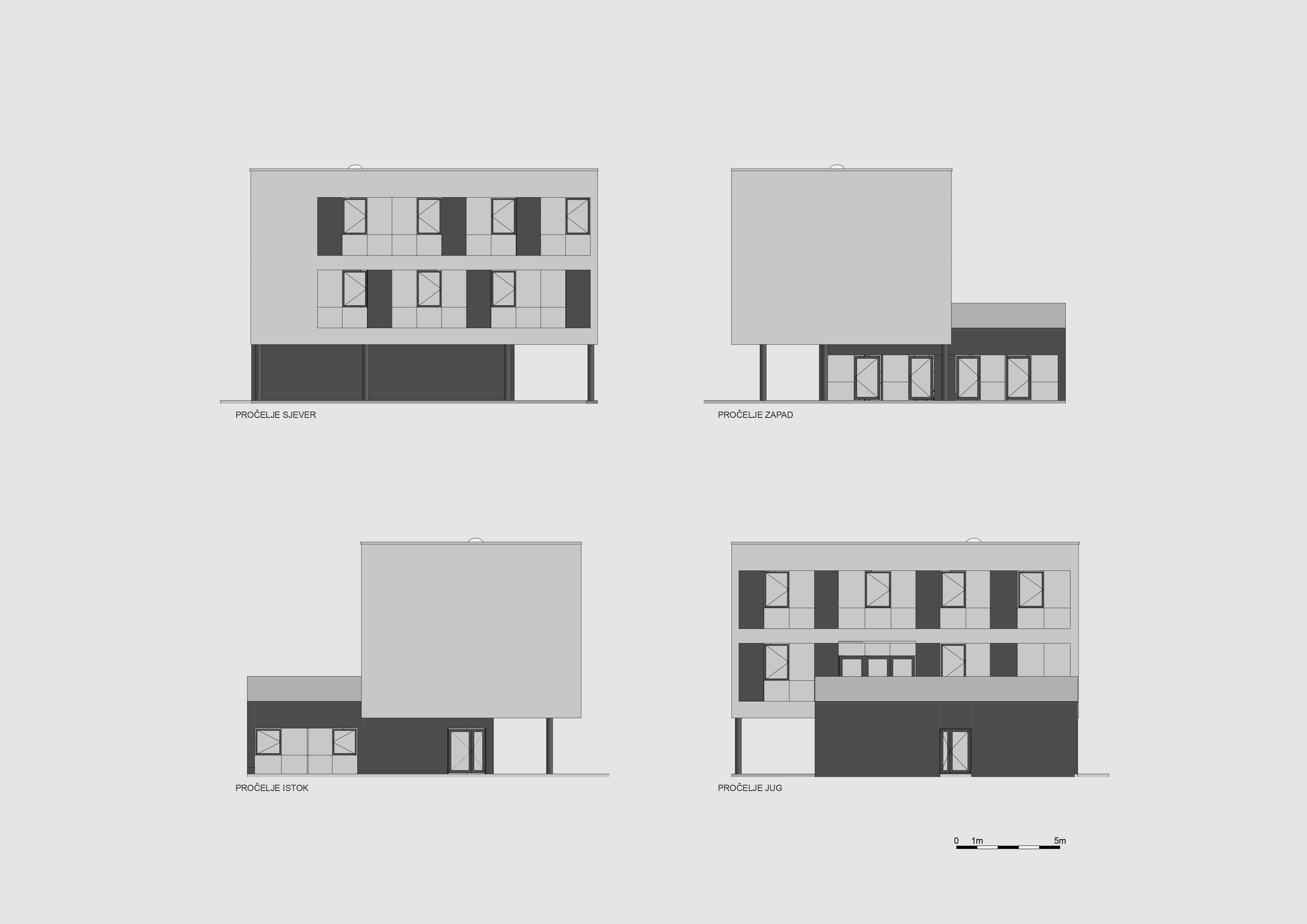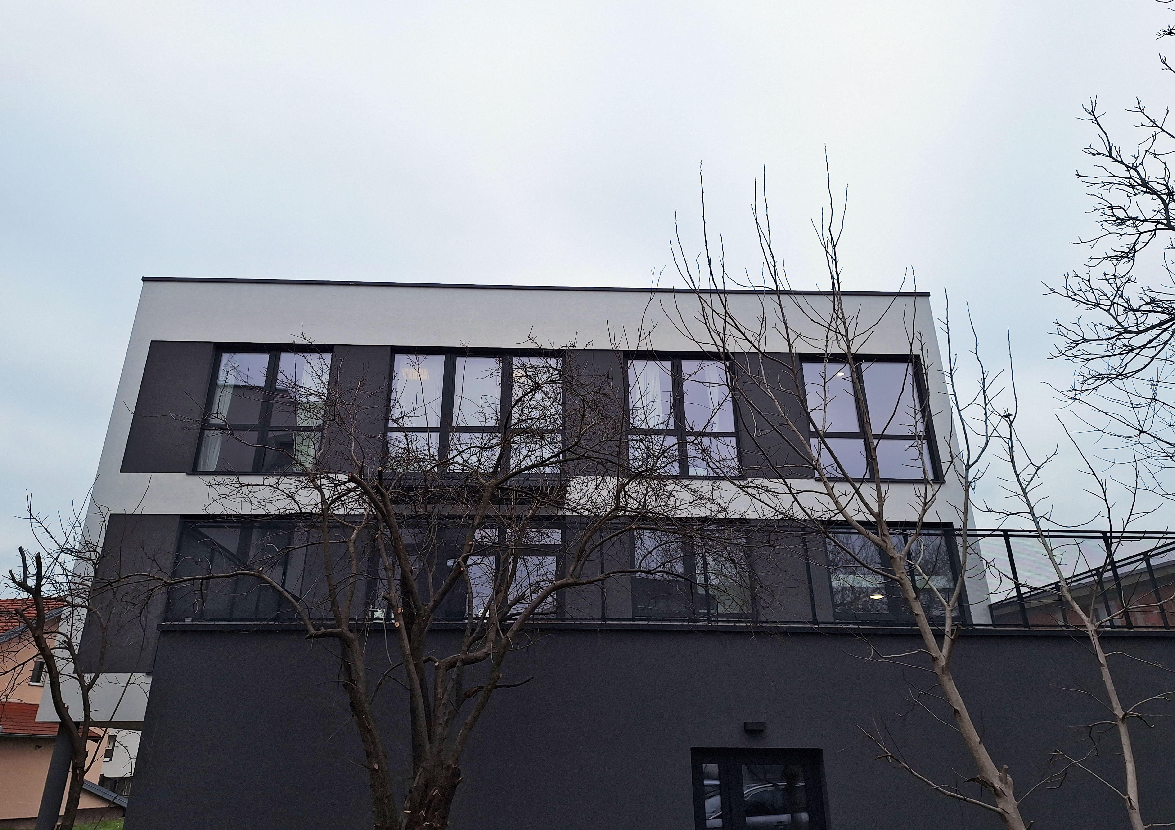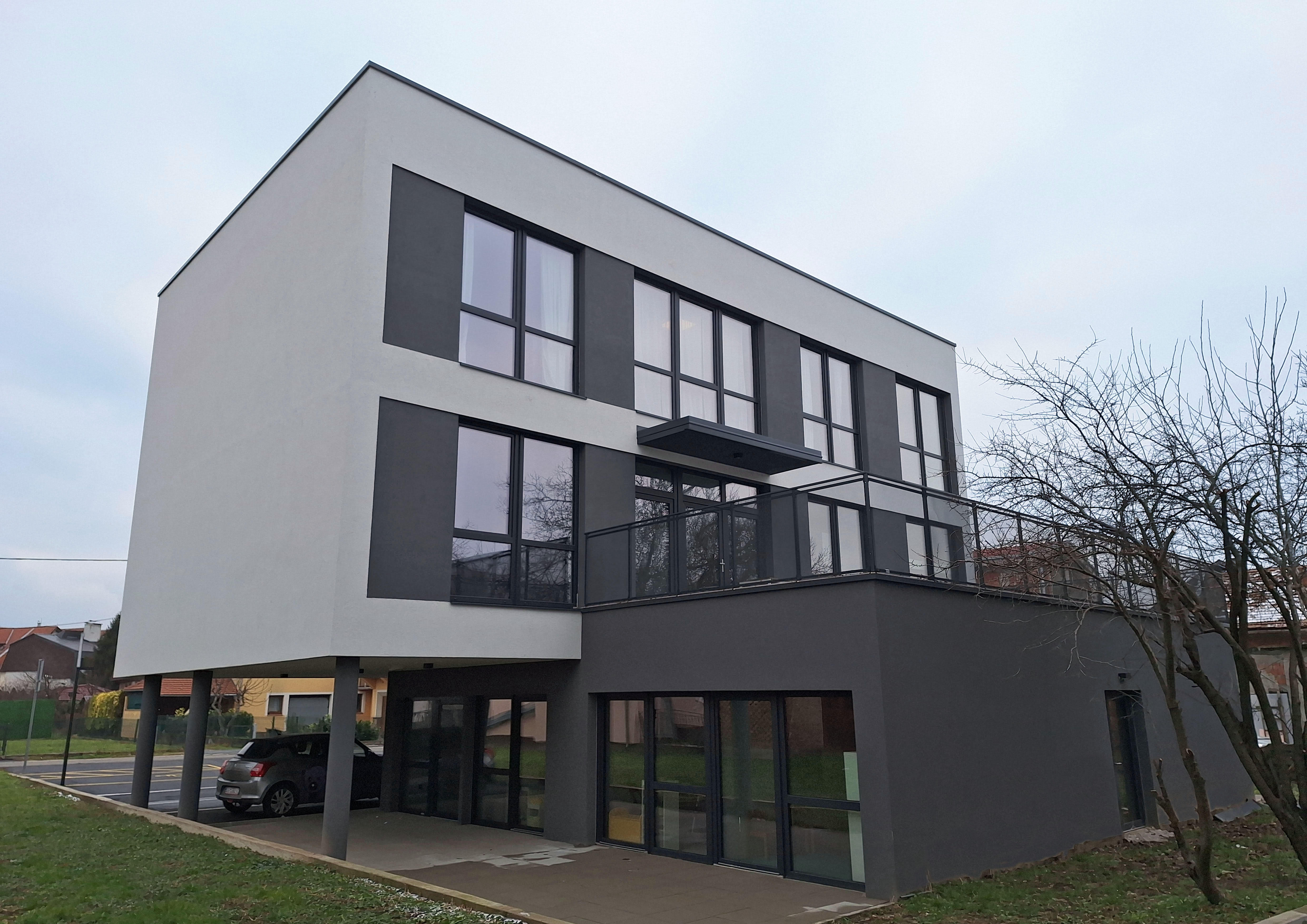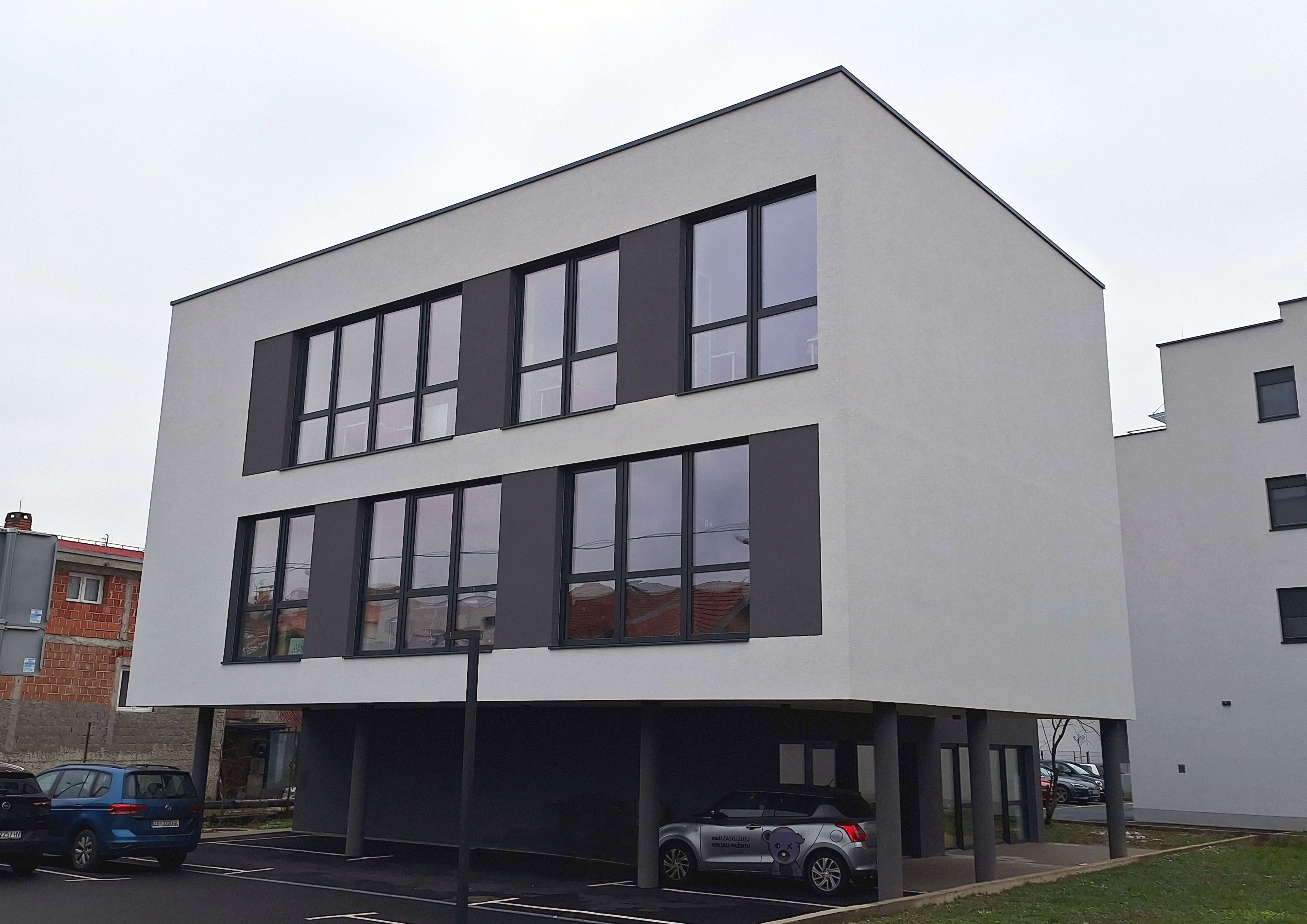 Volumeni prizemlja i katova međusobno su tlocrtno izmaknuti, kako bi se prizemlje otvorilo prema zapadu, dobila terasa 1. kata na krovu prizemlja te parkiralište djelomično natkrilo i vizualno smanjilo. Ta razdvojenost i međusobna suprotstavljenost 2 volumena naglašena je oblikovno, koloristički – prizemlje je tamno, a katovi svijetli.
