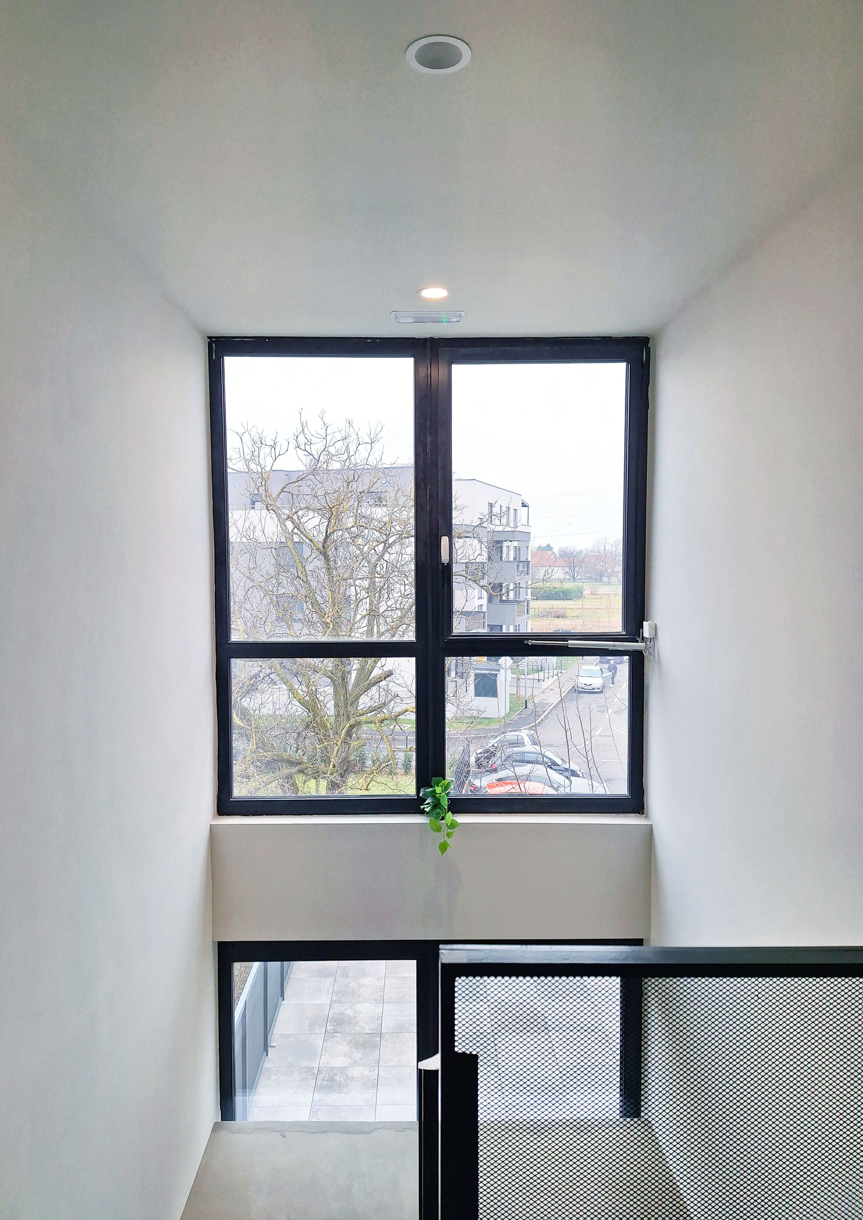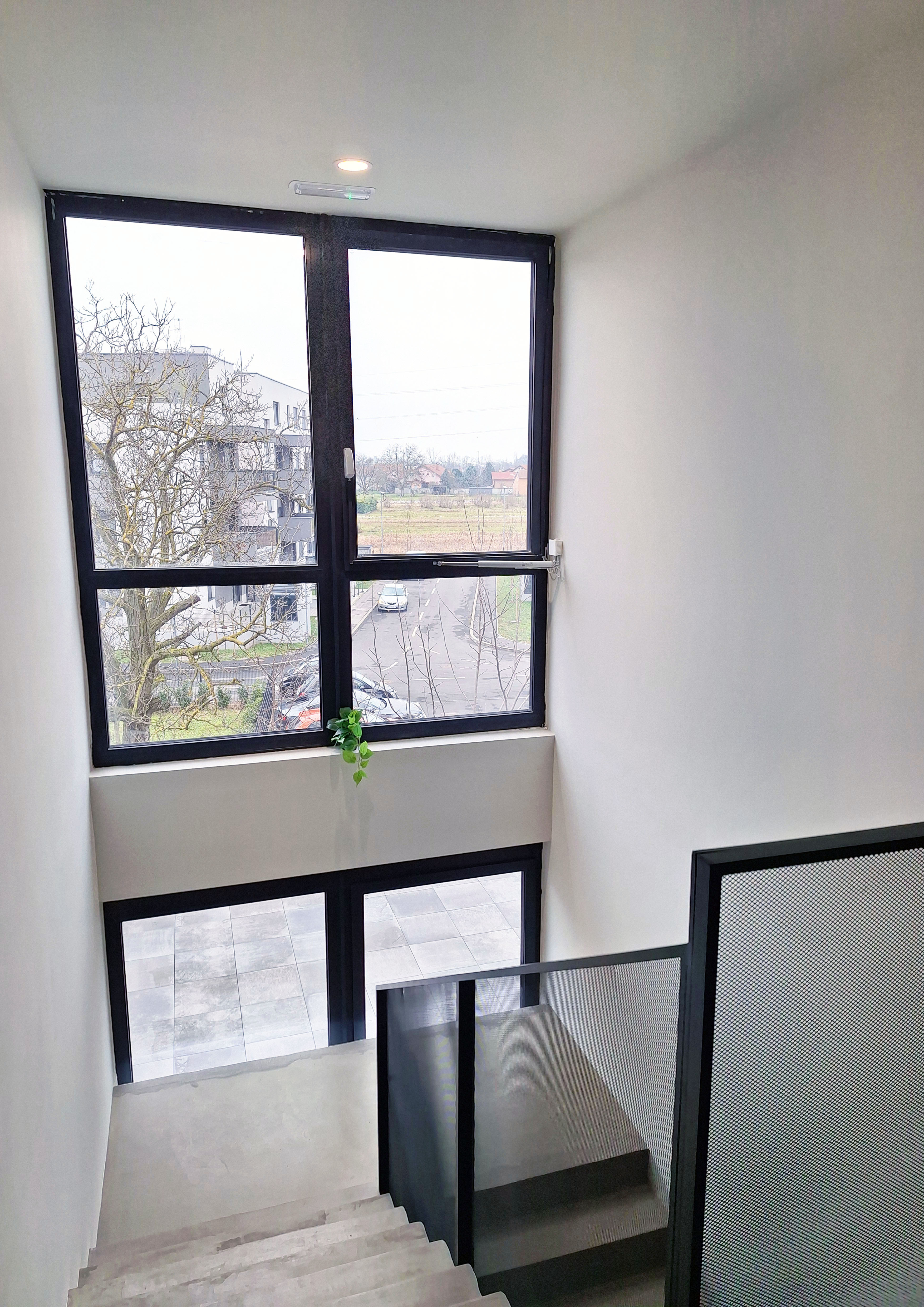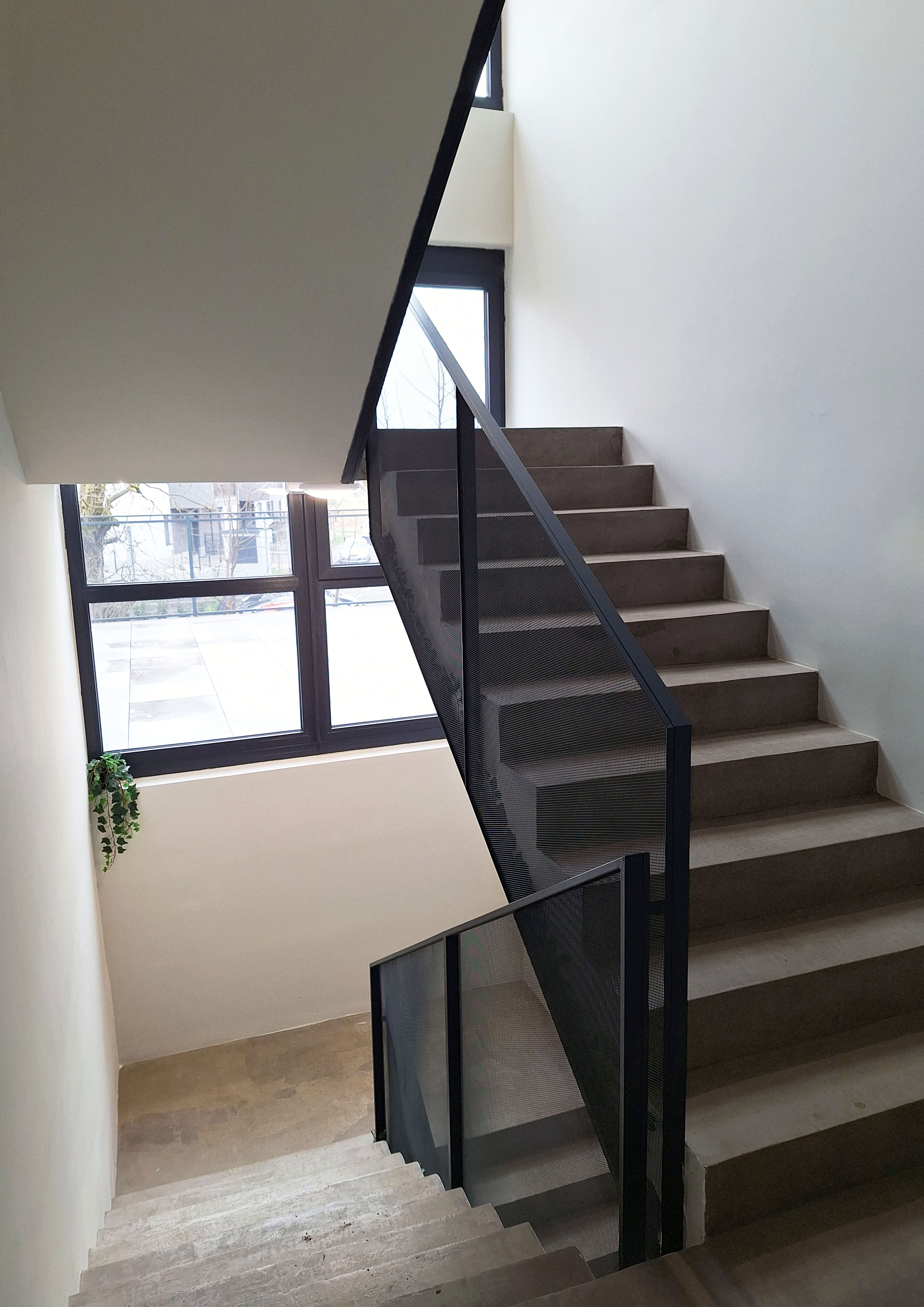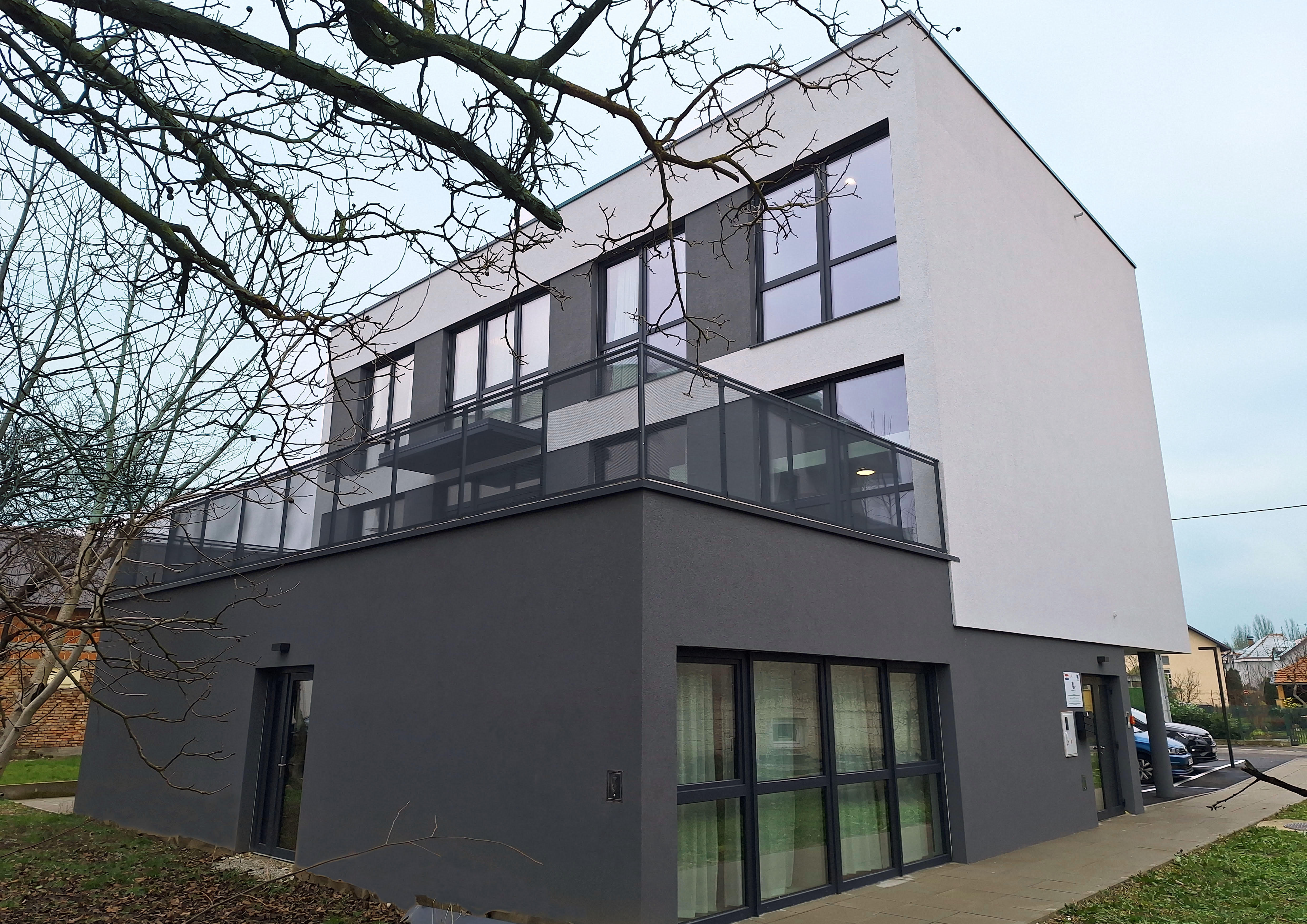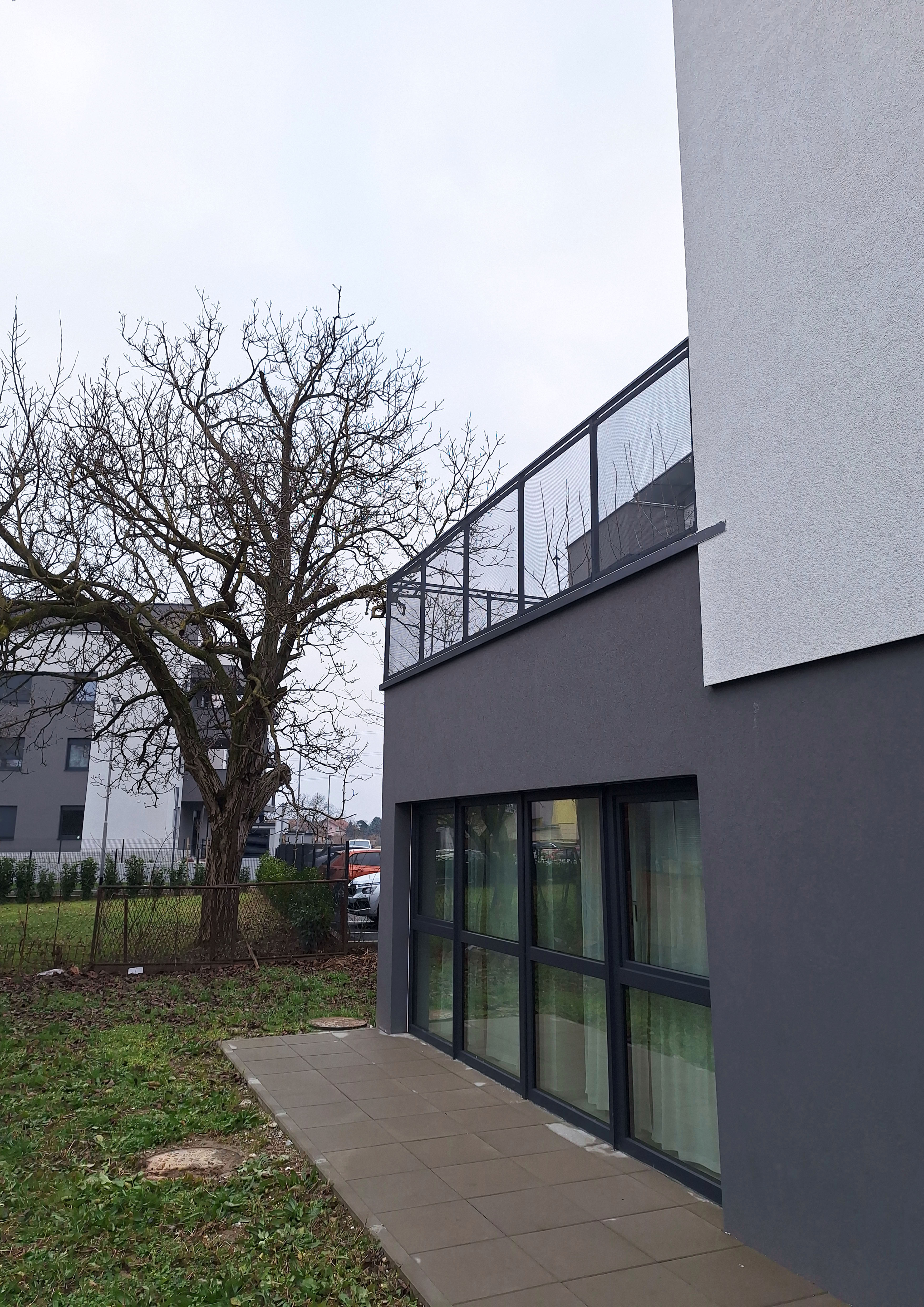 Volumeni prizemlja i katova međusobno su tlocrtno izmaknuti, kako bi se prizemlje otvorilo prema zapadu, dobila terasa 1. kata na krovu prizemlja te parkiralište djelomično natkrilo i vizualno smanjilo. Ta razdvojenost i međusobna suprotstavljenost 2 volumena naglašena je oblikovno, koloristički – prizemlje je tamno, a katovi svijetli.