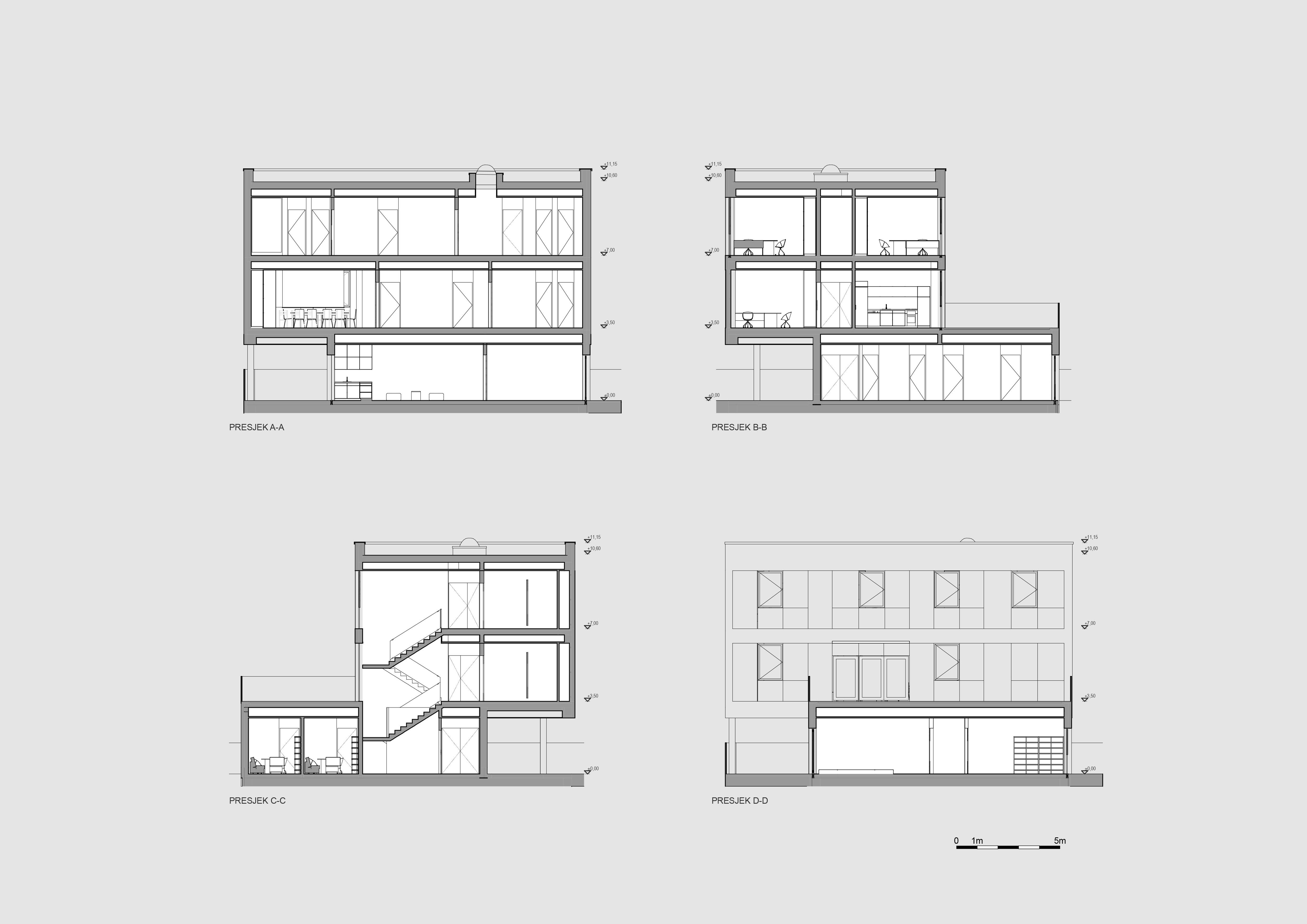 Svaki od volumena ima ravni krov: prizemlje ima prohodni ravni krov – terasu 1. kata, a 2. kat ima neprohodni ravni krov. Visina vijenca prizemlja je +3.50m, a 2. kata +11.15m, što je i ukupna visina građevine.