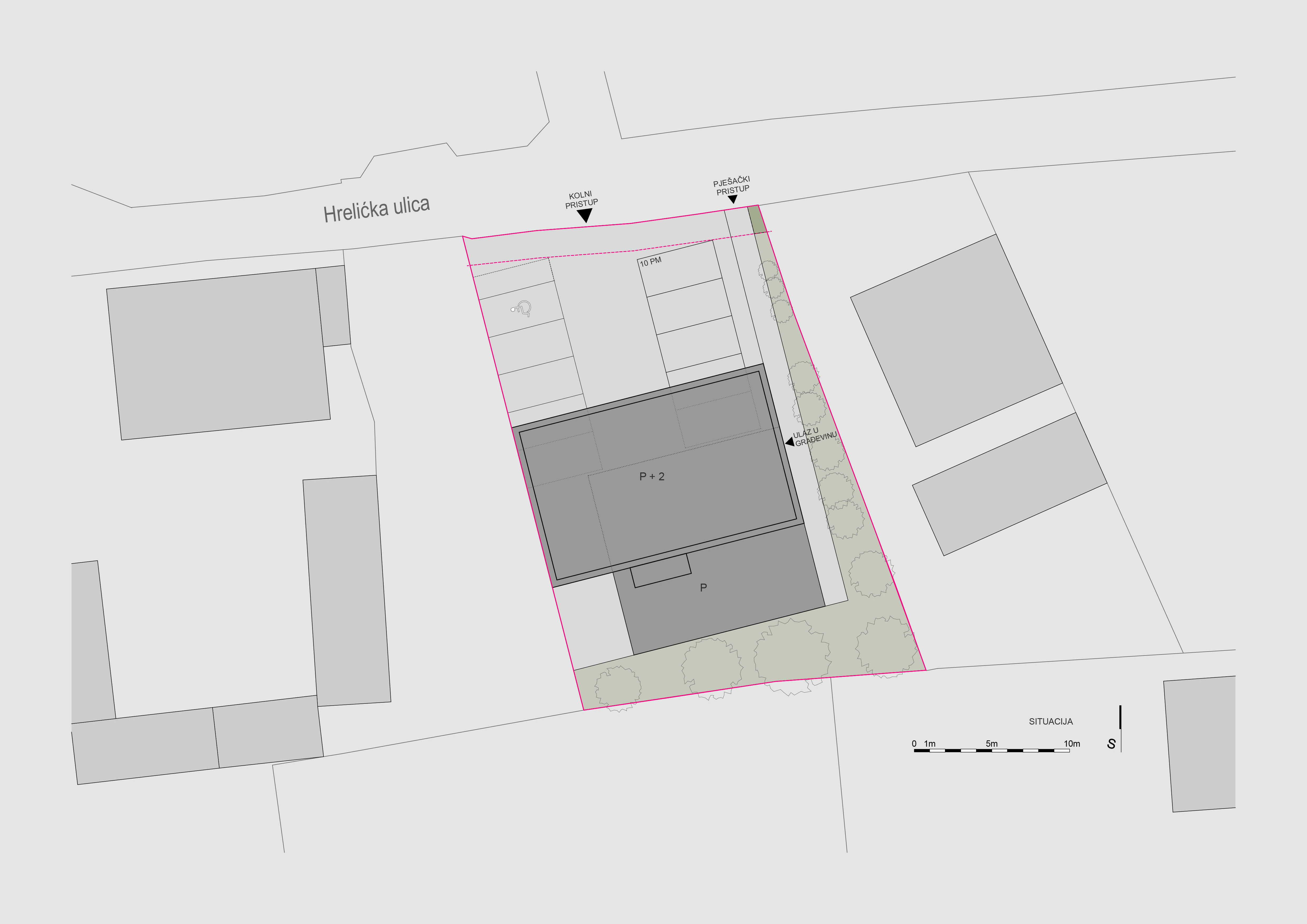 Građevina je smještena u Hrelićkoj ulici, kvart Dugave, grad Zagreb. Po tipu smještaja na građevnoj čestici je poluugrađena – svojim zapadnim zidom katova naslonjena je na među. Prizemlje nije prislonjeno na među već je dovoljno odmaknuto da građevina na taj način može imati otvore na sva četiri pročelja.