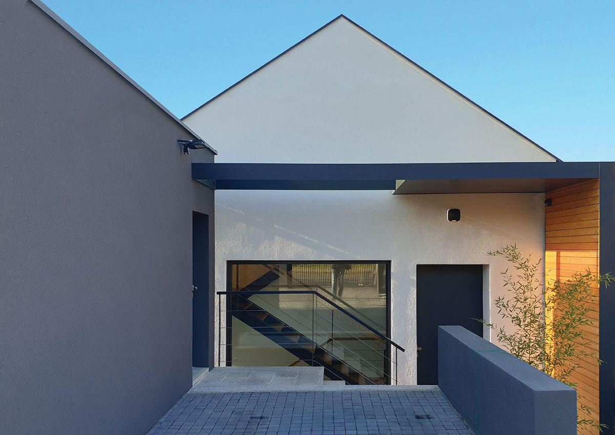 Uska i izdužena čestica, smještena na obronku zagrebačke Medvednice, oblikuje zanimljiv prostorni izazov organizacije novog doma mlade obitelji. Arhitektonski se projekt prilagođava datostima prostora te razdvaja dva volumena različite namjene: stambenu građevinu i pomoćni objekt garaže. Ovim je postupkom omogućeno maksimalno odmicanje od granica građevne čestice prema jugu čime je osigurana privatnost, prirodno osvjetljenje i ventilacija prostora. Razdvojeni volumeni povezani su čeličnom nadstrešnicom koja oblikuje i naglašava predprostor ulaza u kuću koji je upušten u odnosu na razinu ulice. Pomoćni volumen pravokutna je prizma, dok je volumen stambene građevine pravokutnog tlocrta katnosti podrum + prizemlje + potkrovlje, oblikovan kao suvremena interpretacija tradicionalnog dvostrešnog krova. Podrum volumena je armirano betonski, dok su gornje etaže zidane s drvenim krovištem. Formom, odabirom građevinskih materijala te sustava grijanja i hlađenja udovoljeno je zahtjevima za dobivanje nZEB certifikata uz niska ulaganja. Grijano stubište preuzima funkciju vjetrobrana s višenamjenskim prostorom u potkrovlju, spavaćim traktom u prizemlju i dnevnim traktom sa servisnim prostorima u podrumu. Iz prizemne etaže otvara se pogled prema jugu i zapadu dok su dnevni prostori u podrumu u izravnom kontaktu s terenom preko velikih kliznih stijena. Parter oko građevine uređen je popločenjem betonskim kockama s ulične strane, odnosno niskim i visokim zelenilom sa dvorišne strane, prostorima za boravak na otvorenom te potpornim zidovima uz građevinu s ciljem stabilizacije klizišta. Kao završna obloga ovojnice korišteni su tradicionalni materijali poput biber crijepa, fasadne žbuke i drveta. Tamnosiva i bijela boja pažljivo su odabrane kako bi se postigao vizualni kontrast uz dojam isticanja, odnosno prikrivanja pojedinih arhitektonskih elemenata.