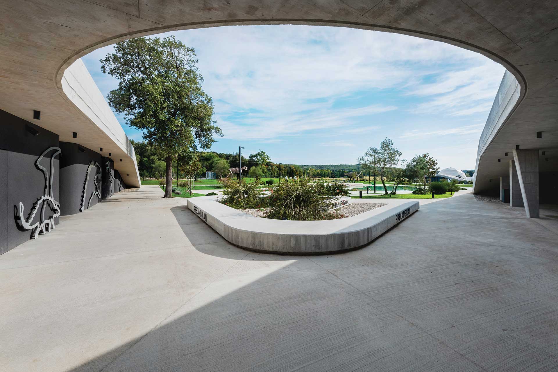 Sam kompleks prostire se na preko 16 000 četvornih metara, smještajući sve zatvorene sadržaje pod zelene krovove koji se fluidnim linijama maksimalno ukalpaju prirodnu konfiguraciju terena. Vodeni sadržaji svojom formom koketiraju sa stiliziranom siluetom dinosaura koja postaje vidljiva sa edukativne šetnice na krovu.
