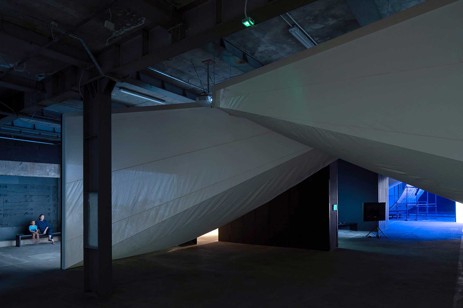 Izložba je dovela u isti veliki prostor stare betonske hale radove umjetnika koji se bave nestabilnim okolnostima suvremenog dereguliranog rada u globaliziranom i umreženom svijetu. Arhitektura izložbe stvorila je poseban ambijent za svaki rad pojedinačno. Velike video projekcije omogućile su uranjanje posjetitelja u njihove slike i narative. Svaki rad funkcionira sam za sebe, u nišama izgrađenim od jednostrano obloženih gips-kartonskih zidova, čija ispuna izolacijom oblikuje zvuk u prostoru i izdvaja ih u zasebne akustičke cjeline. Kretanje središnjim prostorom izložbe povezuje umjetničke radove u zajedničku temu višestrukosti glasova, simultanosti i preklopljenosti identiteta. Odsjaji pokretnih slika na platnima koja štite stražnje projekcije i refleksije zvukova pojedinih radova u središnjem prostoru među radovima tvore pulsirajuću mješavinu doživljaja, upravo ono 'usijano more' odnosa u nestabilnom dinamičnom svijetu o kojem izložba govori. Dok se nalazi u ambijentu jednog rada, leđima okrenut zidu, posjetitelj je na rubu svog vidnog polja svjestan cjeline. Kada se odvoji od prožetosti jednim radom, pomakne pogled od projekcije ili se uputi prema drugim radovima, postaje dio dematerijaliziranog toka globalnih informacija i premreženih pojedinačnih sudbina.