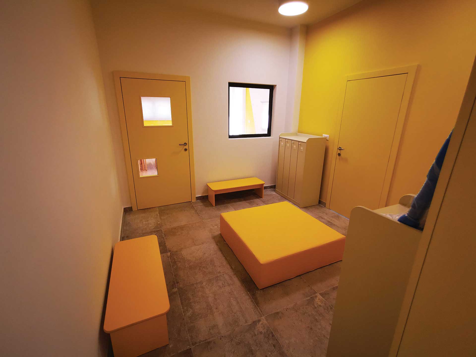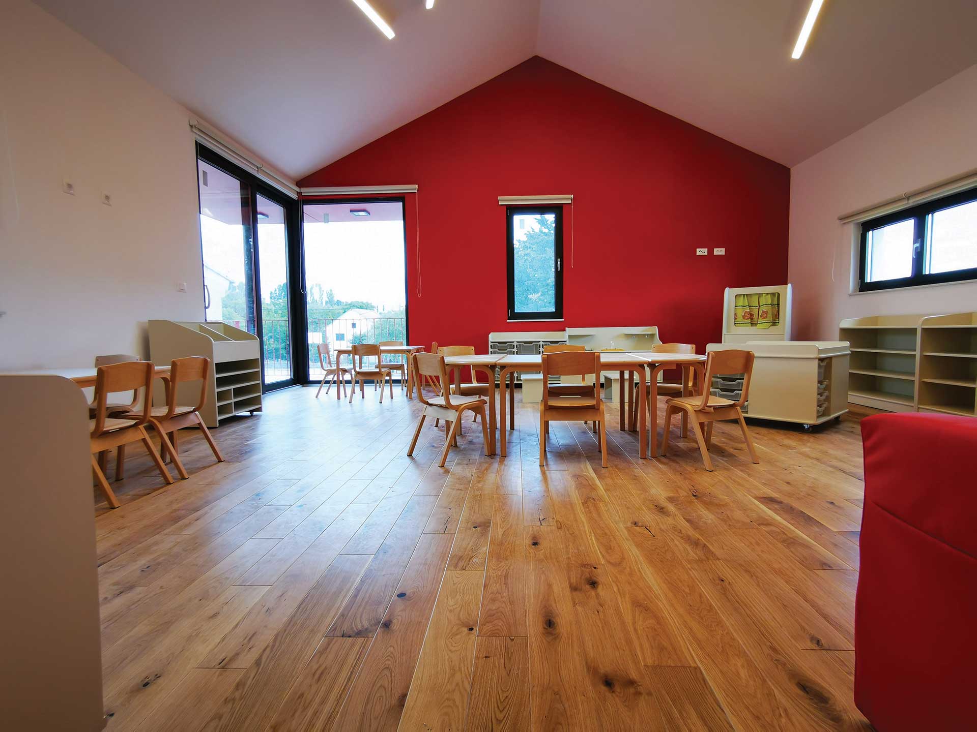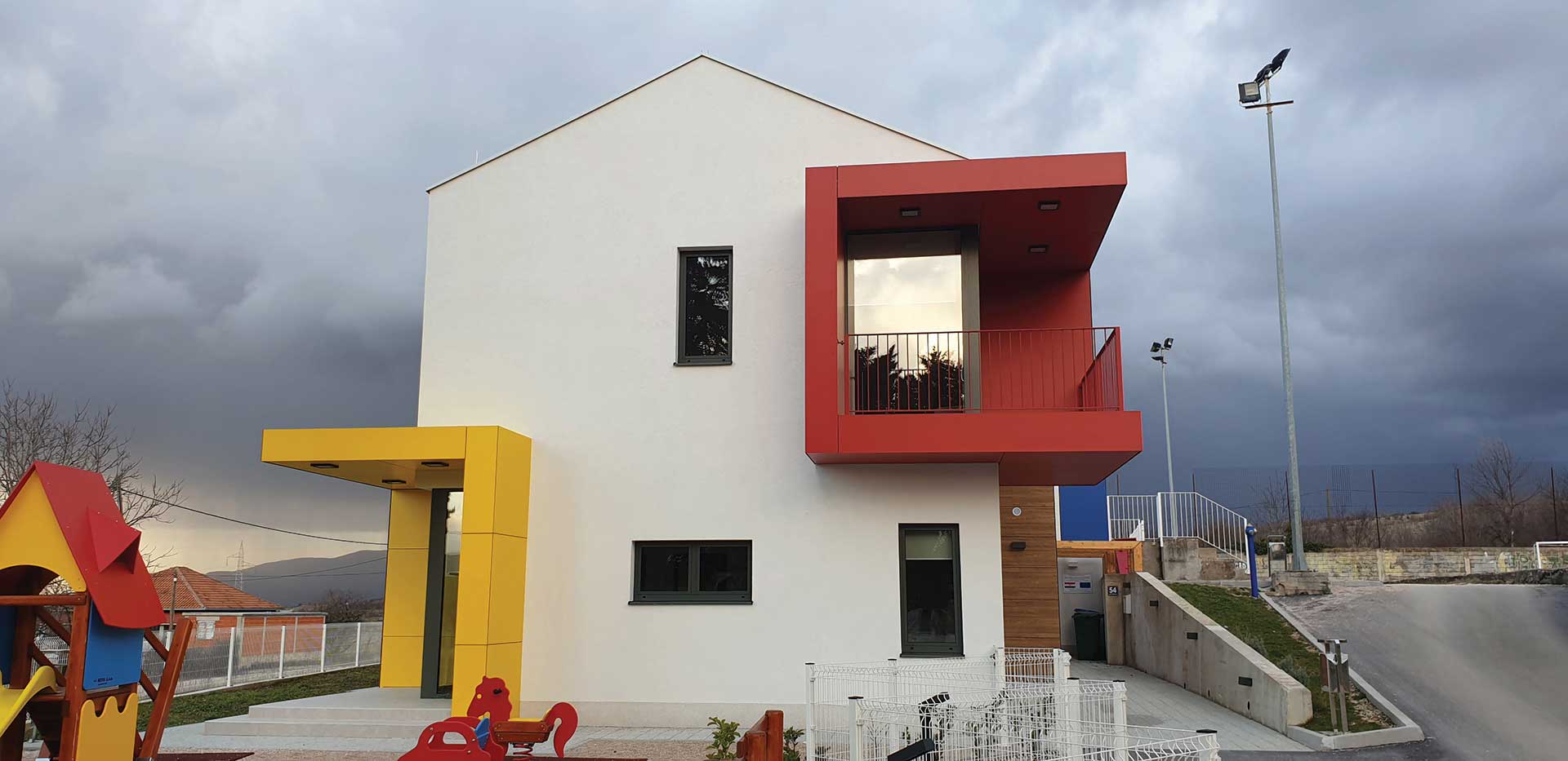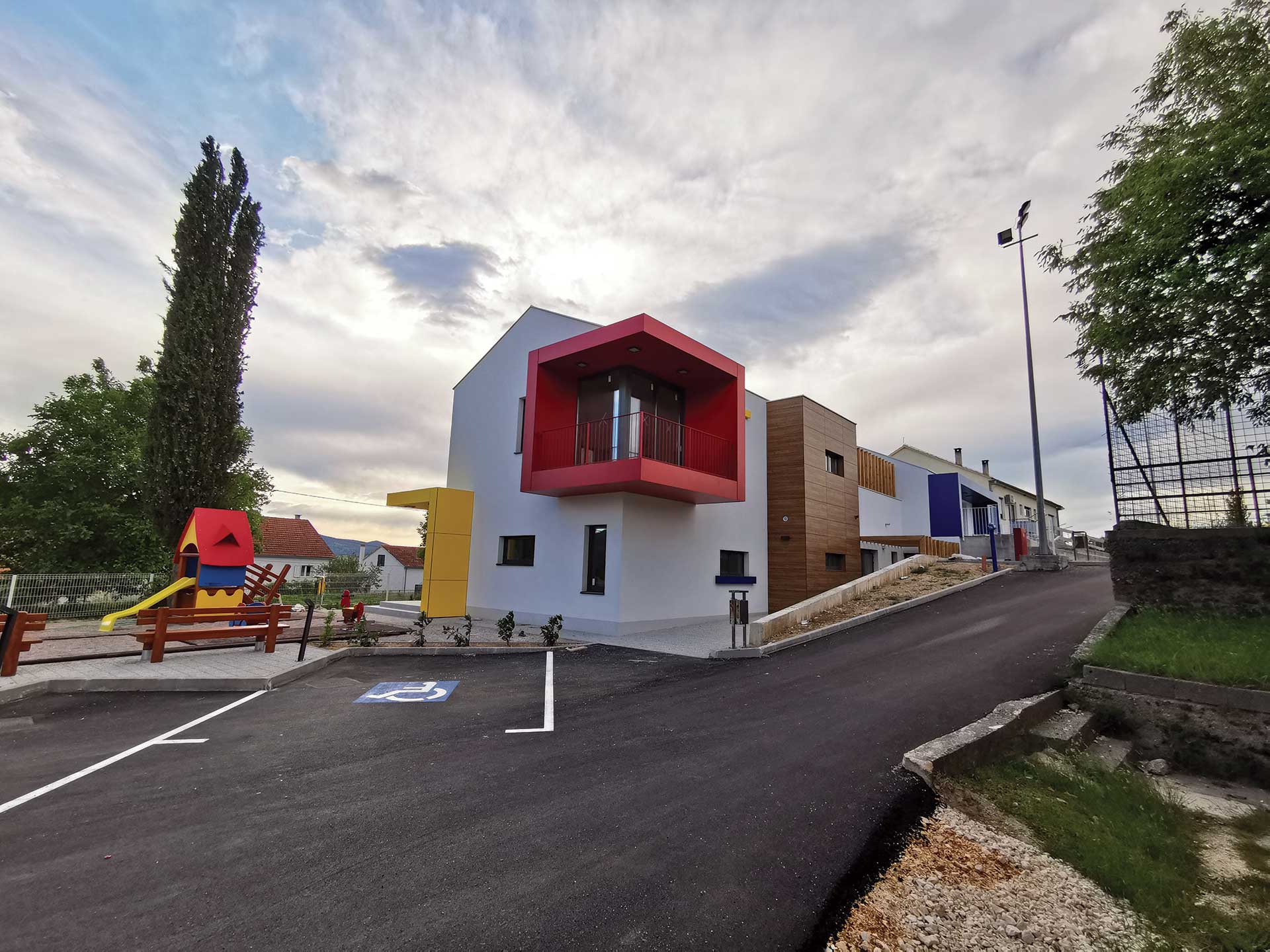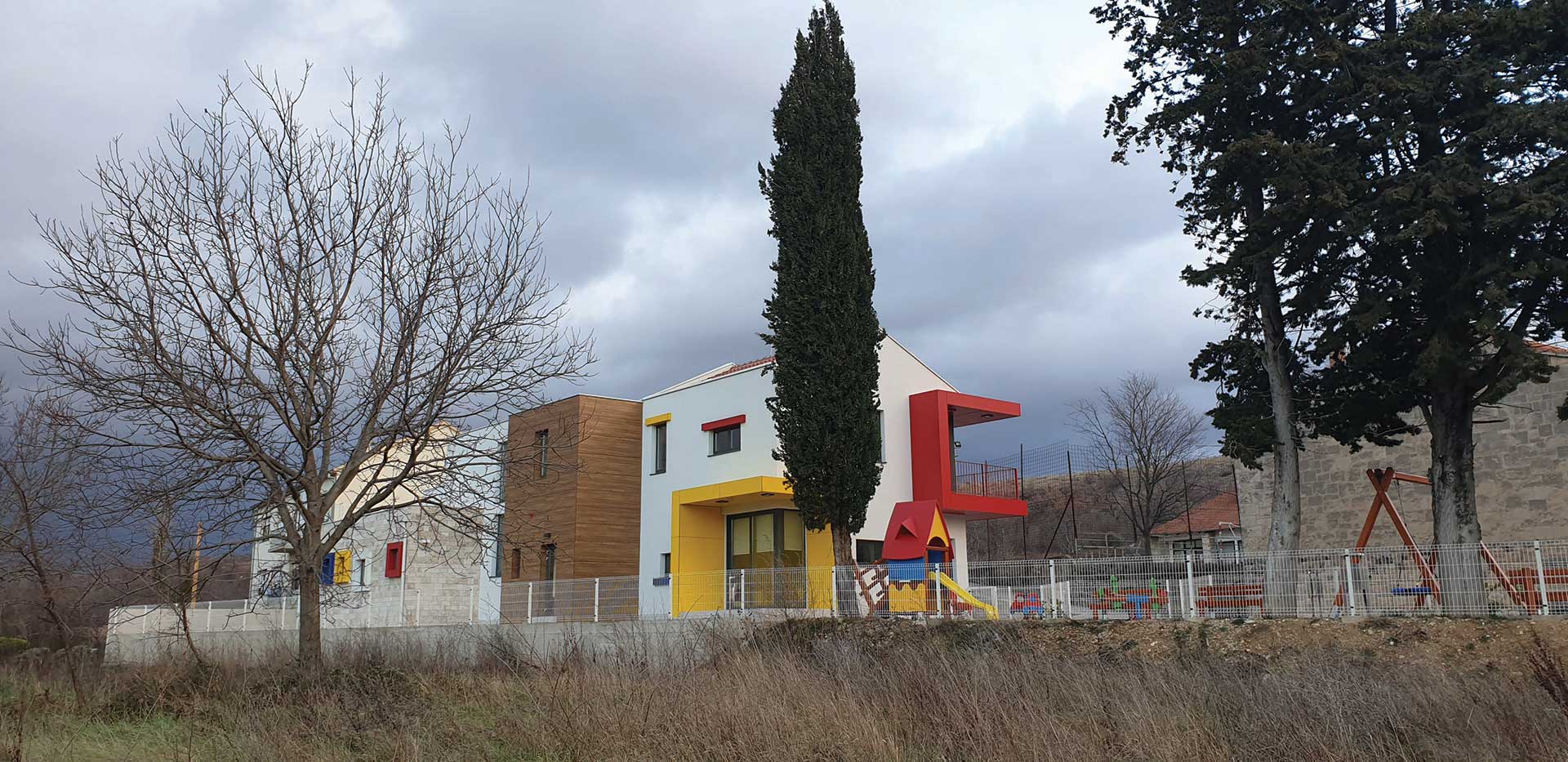 U pitoresknom okruženju Općine Ružić, u blizini rodnog mjesta Ivana Meštrovića izgrađen je Dječji vrtić Ježići kapaciteta za 30 djece smještene u dvije skupne jedinice. Obzirom da su dječje jaslice i vrtić prvi socijalni prostor izvan doma s kojim djeca dolaze u kontakt, njegovo oblikovanje zahtijeva veliku odgovornost, ali i čini proces projektiranja radosnim poslom jer imamo priliku prostor gledati očima djeteta. Prilikom projektiranja inzistirali smo na dvije glavne teme: obliku i boji. Oblikom smo željeli stvoriti „lego kućicu“, tj. povezanu cjelinu od nekoliko kućica i kubusa na koje nadodajemo istake i niše, baš kao što dijete kroz igru slaže lego kockice stvarajući jedinstvenu cjelinu. Druga tema je boja kojom se segmentno igramo kroz oblikovanje pročelja ali i u interijeru vrtića. Koristimo tri osnovne kromatske boje koje u dječjoj percepciji djeluju kao pokretač i stimulator razvoja. Žuta kao simbol topline i svjetlosti, crvena kao simbol ljubavi i snage te plava kao simbol istine.