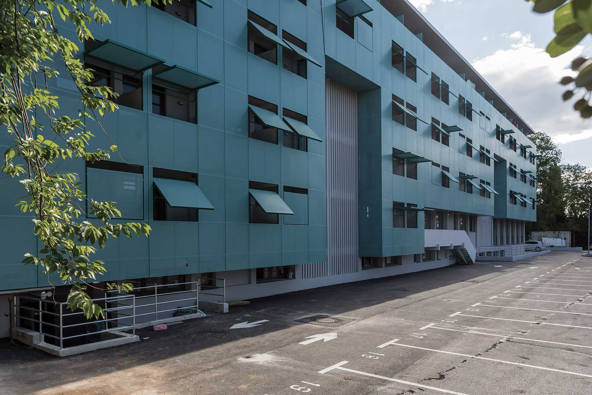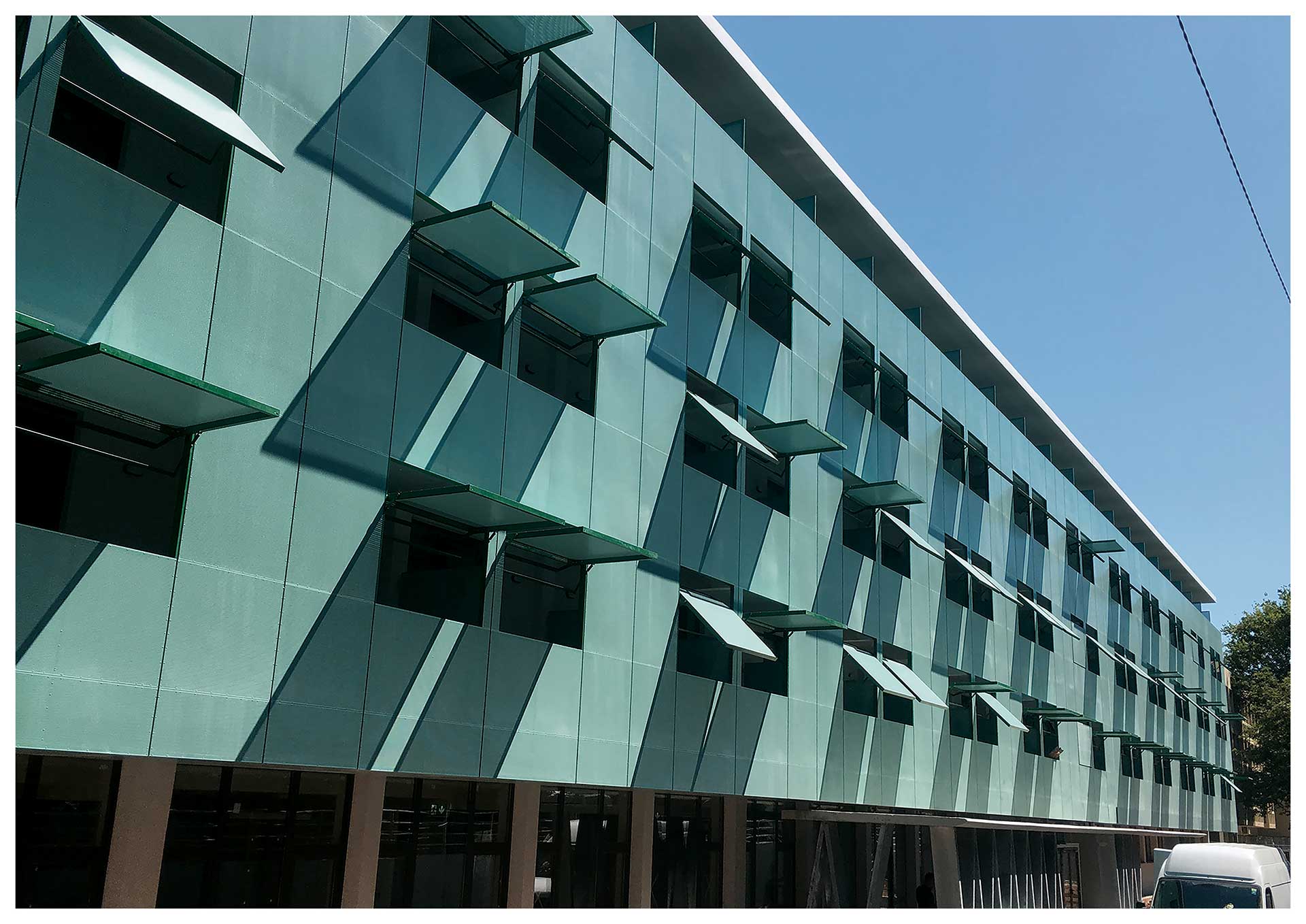 Velika pozornost dana je oblikovanju i funkcionalnosti fasada te oblikovnom usklađivanju zatečenih konzolnih elemenata s dogradnjama balkona i nadogradnjom kata. U tu svrhu je na vanjskoj liniji balkona obloga od perforiranog lima koja služi kao ograda, a s otklopnim modulima kao zaštita od sunca. Zeleni ton „oksidiranog bakra“ uspješno je uklopljen u Marjansko zelenilo.