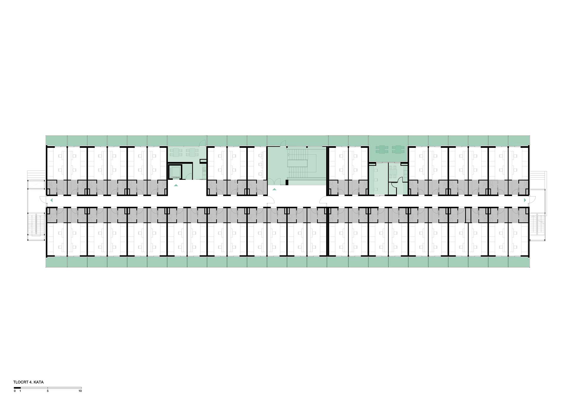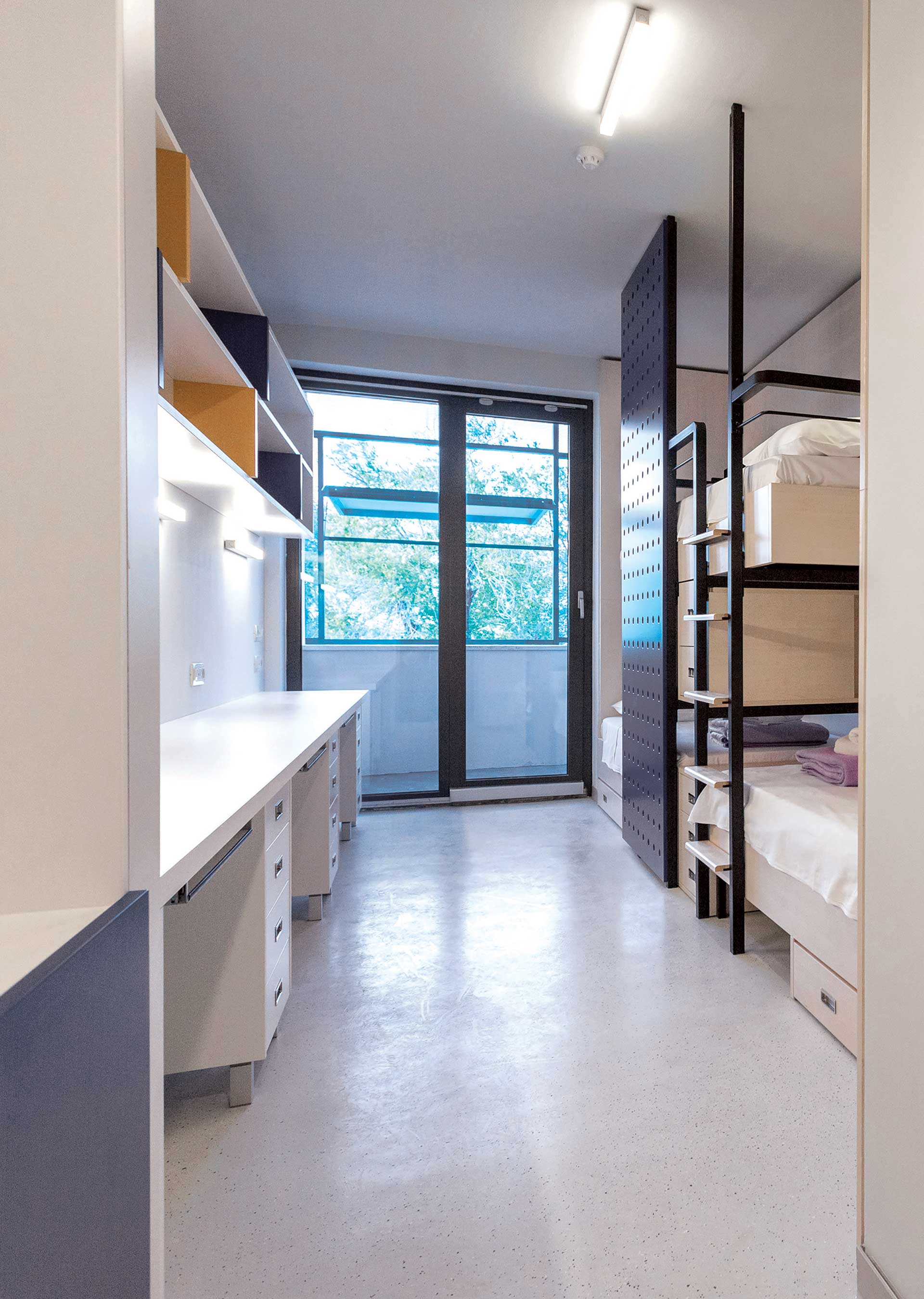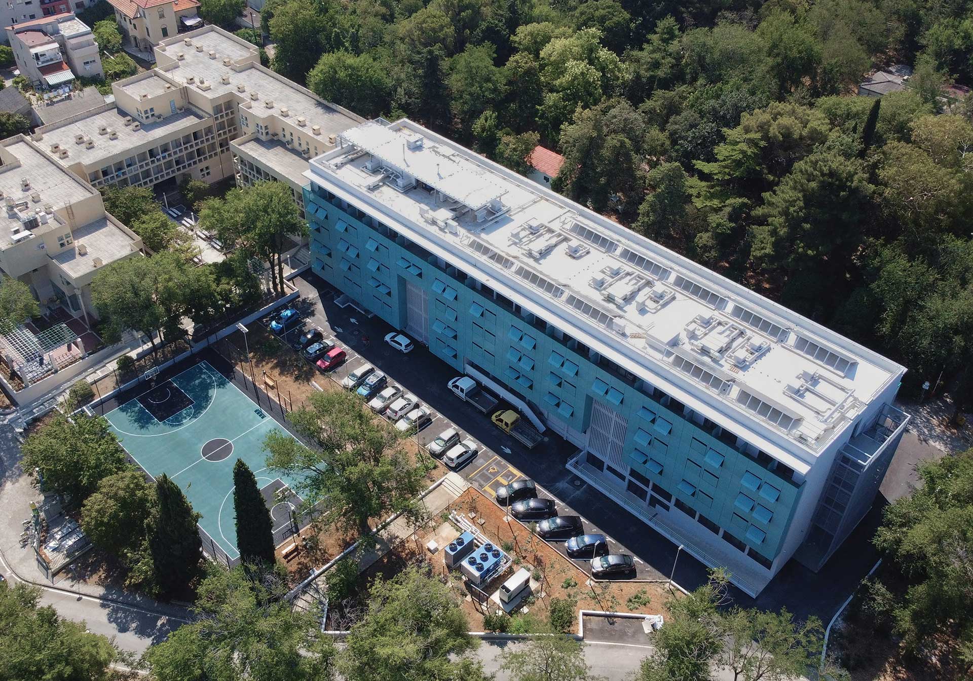 U odnosu na zatečenu funkcionalnu shemu realizirano je otvorenije prizemlje s jasnim komunikacijama među zajedničkim prostorima te četiri etaže soba sa središnjim hodnikom. Sobe su racionalne i jasne dispozicije. Svaka soba ima balkon s otklopnim sjenilima od perforiranog lima. Svako krilo ima čajnu kuhinju i prostoriju za učenje. U podrumu su smještene servisne prostorije i sanitarije. Etaže su povezane liftom i centralnim stubištem. Požarnim stubištem na istočnoj strani pristupa se krovnoj terasi na kojoj su solarni paneli i prostor za energetiku. Objekt se uspješno uklopio u kontekst Marjana i obale, s kvalitetnim interijerskim prostorima i odgovornim odnosom prema javnom financiranju.