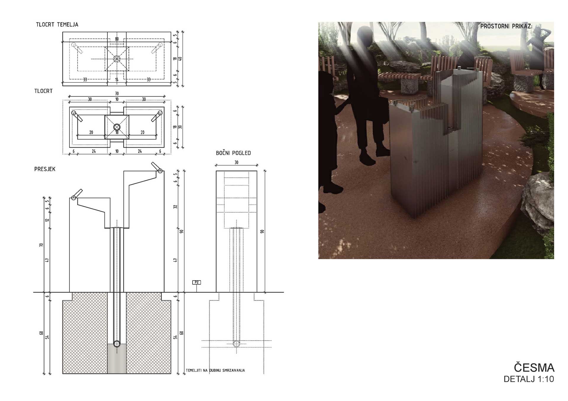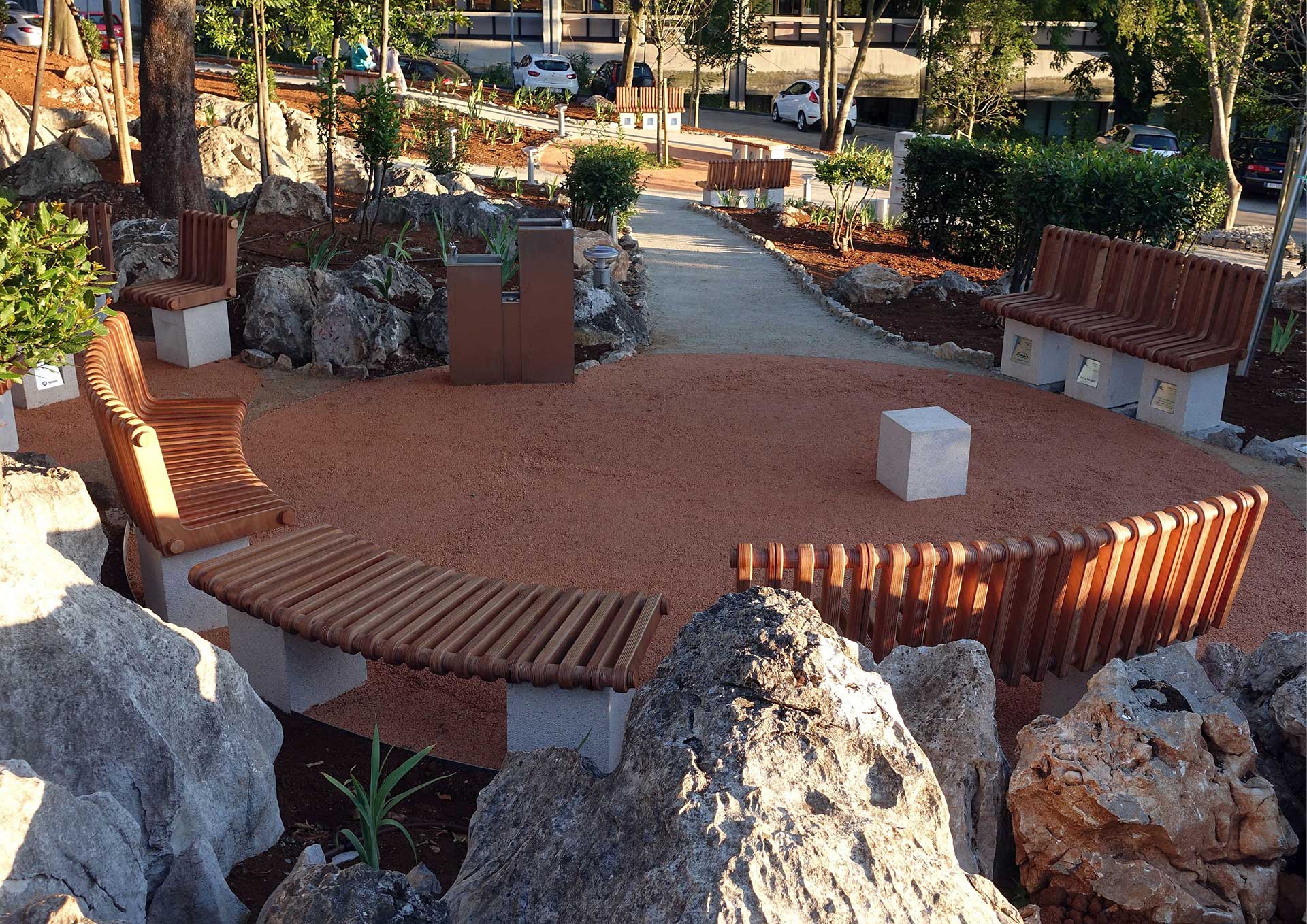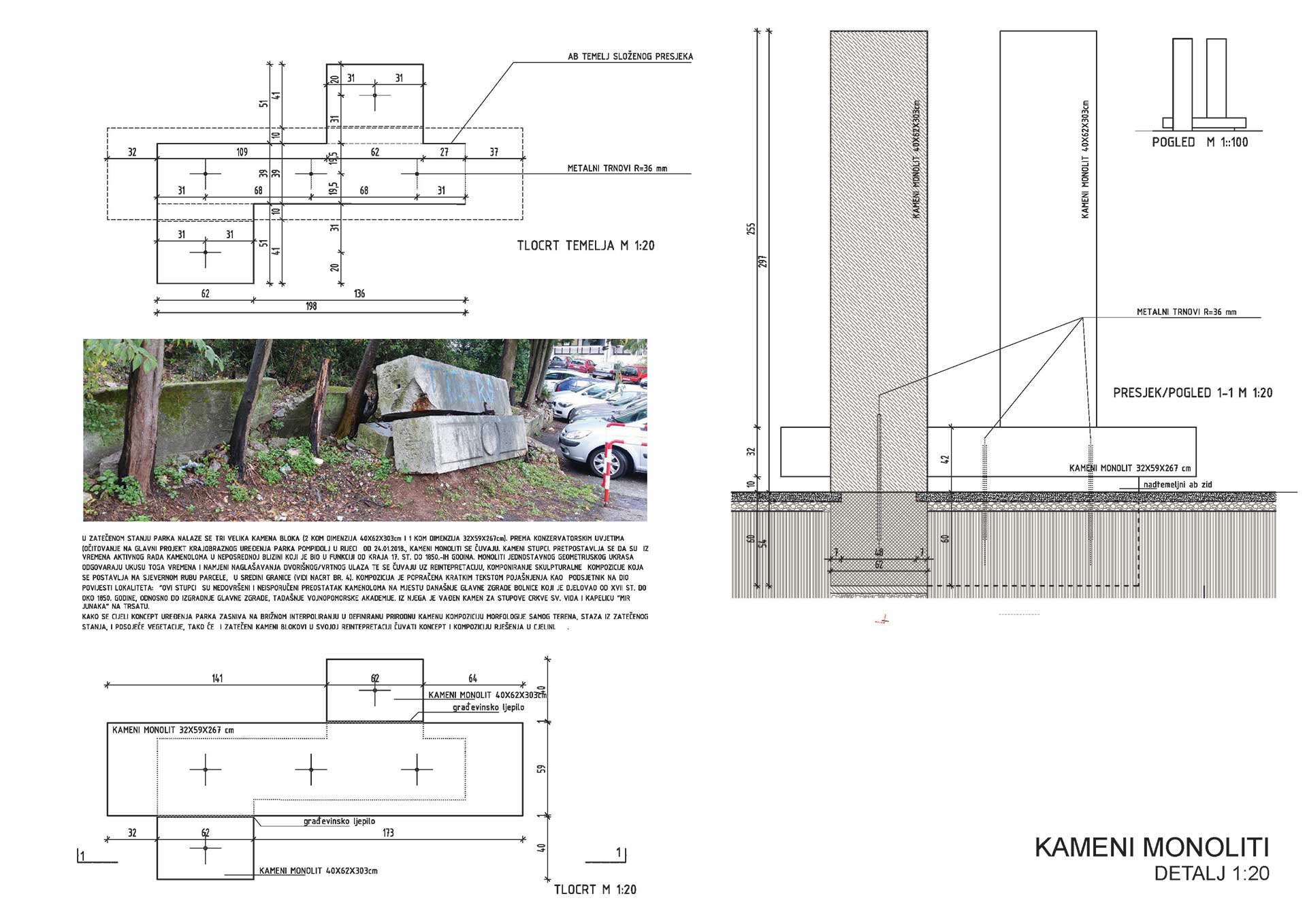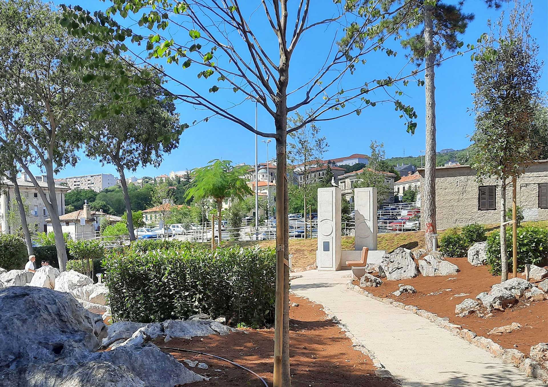 Park je smješten unutar gusto izgrađene strukture KBC Rijeka. Smješten je na stjenovitom nagnutom terenu s padom u smjeru SI-JZ (maksimala visinska razlika veća od 7 metara) i s nejednolikim kosinama unutar sebe. Rubovi povijesnog dijela parka projektom su egzaktno (re)definirani uz poštivanje i naglašavanje glavne morfološke odlike parka - nakupina stijena (grota), izrazite likovne vrijednosti, koje se ističu od okolnog zemljanog ili kamenog reljefa manje izražajnosti. Postojeći ulazi u park zadržavaju se i preoblikuju, uvodi se ulaz u krajnjoj južnoj točki parka i park se povezuje s novim ugostiteljskim sadržajem. Glavni ulazi oblikovani su na način da se omogući nesmetan pristup osobama u invalidskim kolicima, kao i kretanje većinom staza (uključivo glavna cirkularna šetnica i staza paralelna s prometnicom - "nogostup"). Kružno manje boravište formirano je na sjecištu staza uz jugozapadni ulaz kao čekaonica na otvorenom sa spomen stablom koje je posveta inicijatoru projekta. Glavno boravište čine veći i manji krug koji sadrže segmentne klupe (postolje od betonskih kocaka s drvenim sjedalicama) te dvovisinsku česmu. Natkriljuje ga nadstrešnica od trokutastog jedra u donjoj i trokutaste metalne mreže s biljkama penjačicama u gornjoj zoni koja počiva na parovima inox stupova. Postojeće kamene sjedalice isklesane u živom kamenu zadržavaju se u cijelosti. Od pronađenih ostataka kamenog portala, porijeklom iz nekadašnjeg kamenoloma, formirana je spomen-kompozicija monolita. Postavljena je solarna orijentaciona rasvjeta. Oblikovni koncept i izbor visoke, niske i ukrasne vegetacije poštuje i nadopunjuje pretpostavljeni povijesni koncept. Rubovi su definirani drvoredom koprivića / Celtis australis, a postojeće grupacije autohtonog lovora / Laurus nobilis formiraju se u grmolike nakupine ili manje gajeve stabala. Postojeći podrast i slobodno nisko zelenilo (bršljan / Hedera helix, bodljikava veprina / Ruscus aculeatus, bekovina / Viburnum tinus) preoblikovani su i dopunjeni, nasip uz servisnu prometnicu zasađen je tepisima raznovrsnih žednjaka – Sedum sp., a sjeverni rub uz parkiralište je formiran potezom raznobojnih oleandera / Nerium oleander.