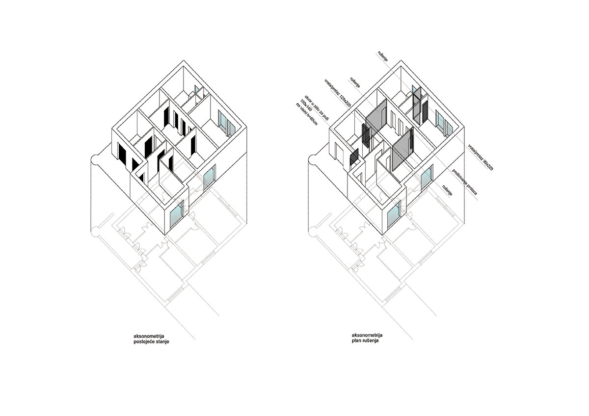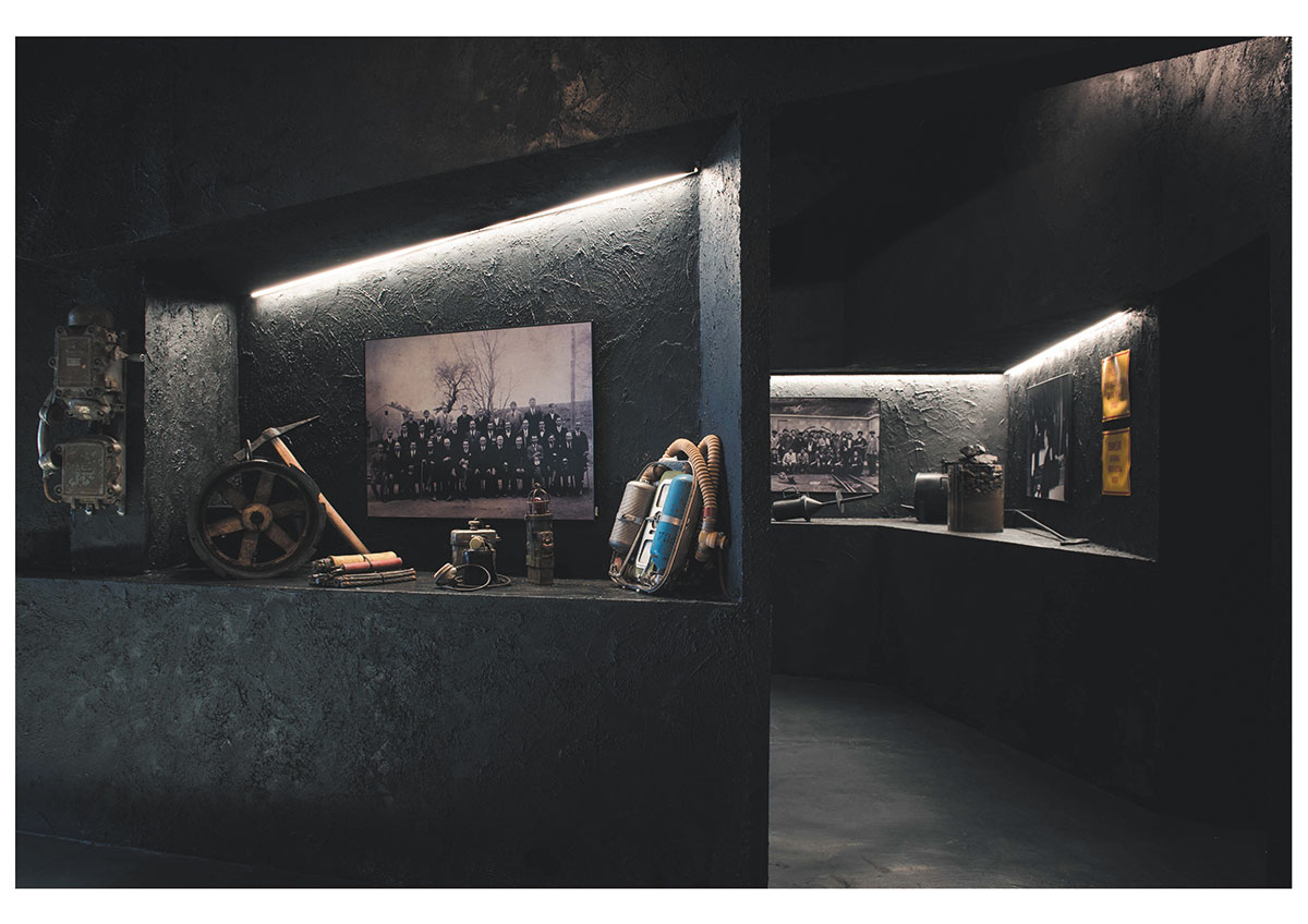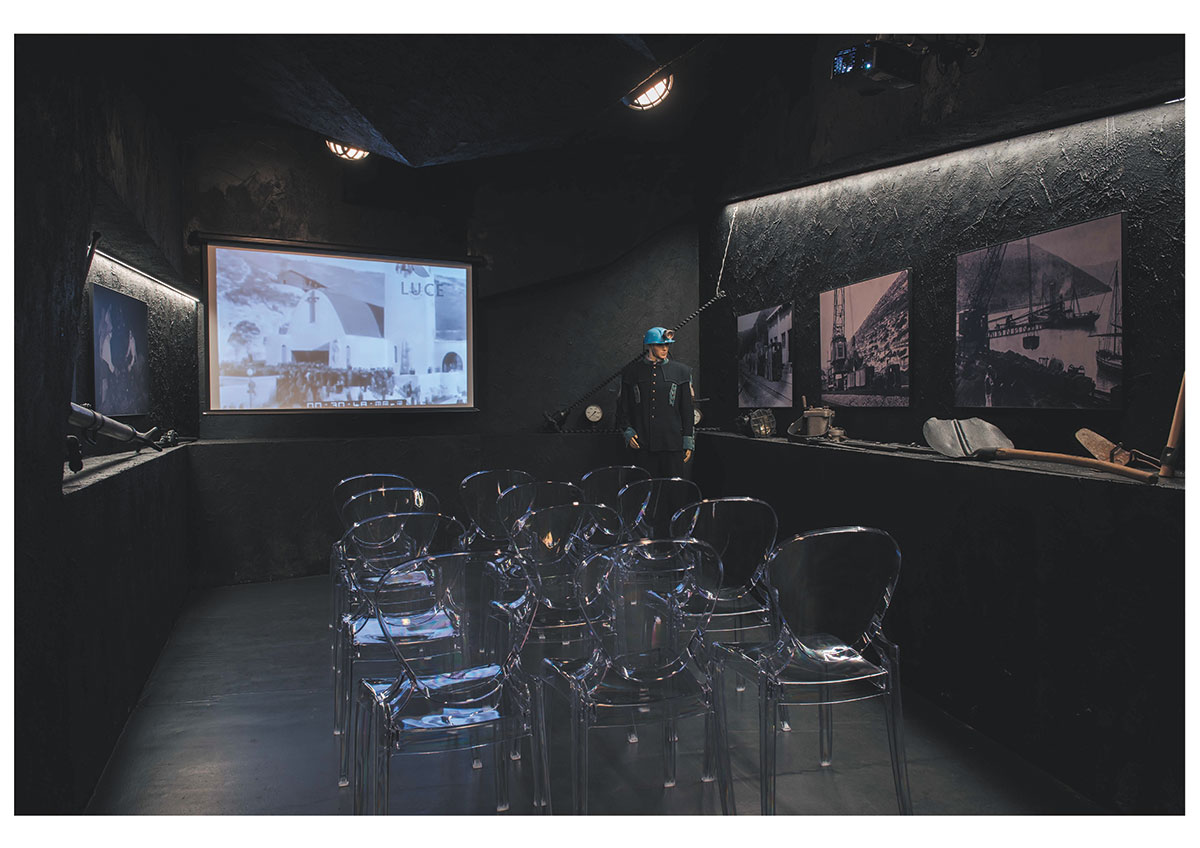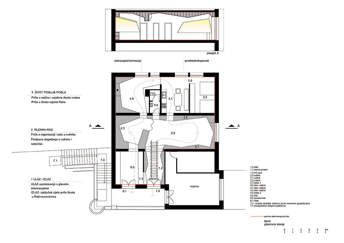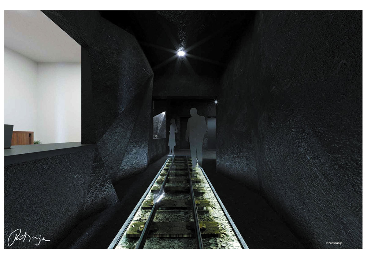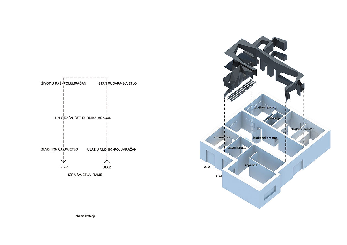 Glavne smjernice prilikom projektiranja prostora u postojećem objektu bile su: maksimalno iskorištavanje zatečenog prostora sa minimalnim rušenjem postojećih zidova; smisleno i sadržajno povezivanje svih prostorija kroz jednu priču -prezentacija rudnika, nekadašnja tehnologija rudarstva; autentičan stan rudara; prezentacija nekadašnjeg života u mjestu; zbivanja i događaji poznatog rudnika u Raši; -suvenirnica za kupnju suvenira. Glavna ideja centra jest ispričati priču života rudara misao vodiljom posao-kuća-posao kroz igru svjetla i tame te života samoga mjesta, osmišljenih kroz 3 cjeline: 1. Glavni ulaz koji asocira polumračni ulaz u rudnik sa zidovima u obliku kamenih stijena te tračnicama koje vode u dubinu rudnika. 2. Rudnik, prostor koji je taman i mračan sa diskretnijim i prigušenijim osvjetljenjem u kojem se nalaze niše, asocija na pukotine stijena odakle je vađen ugljen. U tom su dijelu prezentirani alati, oprema, te cjelokupna organizacija rudnika. 3. Stan rudara koji prezentira prostornu organizaciju i opremljenost, atmosferu i ugođaj doma. Prostor stana sadrži dvije sobe sa skromnim namještajem i rasvjetom. U sljedećoj prostoriji, (dio cijeline 3) se nalaze projekcijski ekrani koji pričaju priču mjesnog života od njegovog nastanka pa do danas. Manja prostorija koja slijedi (dio cijeline 2) je ponovni povratak u rudnik u kojoj se na projekcijskim ekranima prikazuju zbivanja i informacije u samom rudniku Raša, od njegovog razvoja, dostignuća, pa do nesreća i katastrofa. Prostor suvenirnice je zaključak svih cjelina u kojima se mogu kupiti razni autentični suveniri ovoga kraja.