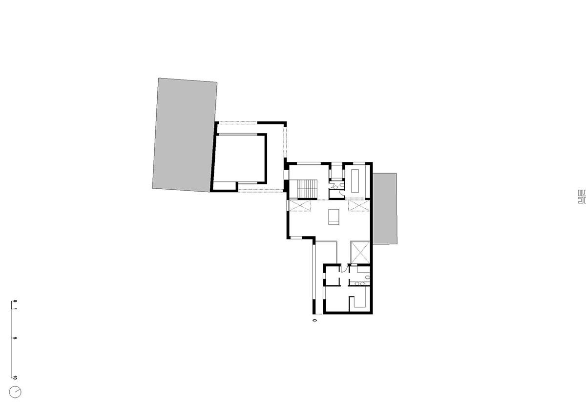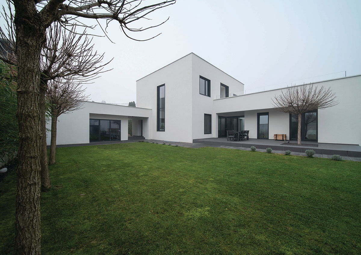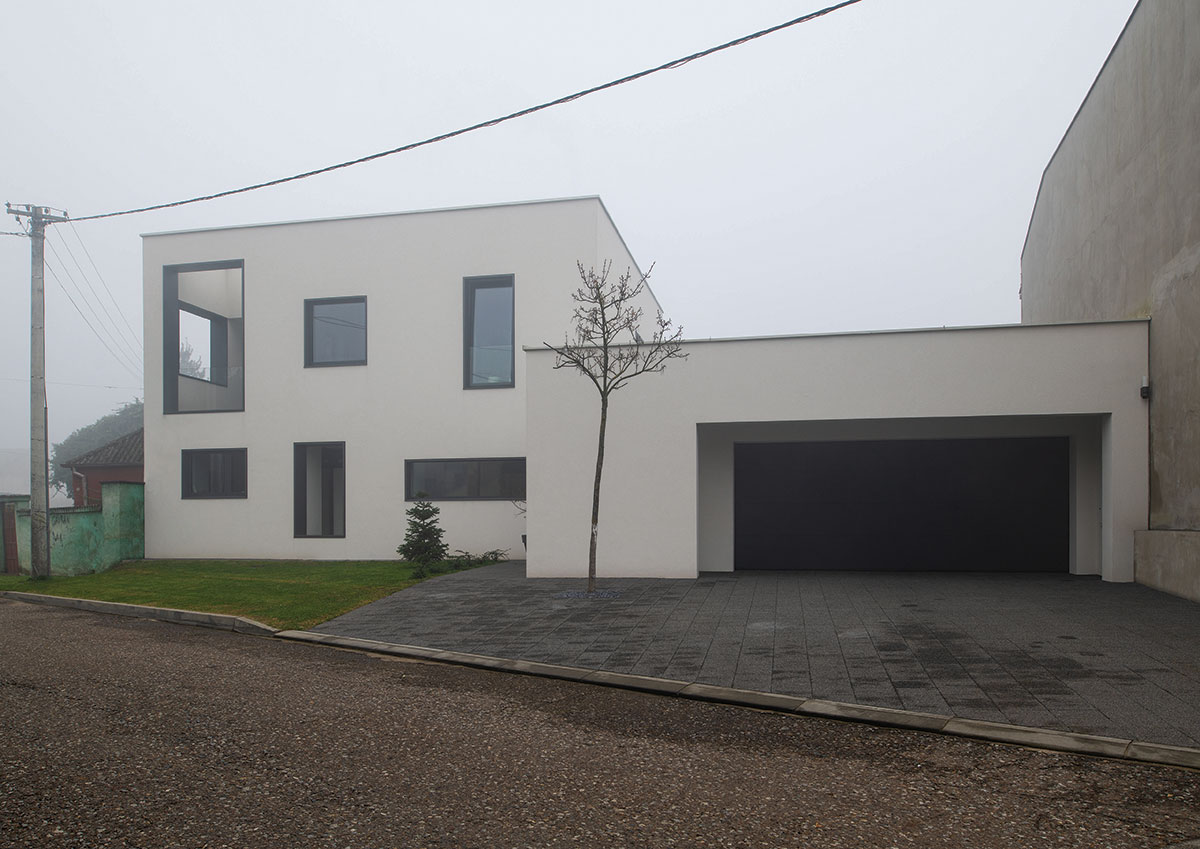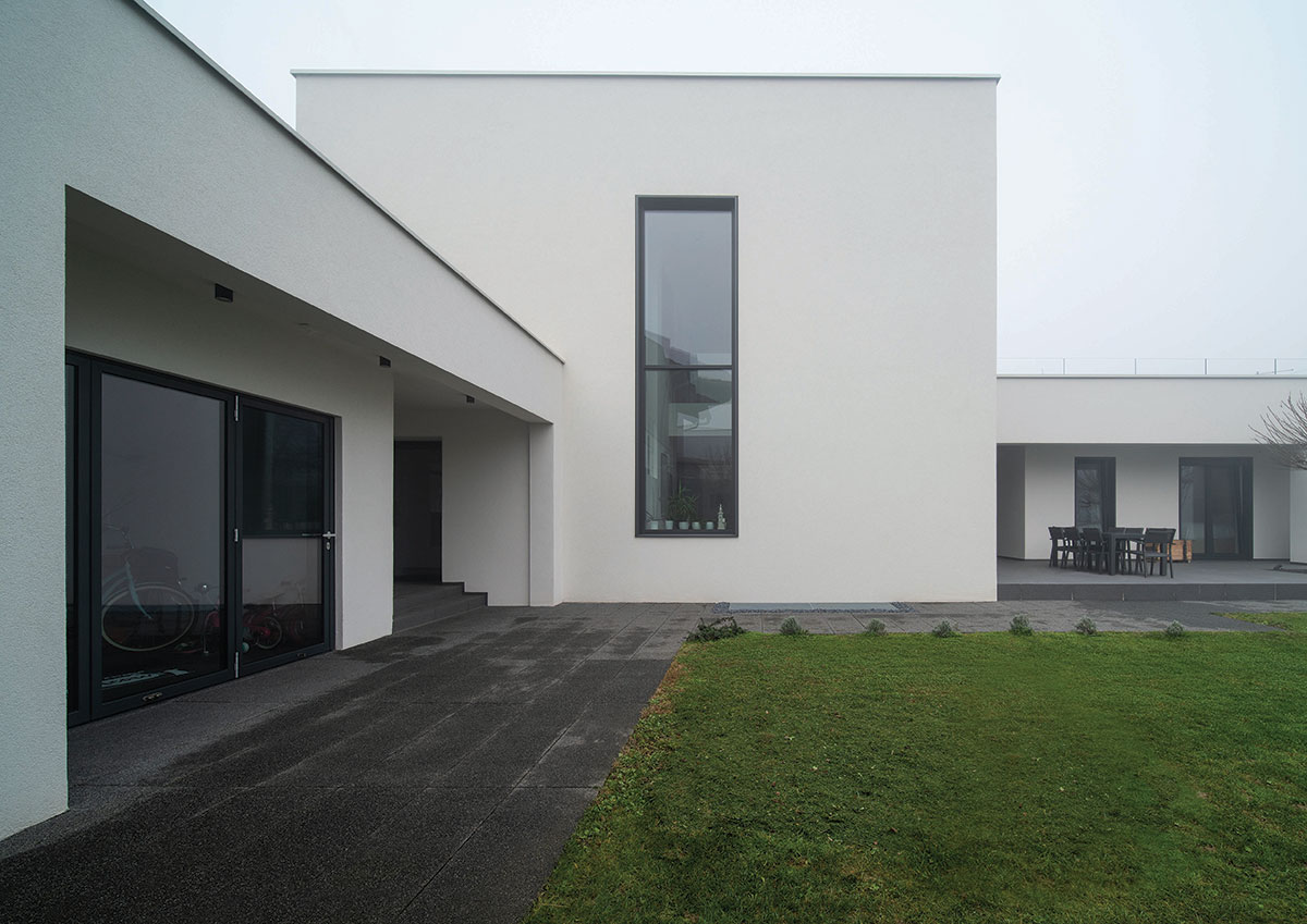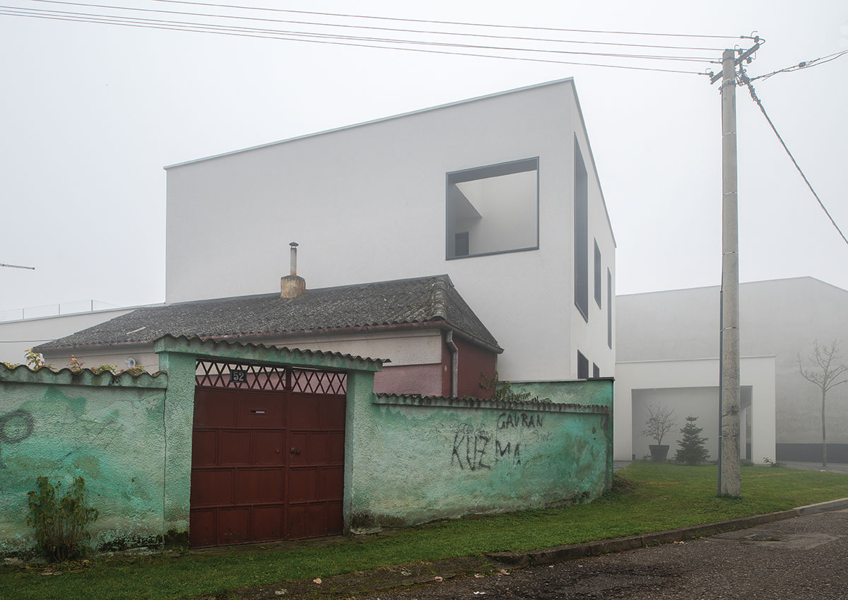 Parcela se nalazi u mirnoj zoni Slavonskog Broda, idealnoj za individualno stanovanje zbog ulice koja nije prometna, te blizine parka sa dječjim igralištem. Međutim, parcela je okružena sa tri strane obiteljskim kućama i pomoćnim gospodarskim zgradama sa dotrajalim ili nikad dovršenim pročeljima. U takvom okruženju, najveći izazov je bio postaviti kuću na parcelu. „L“ oblik kuće prozlazi iz dugotrajnih analiza od kojih je najvažnija bila vezana uz putanju dnevnog svjetla, odnosno kako ostvariti zaštićen a istovremeno bogato osvijetljen prostor. Projektno je rješenje otvaranja dvorišta prema jugu, što dnevnim dijelovima kuće pruža potrebnu privatnost, ali i prirodnu osvijetljenje tokom čitavog dana. Spoj dvaju volumena tvori kuću, od kojih niži (garaža i spremište) zapravo predstavlja dilataciju od visoke i nedovršene susjedne kuće, čija sjena pada sa juga. Glavni i viši volumen utjelovljuje bogat unutrašnji svijet kojeg definiraju tri elementa; stubište sa galerijom, most između dječjih soba te zeleni patio koji odvaja roditeljski dio od dnevnog. Najvažnija funkcija spomenuta tri elementa je da dnevnom boravku, koji ima tlocrtno centralni, i na prvi pogled nepovoljan, položaj, omogući sunčevu svjetlost tokom čitavog dana. Tlocrtni „L“ oblik sakriva dvorište od pogleda s ulice, a volumeni su kubični sa otvorima različitih proporcija. Prozori različitih formata nepravilno poredanih po fasadi novo su viđenje starih ukrasa. Nepravilnost rasporeda tih otvora suvremeni je ornament pročelja, reminiscencija na uzorke tradicijskih horizontalnih i vertikalnih ispupčenja u žbuci. Projektom se također razmatraju dvije važne teme graditeljskoga nasljeđa: tema visokoga uličnog zida s kolnim ulazom i tema natkrivenoga otvorenog trijema, uz ulaz, dnevni boravak i gospodarsku zgradu.