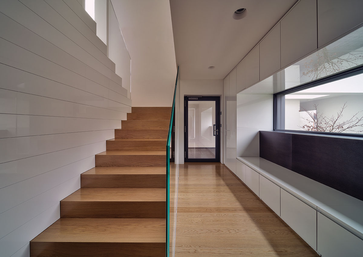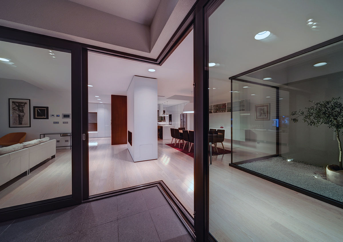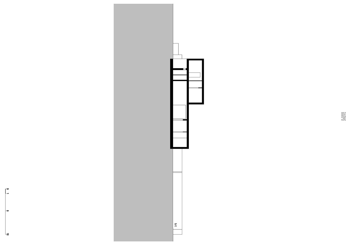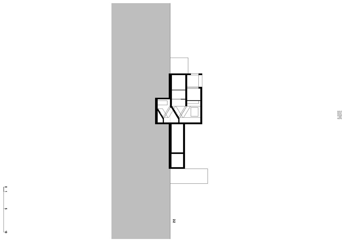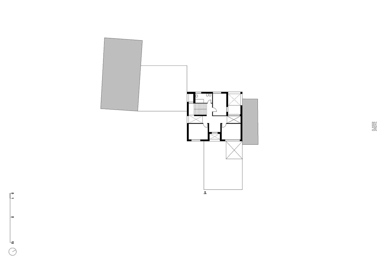 Parcela se nalazi u mirnoj zoni Slavonskog Broda, idealnoj za individualno stanovanje zbog ulice koja nije prometna, te blizine parka sa dječjim igralištem. Međutim, parcela je okružena sa tri strane obiteljskim kućama i pomoćnim gospodarskim zgradama sa dotrajalim ili nikad dovršenim pročeljima. U takvom okruženju, najveći izazov je bio postaviti kuću na parcelu. „L“ oblik kuće prozlazi iz dugotrajnih analiza od kojih je najvažnija bila vezana uz putanju dnevnog svjetla, odnosno kako ostvariti zaštićen a istovremeno bogato osvijetljen prostor. Projektno je rješenje otvaranja dvorišta prema jugu, što dnevnim dijelovima kuće pruža potrebnu privatnost, ali i prirodnu osvijetljenje tokom čitavog dana. Spoj dvaju volumena tvori kuću, od kojih niži (garaža i spremište) zapravo predstavlja dilataciju od visoke i nedovršene susjedne kuće, čija sjena pada sa juga. Glavni i viši volumen utjelovljuje bogat unutrašnji svijet kojeg definiraju tri elementa; stubište sa galerijom, most između dječjih soba te zeleni patio koji odvaja roditeljski dio od dnevnog. Najvažnija funkcija spomenuta tri elementa je da dnevnom boravku, koji ima tlocrtno centralni, i na prvi pogled nepovoljan, položaj, omogući sunčevu svjetlost tokom čitavog dana. Tlocrtni „L“ oblik sakriva dvorište od pogleda s ulice, a volumeni su kubični sa otvorima različitih proporcija. Prozori različitih formata nepravilno poredanih po fasadi novo su viđenje starih ukrasa. Nepravilnost rasporeda tih otvora suvremeni je ornament pročelja, reminiscencija na uzorke tradicijskih horizontalnih i vertikalnih ispupčenja u žbuci. Projektom se također razmatraju dvije važne teme graditeljskoga nasljeđa: tema visokoga uličnog zida s kolnim ulazom i tema natkrivenoga otvorenog trijema, uz ulaz, dnevni boravak i gospodarsku zgradu.